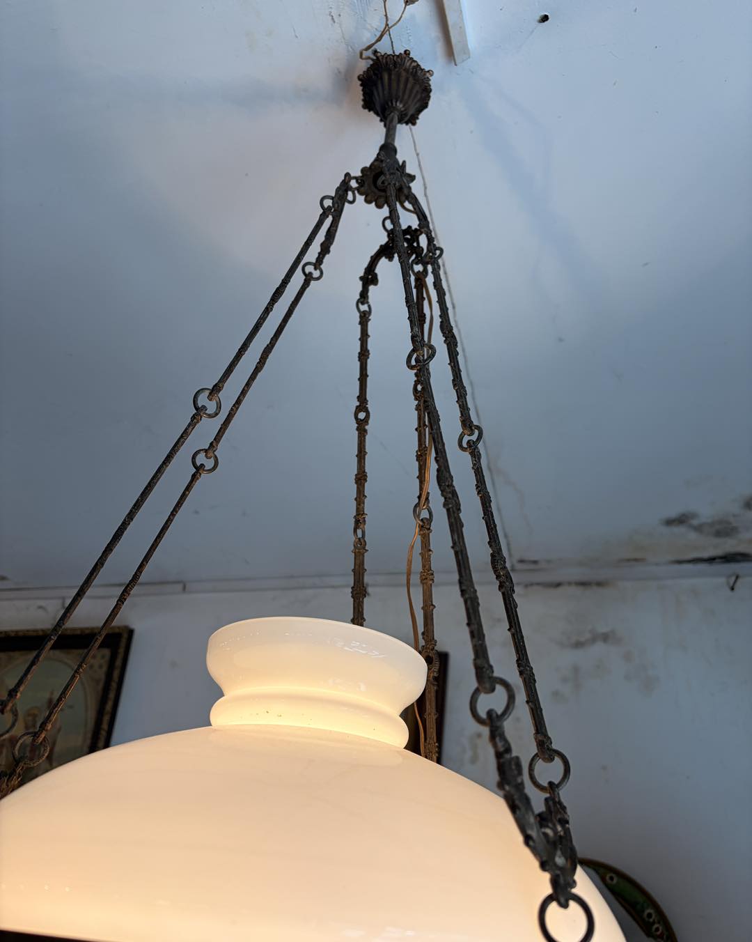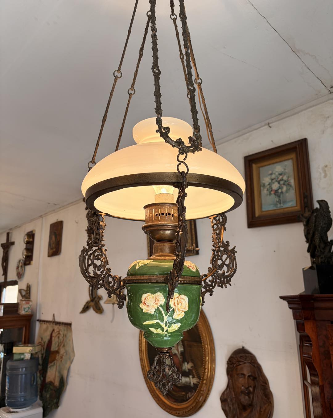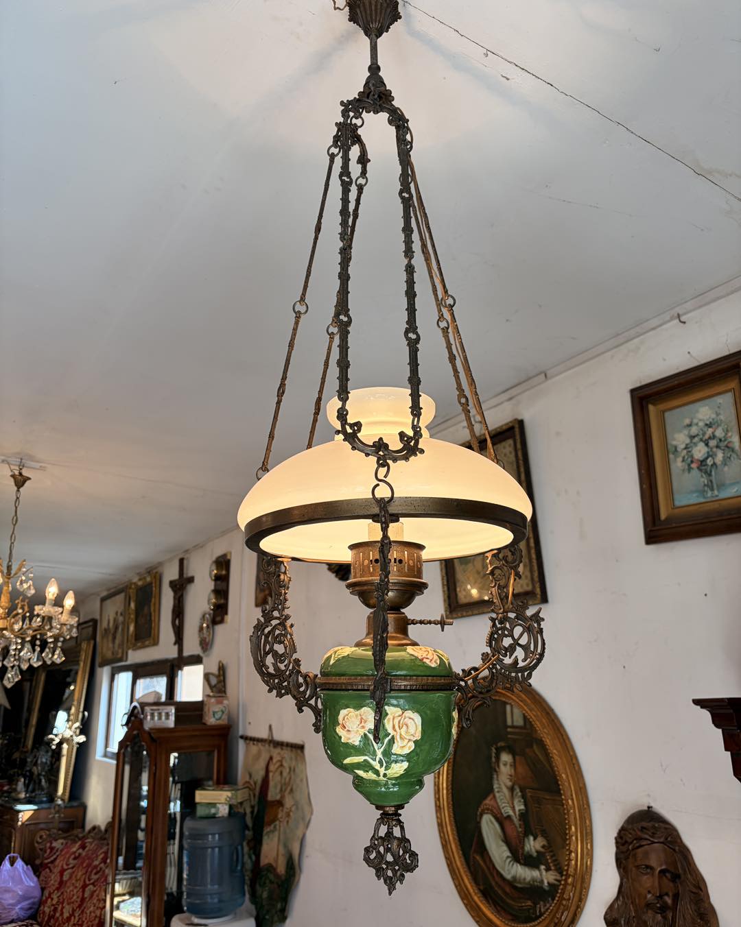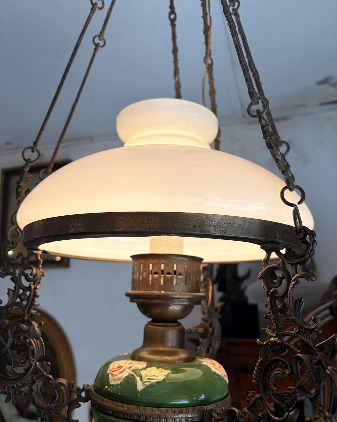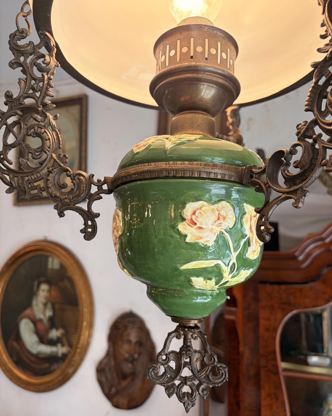 Lampa veche majolica, bronz, sticla opalina ,modificata pe curent electric.