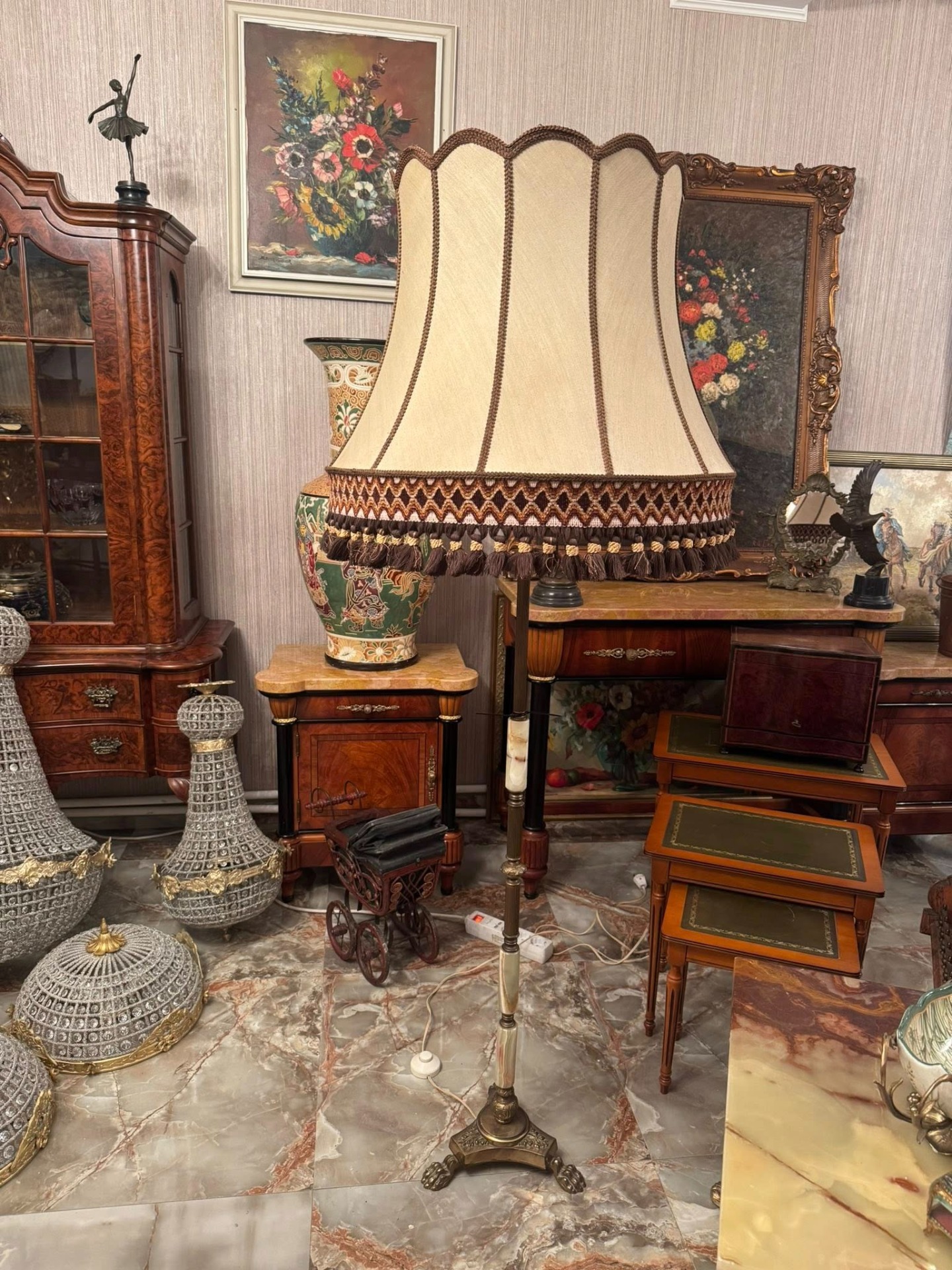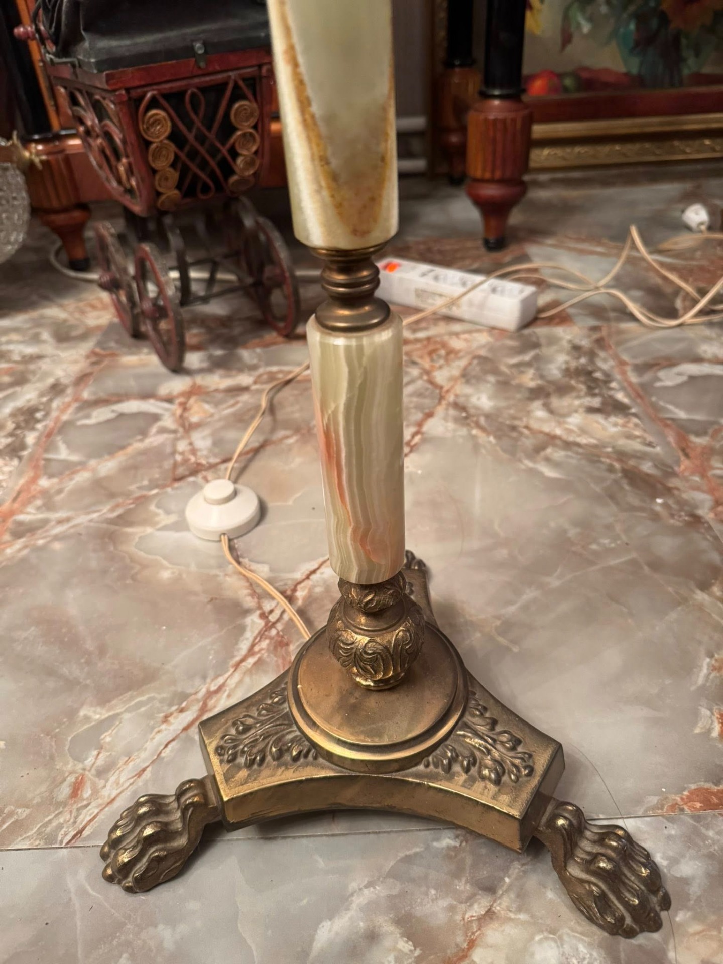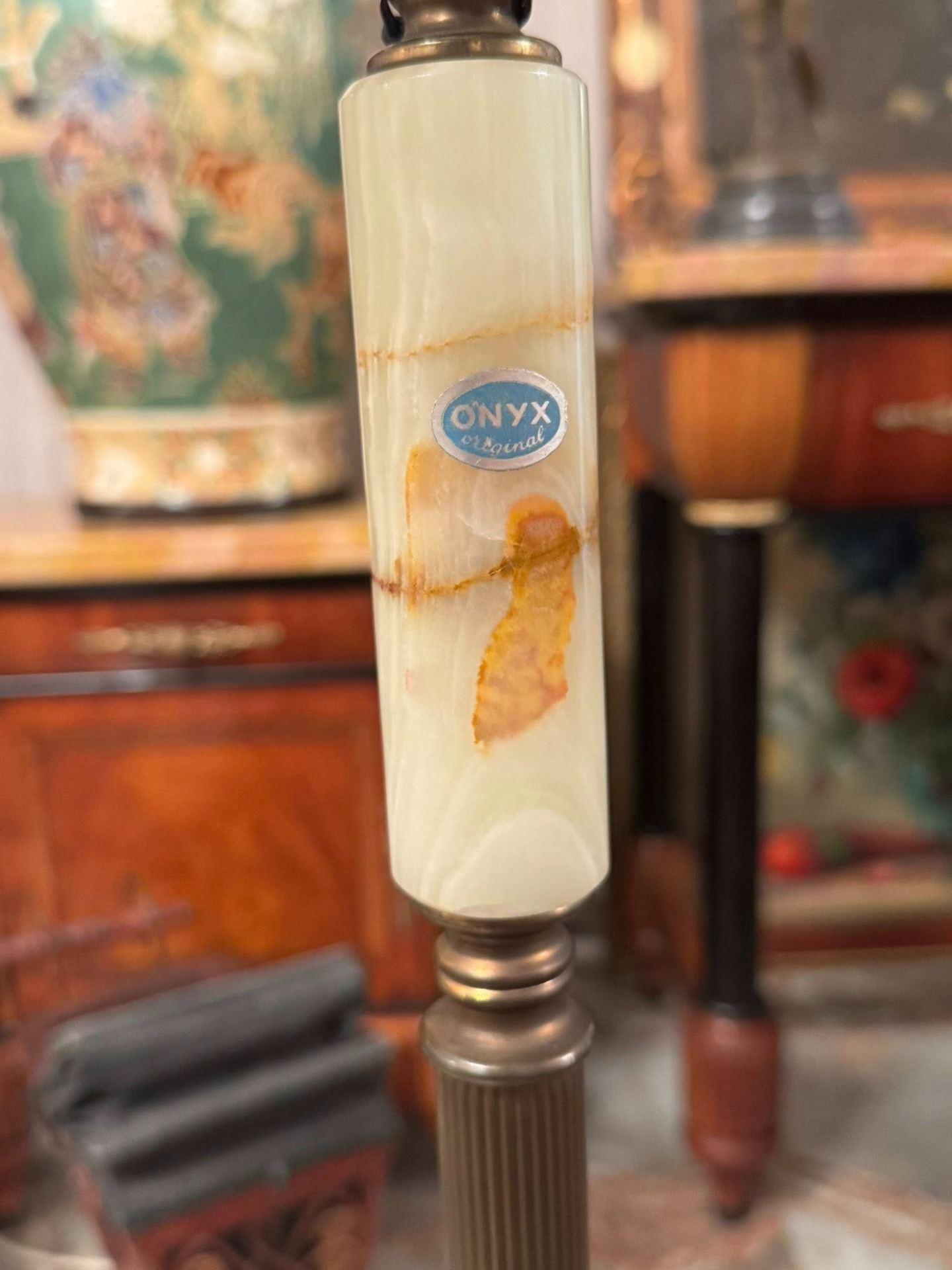 Lampă vintage cu abajur crem, brodat – picior cu detalii din onix