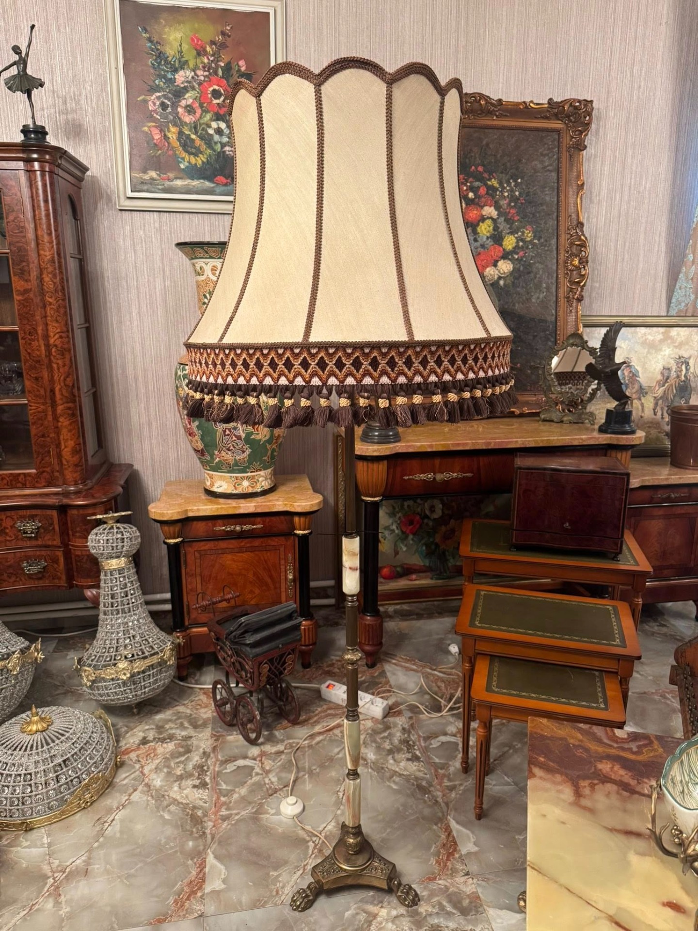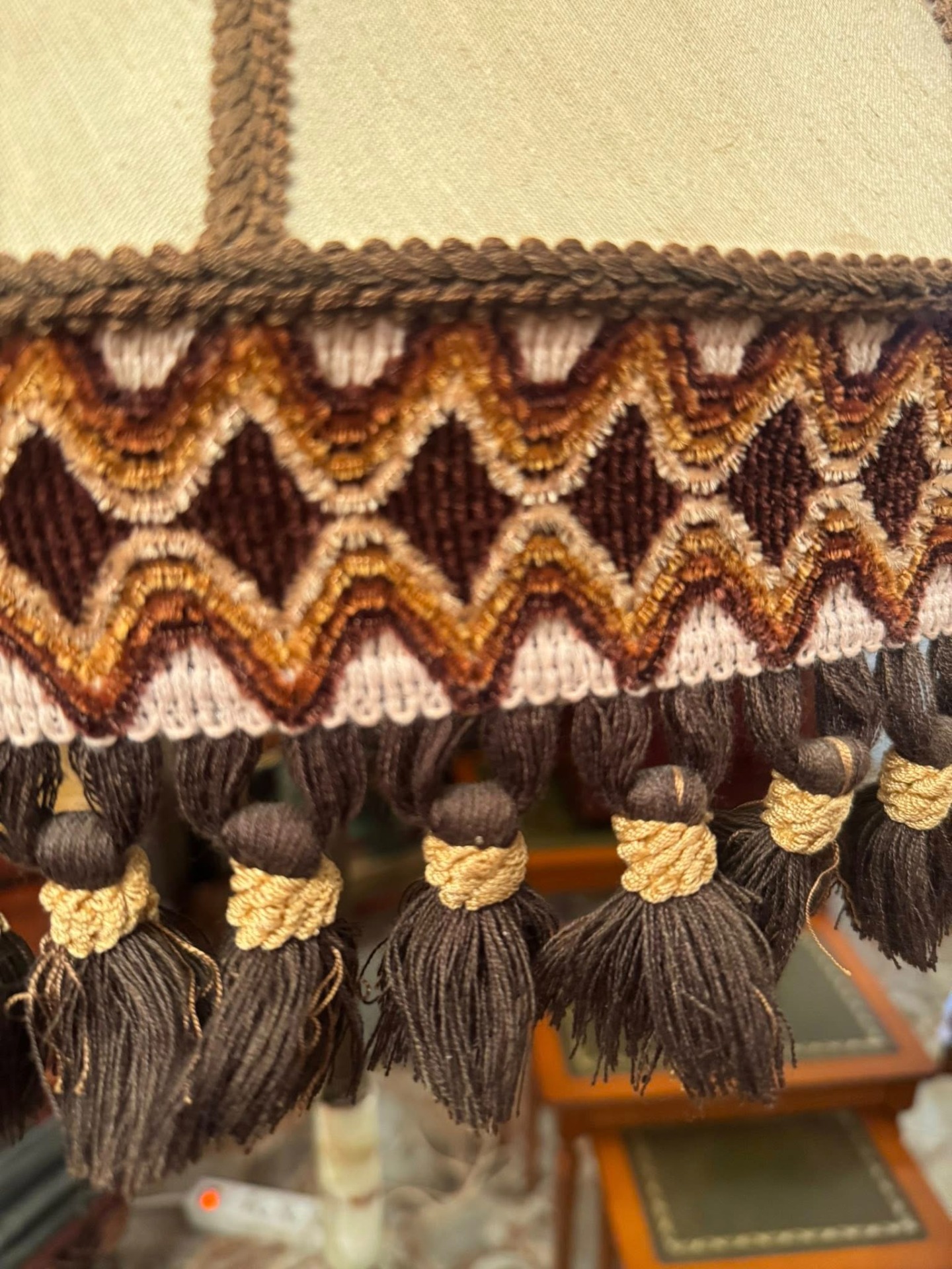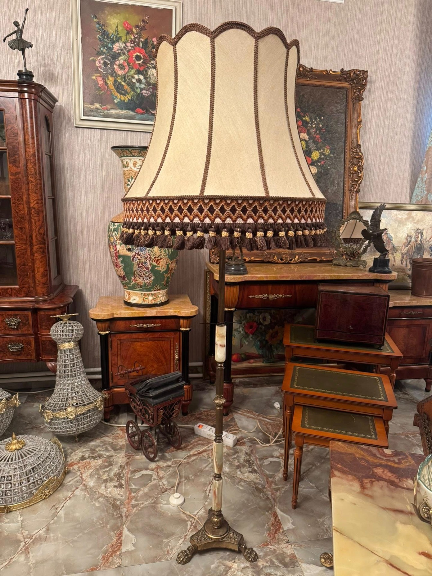 Lampă vintage cu abajur crem, brodat – picior cu detalii din onix