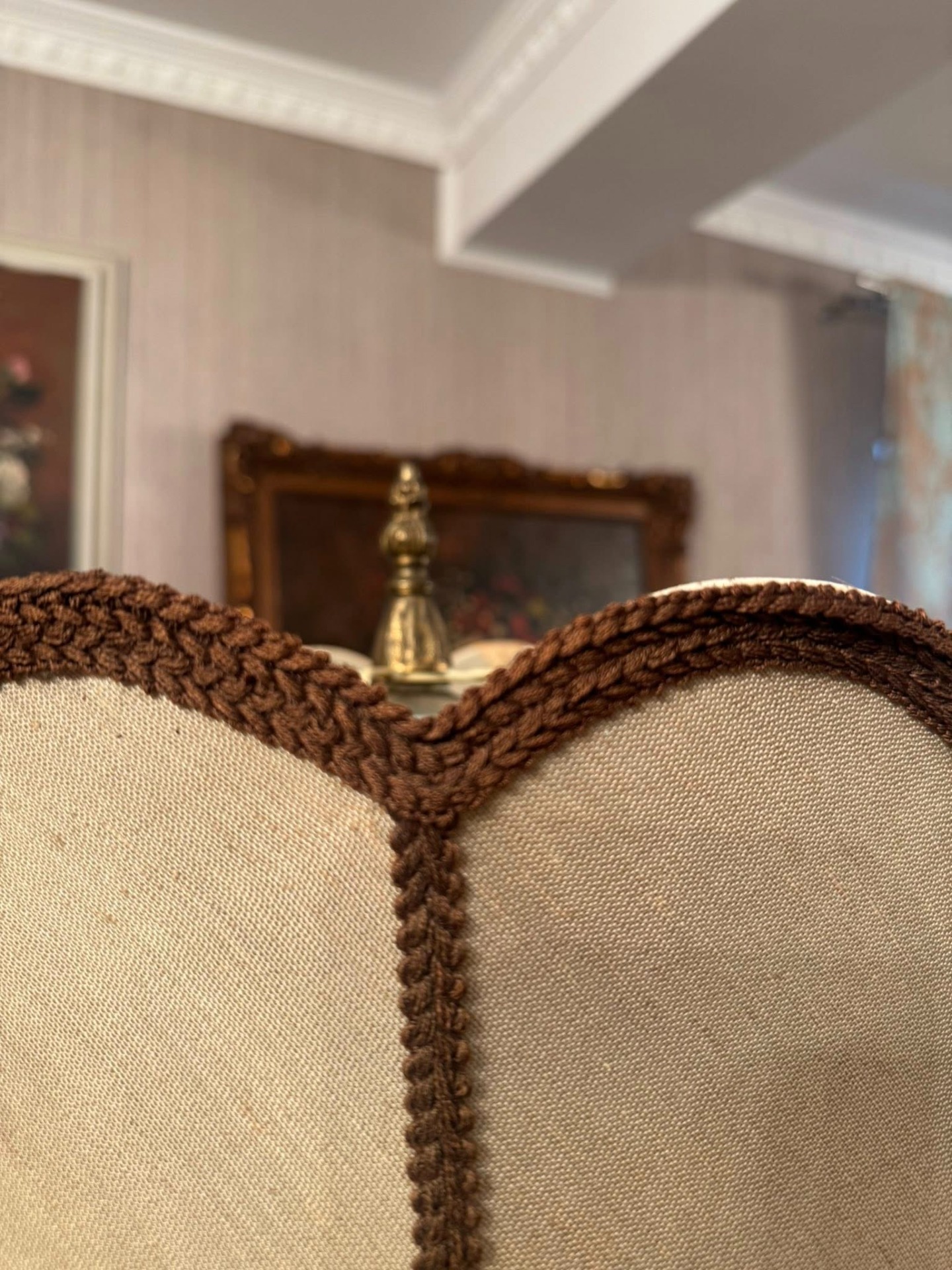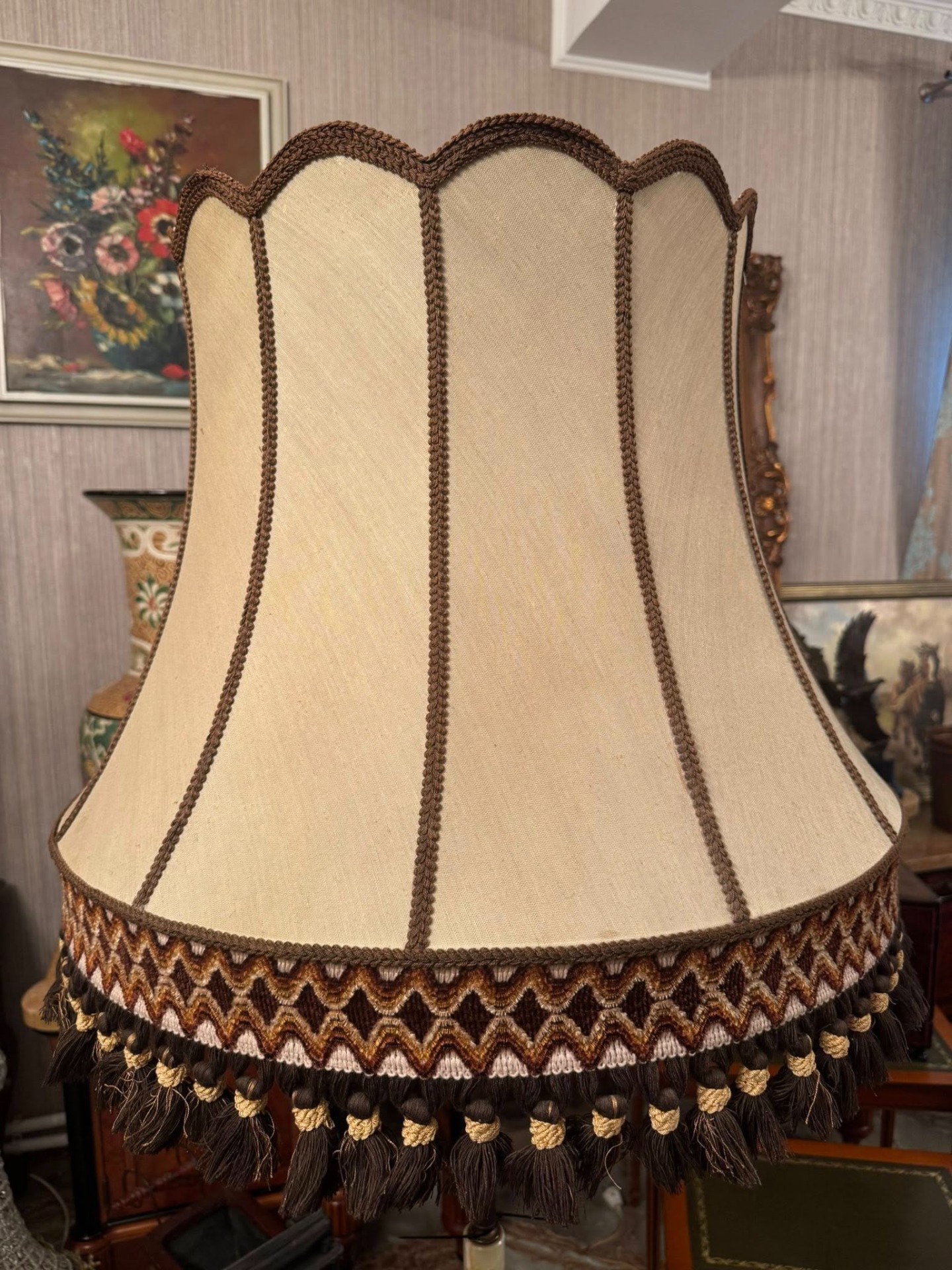 Lampă elegantă, cu abajur crem, decorat cu broderie fină.
