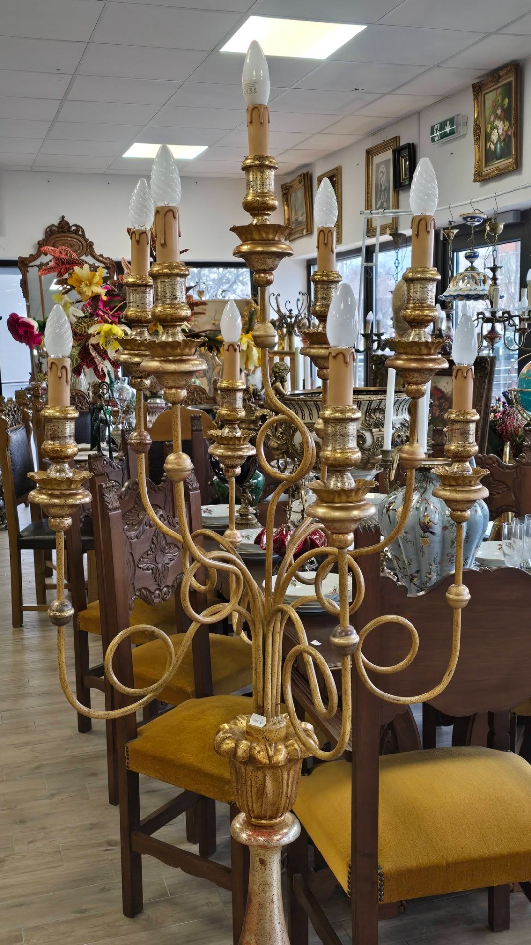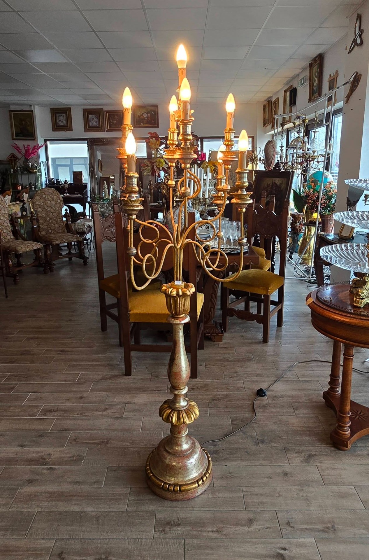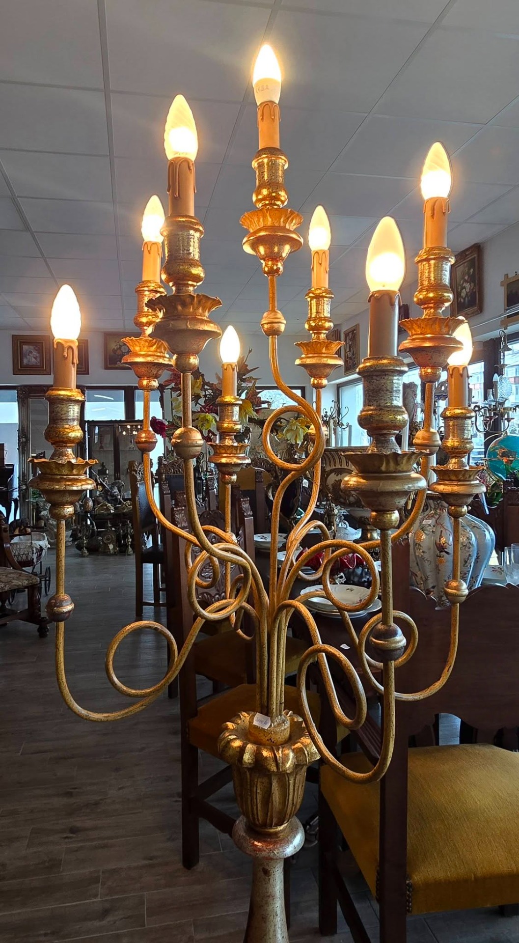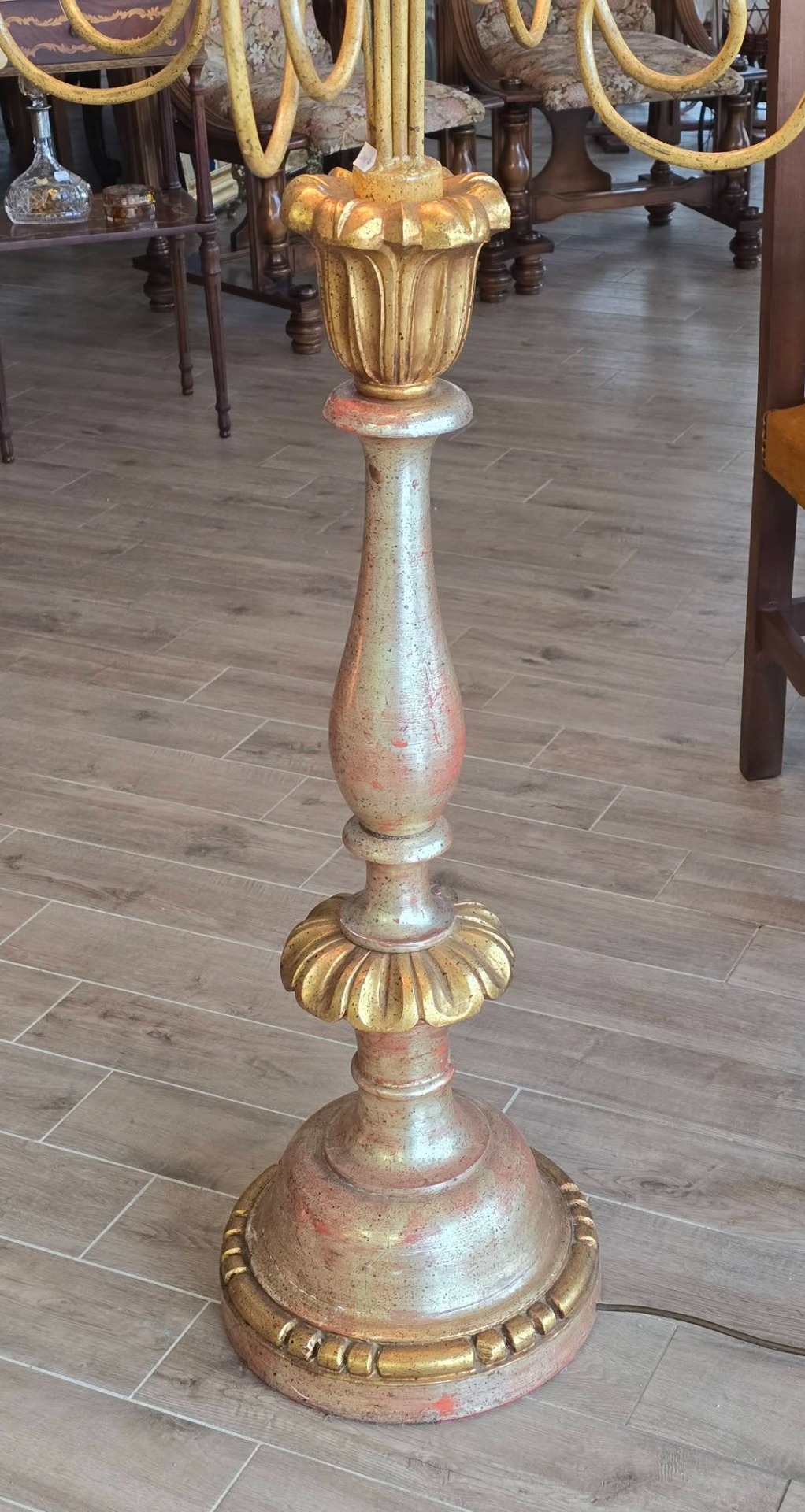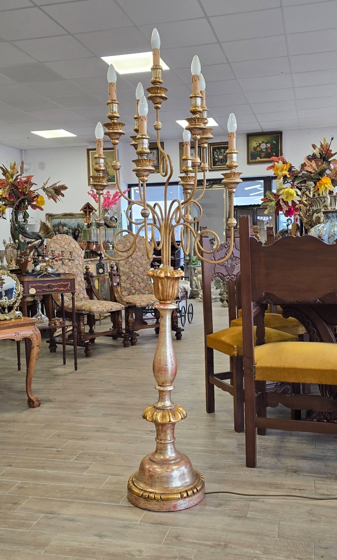 Lampadar de podea deosebit, tip sfeșnic cu 9 brațe cu socluri tip lumânare, realizat în stil Florentin, piesă impunătoare, ideală pentru a adăuga o notă de eleganță și rafinament oricărui interior clasic sau shabby chic, cu picior din lemn masiv strunjit și brațe metalice cu forme sinuoase, policromie cu combinație de auriu (foiță) și accente argintii/roșiatice, cu o patină superbă care îi conferă caracter.