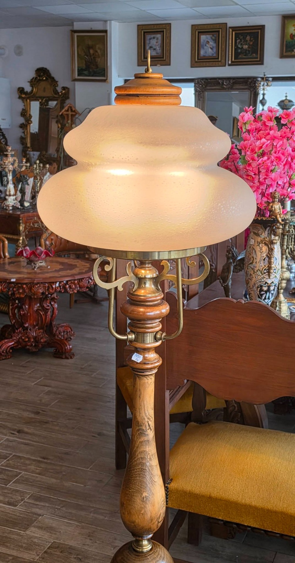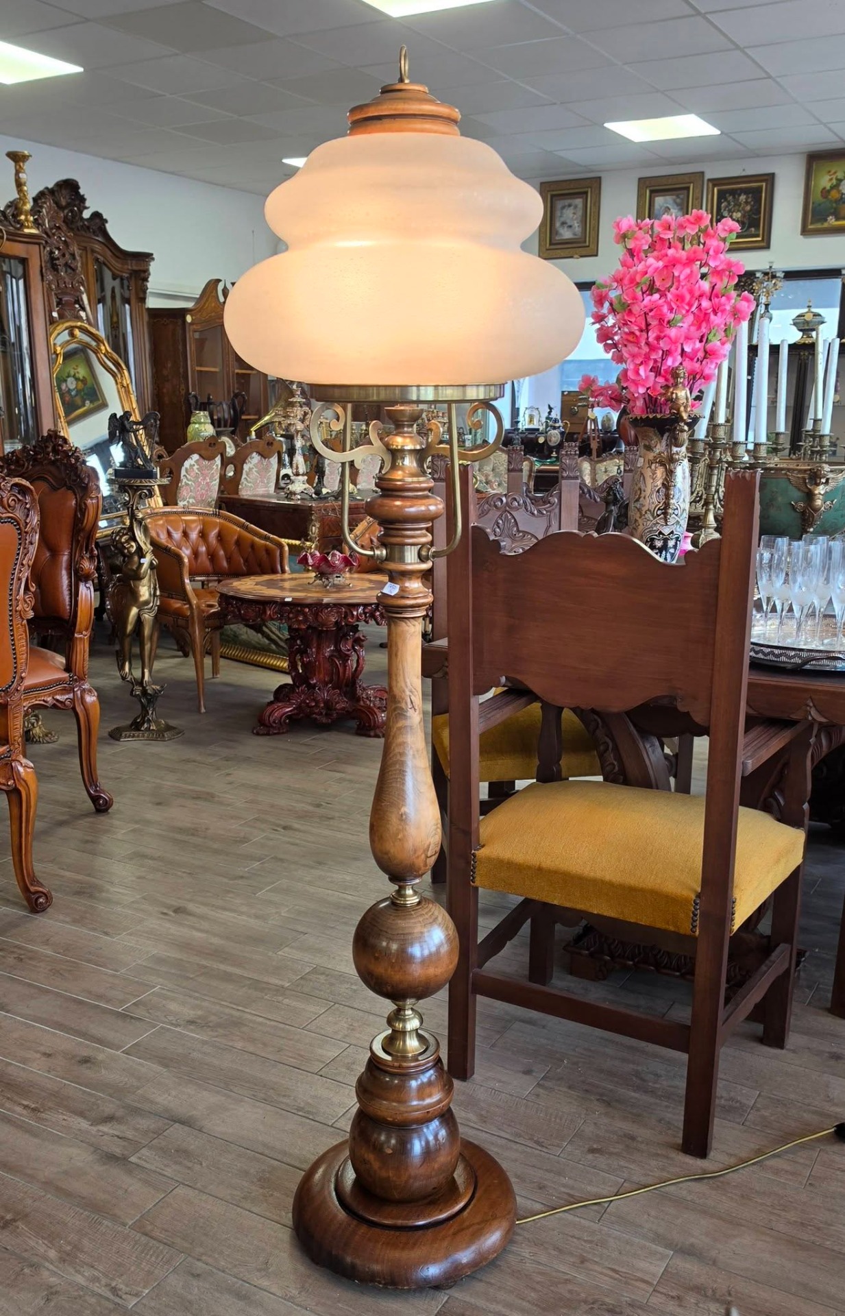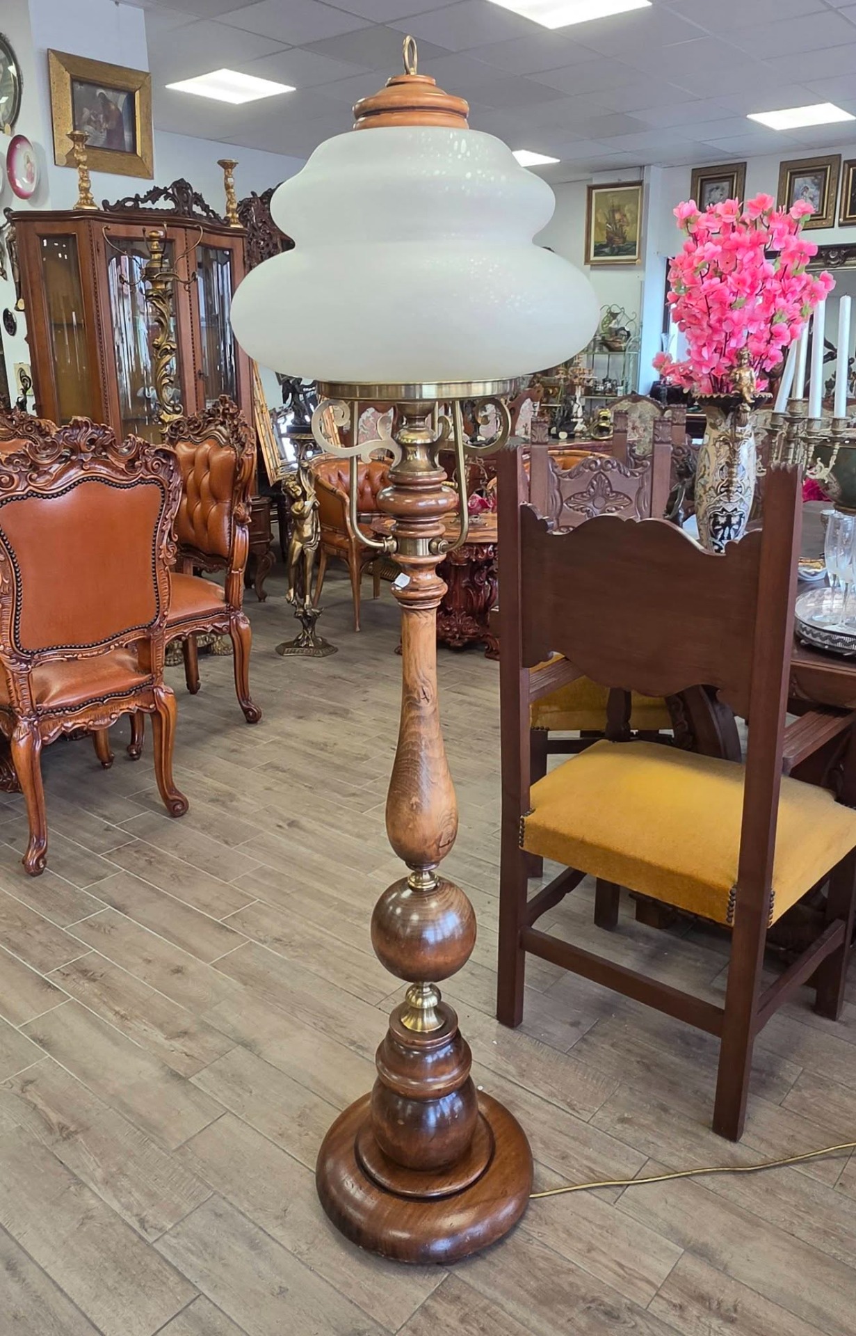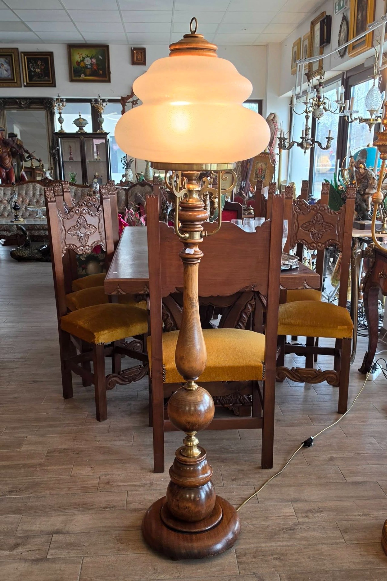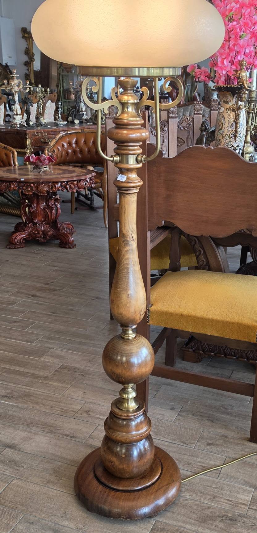 Lampadar (lampă de podea) deosebit, în stil vintage-european, cu coloană realizată din lemn masiv strunjit, cu o textură naturală superbă și finisaje fine, cu îmbinări și brațe decorative din alamă, care oferă un contrast rafinat cu lemnul închis la culoare, cu abajur-cupolă din sticlă opalină mată, ușor granulată, care difuzează lumina într-un mod relaxant și uniform, cu formă etajată de inspirație Art Deco.