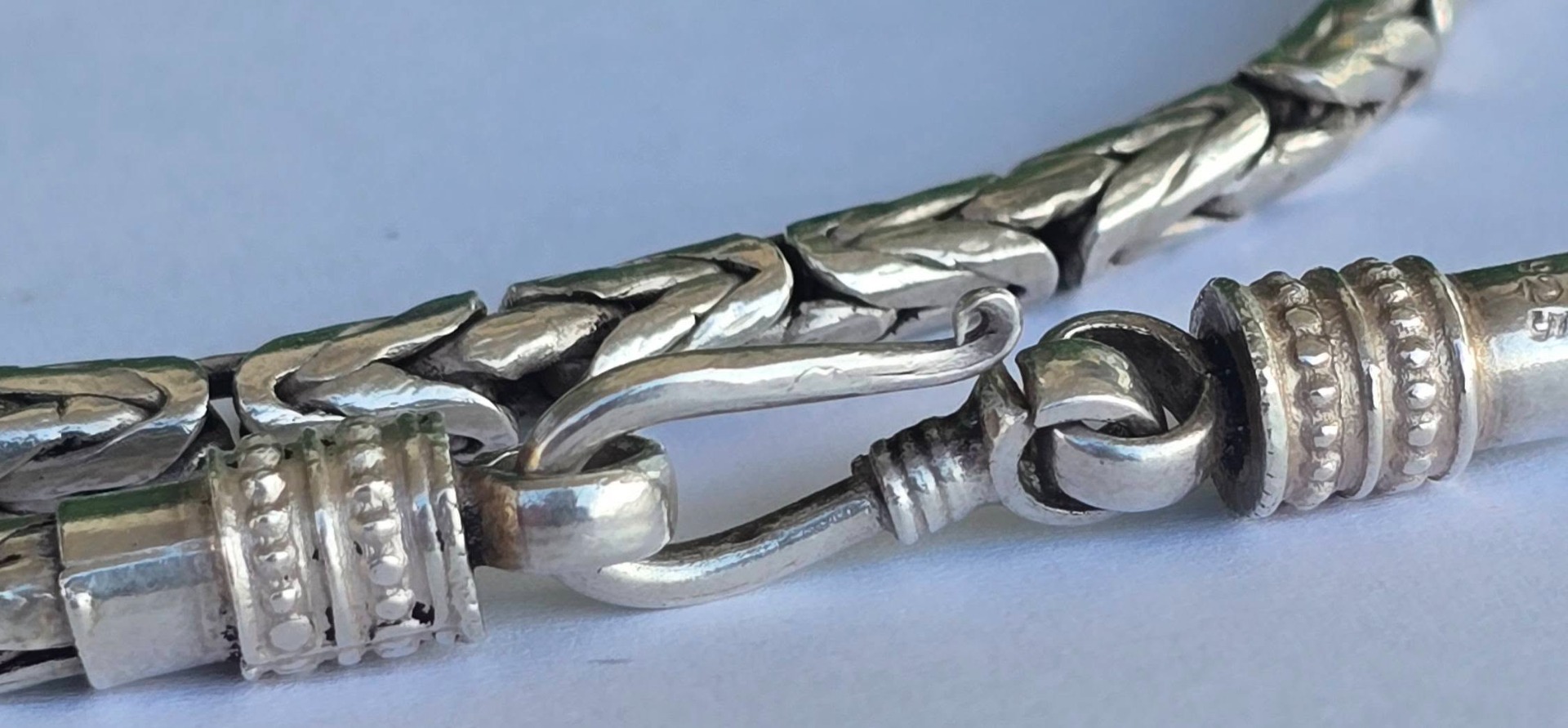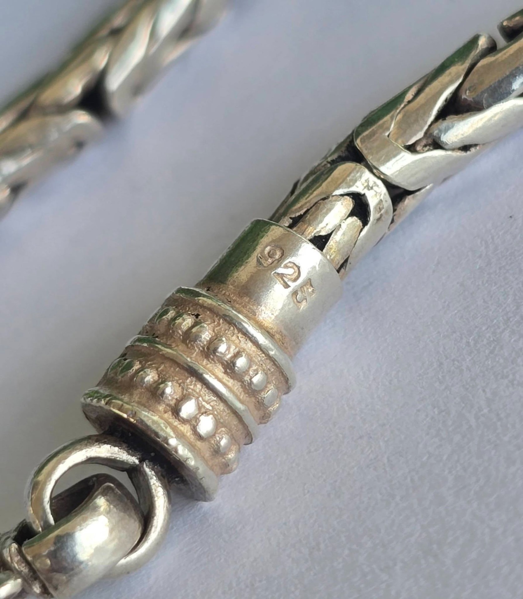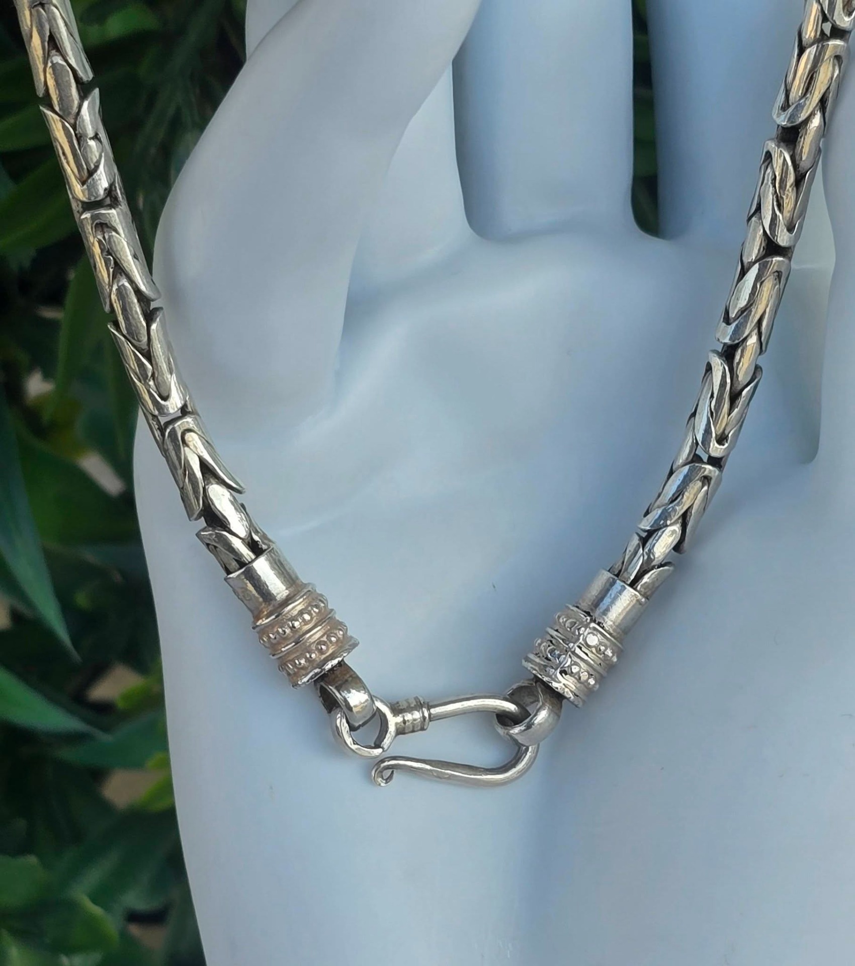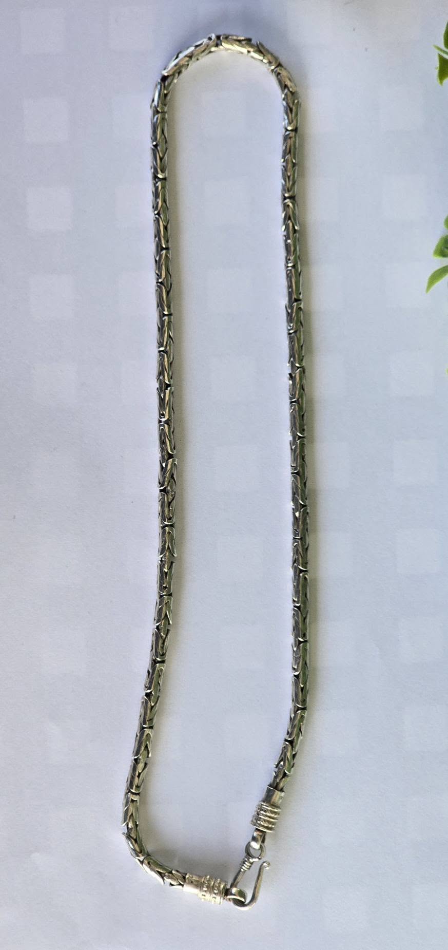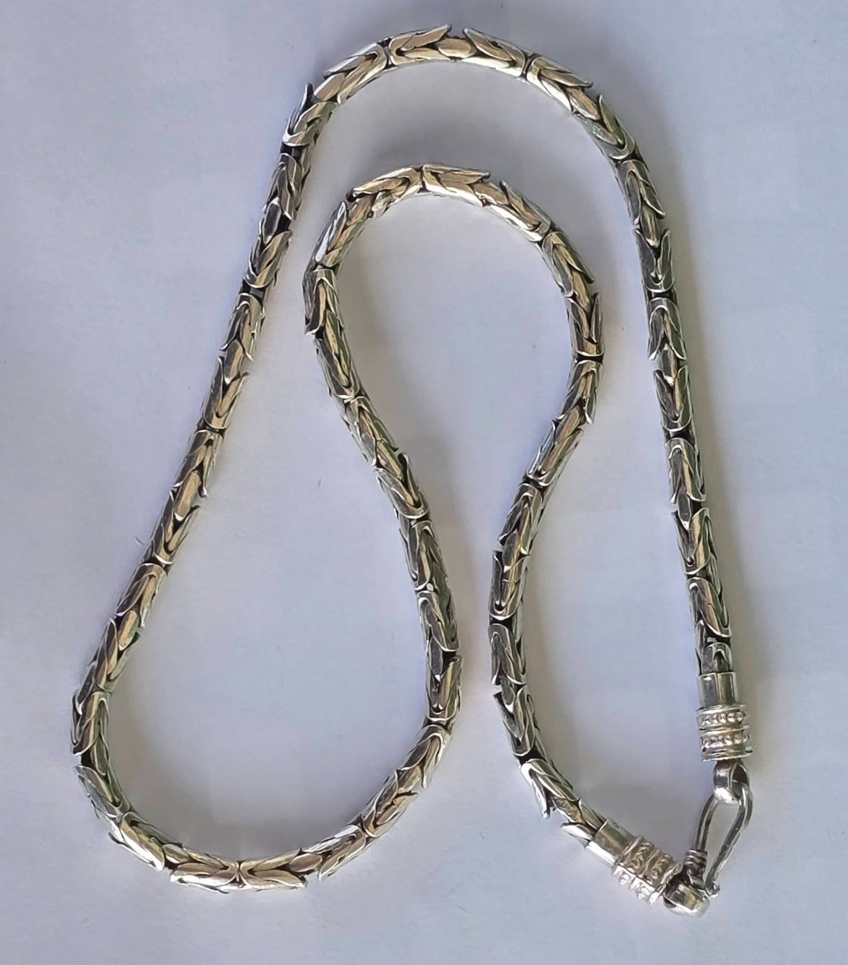 Lanț balinez vechi, din argint, cu împletitură în stil bizantin, cunoscută și ca "bird's cage" (colivie de pasăre), cu structură tridimensională asemănătoare unei frânghii (anii 1980-1990, Bali, Indonezia).