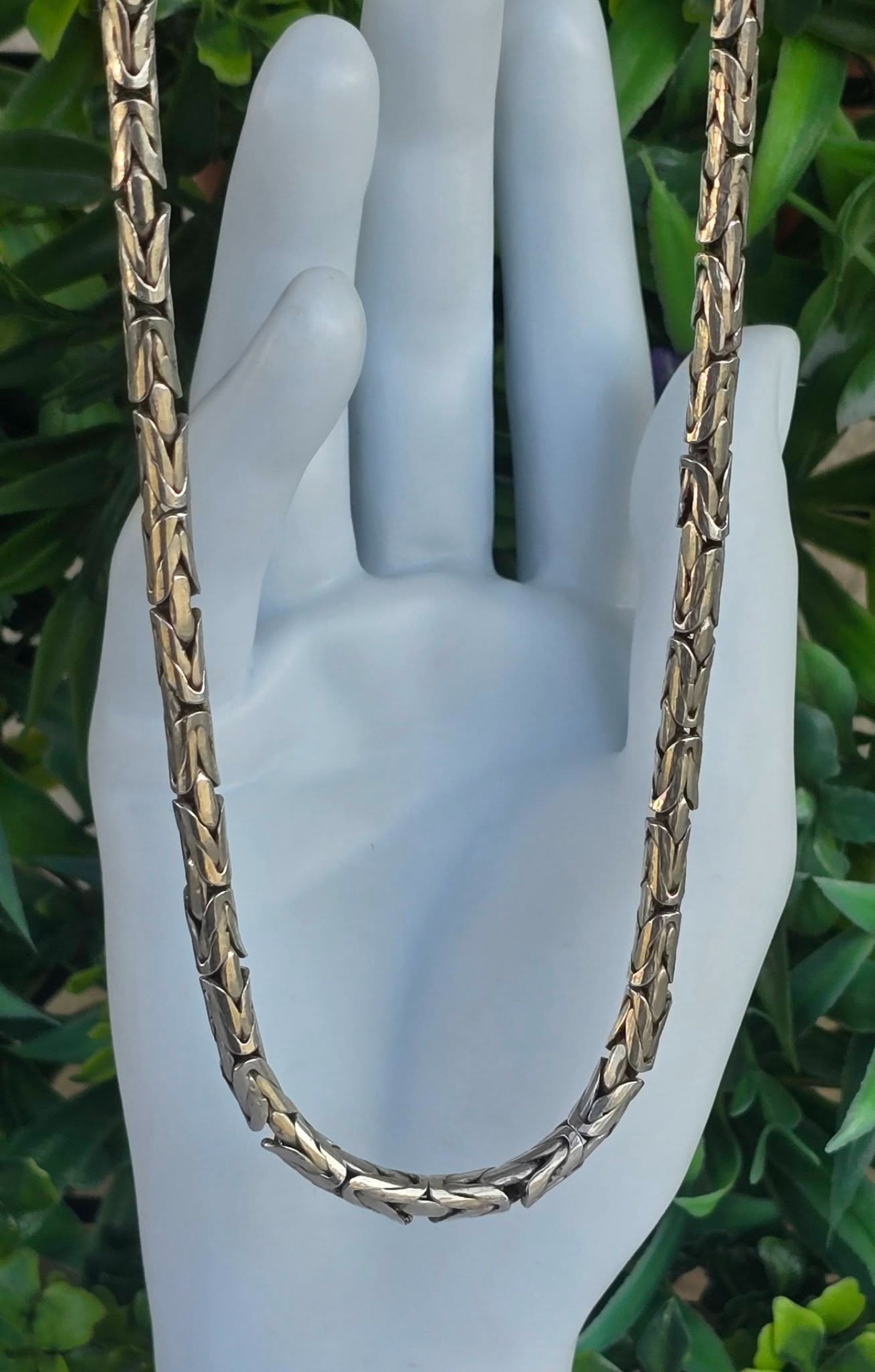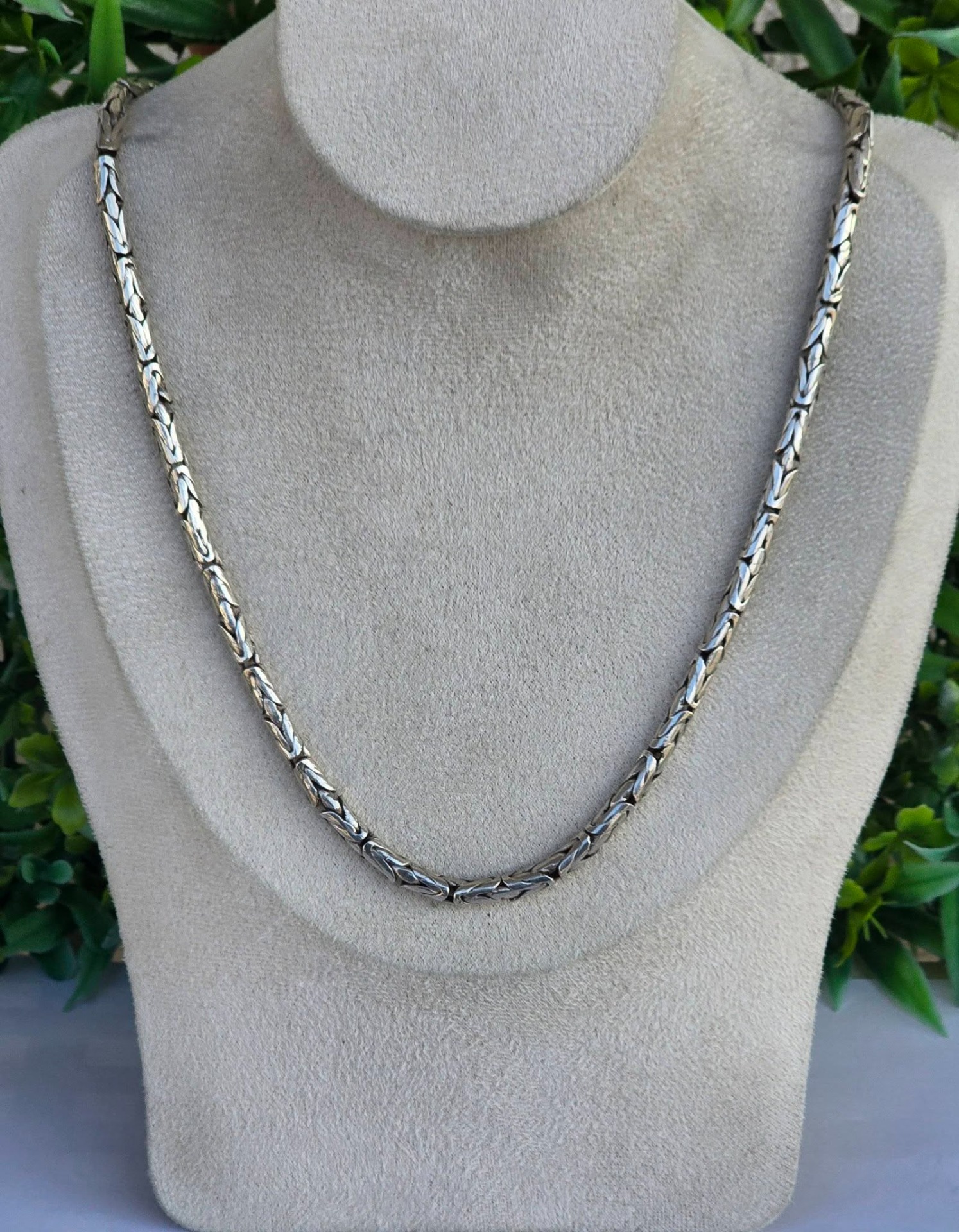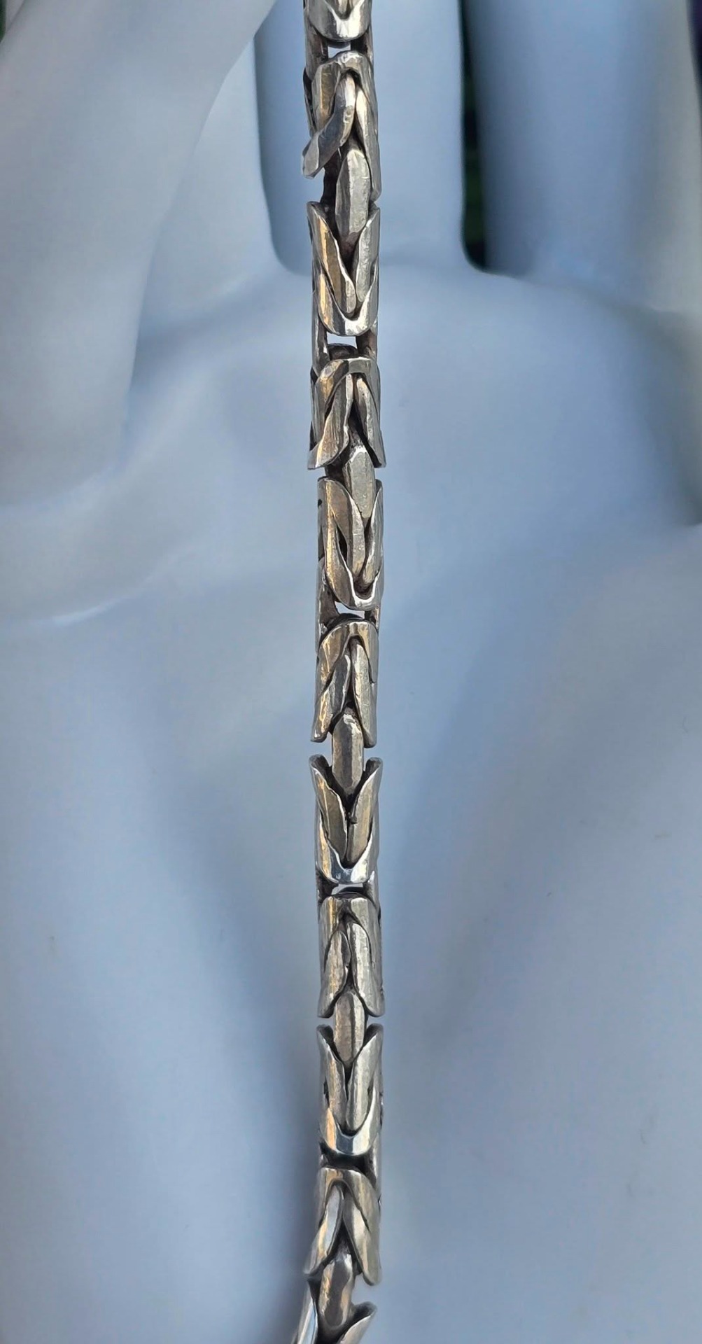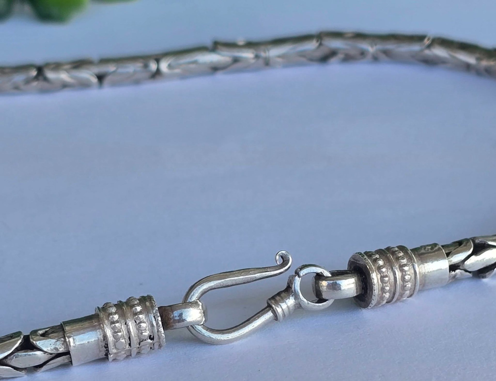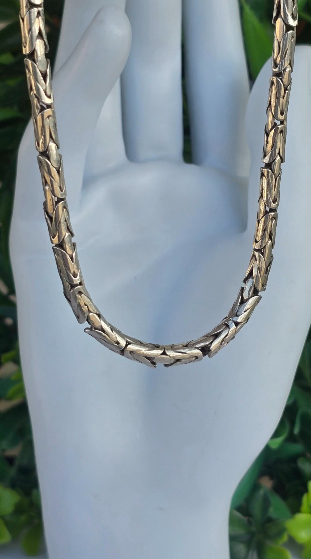 Lanț balinez vechi, din argint, cu împletitură în stil bizantin, cunoscută și ca "bird's cage" (colivie de pasăre), cu structură tridimensională asemănătoare unei frânghii (anii 1980-1990, Bali, Indonezia).