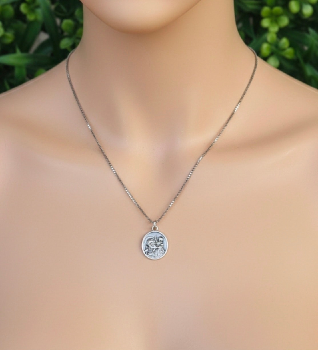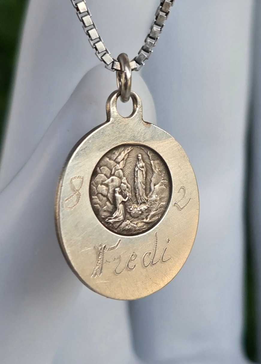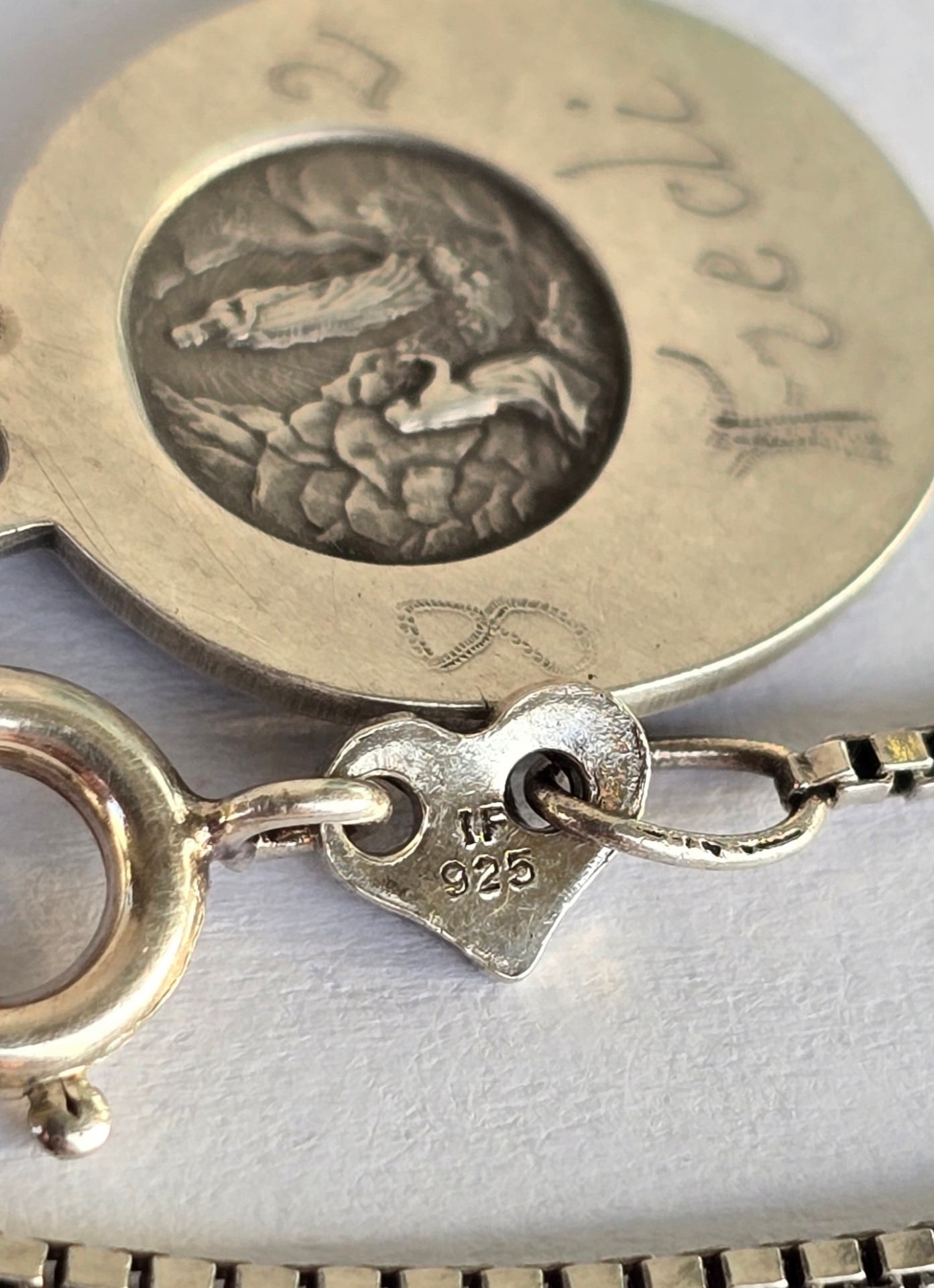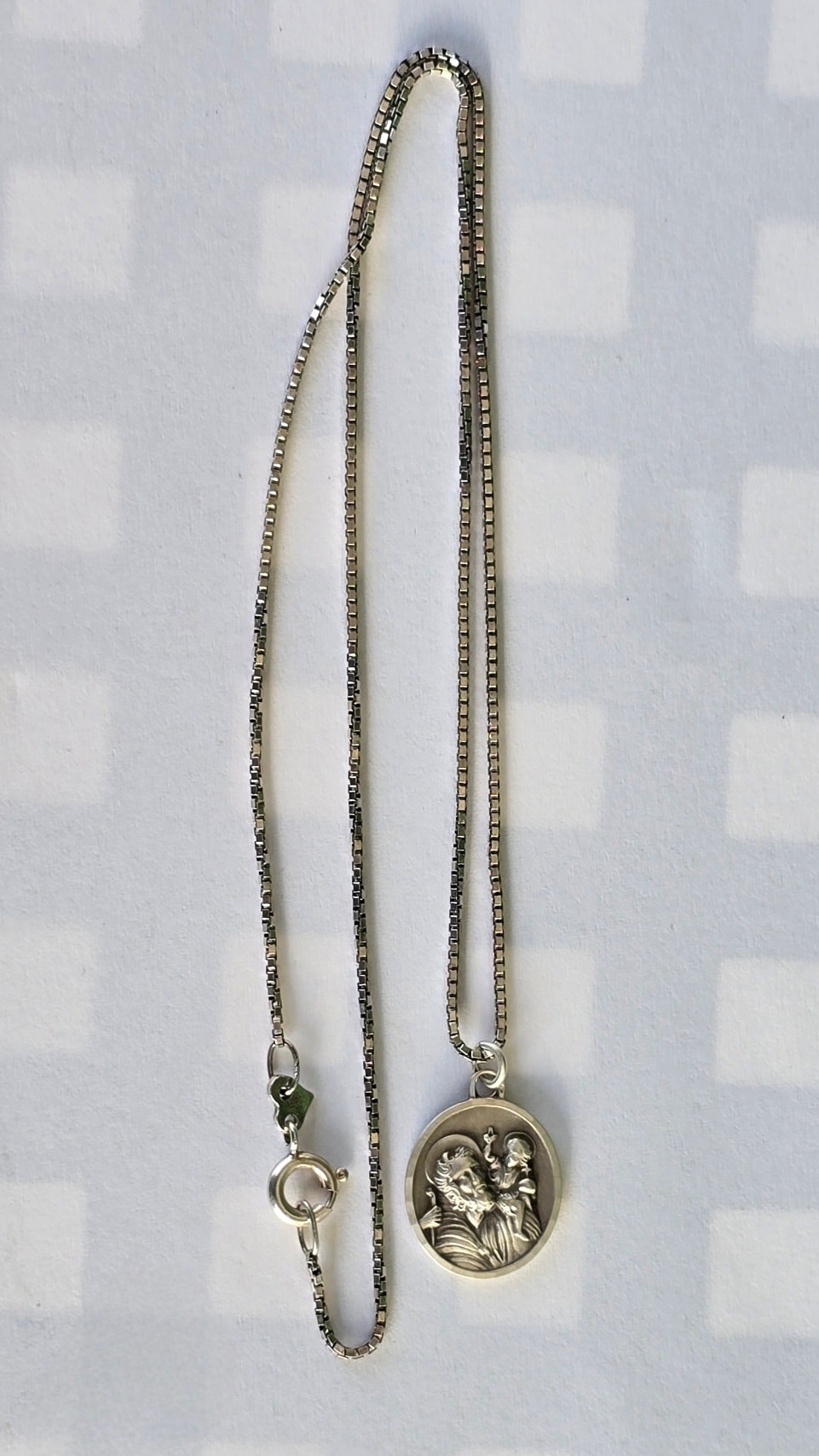 Lanț cu medalion religios vechi, din argint, cu dublă simbolistică, pe față cu Sf.Cristofor (St.Christopher), protector al călătorilor, iar pe verso cu"Maica Domnului de la Lourdes", manufactură cu detalii frumos lucrate în basorelief.