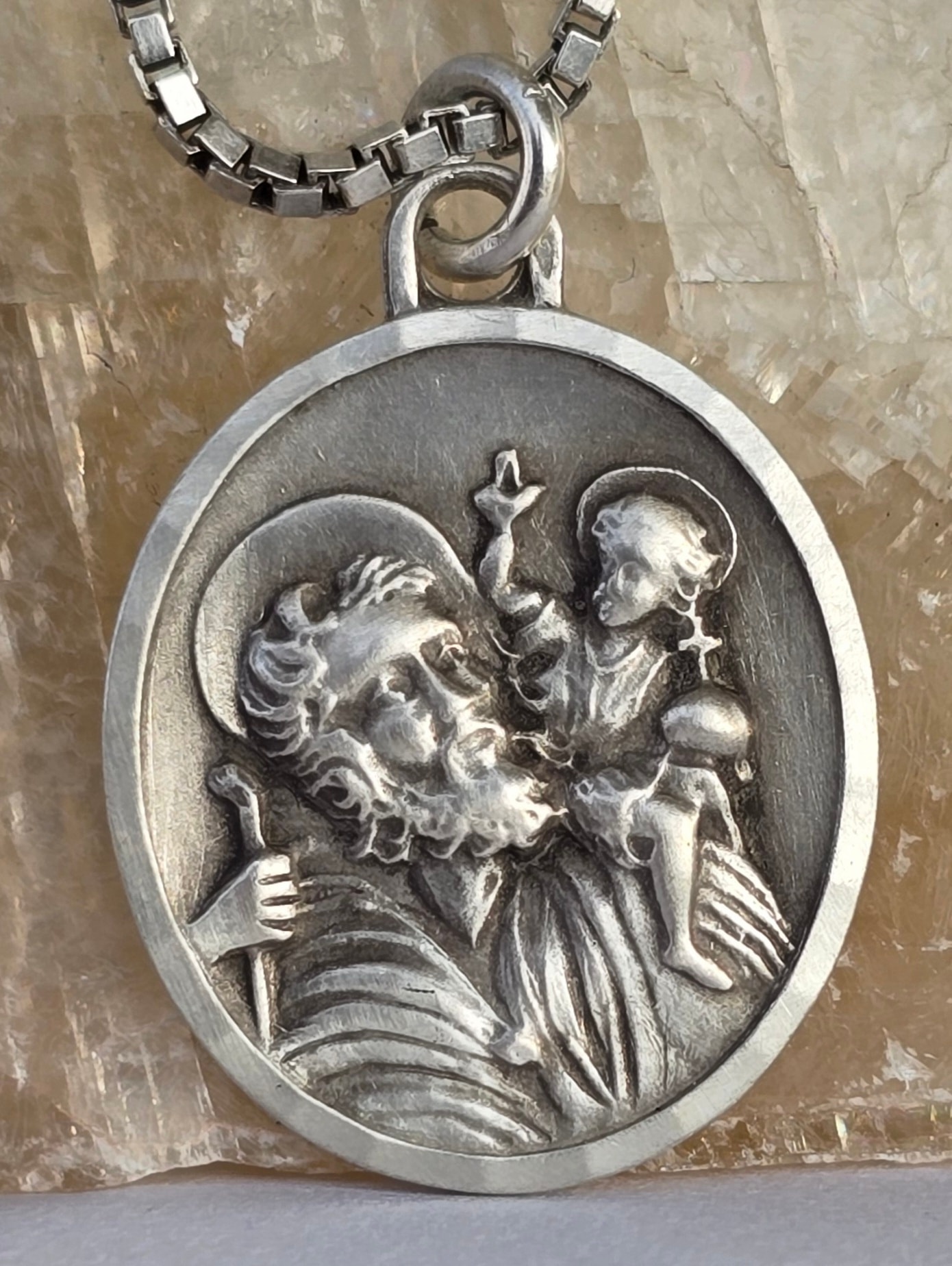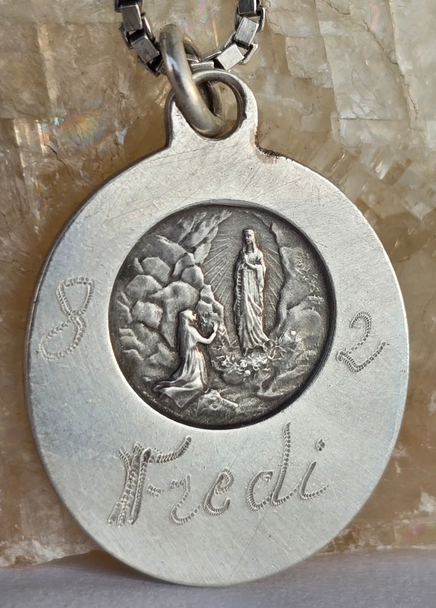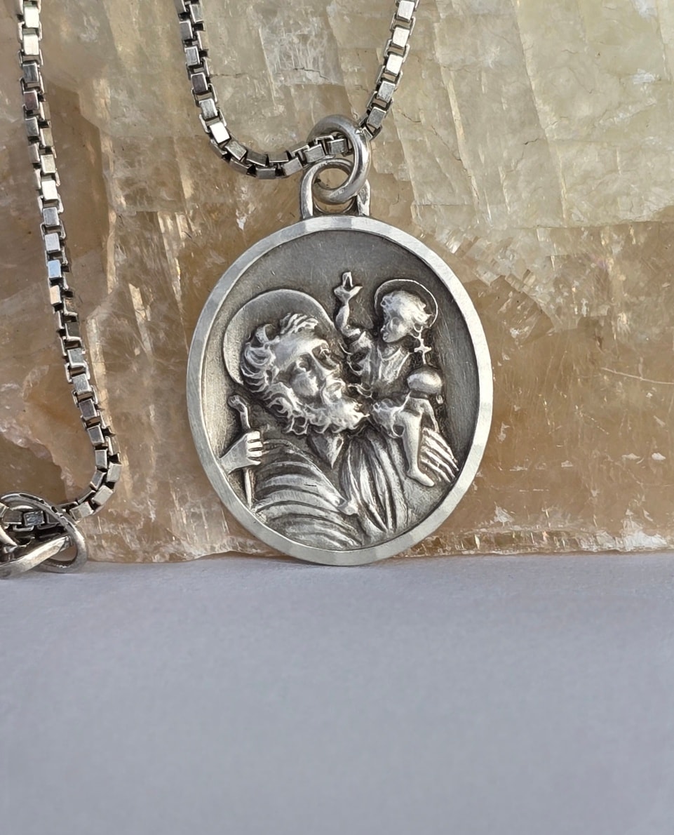 Lanț cu medalion religios vechi, din argint, cu dublă simbolistică, pe față cu Sf.Cristofor (St.Christopher), protector al călătorilor, iar pe verso cu"Maica Domnului de la Lourdes", manufactură cu detalii frumos lucrate în basorelief.