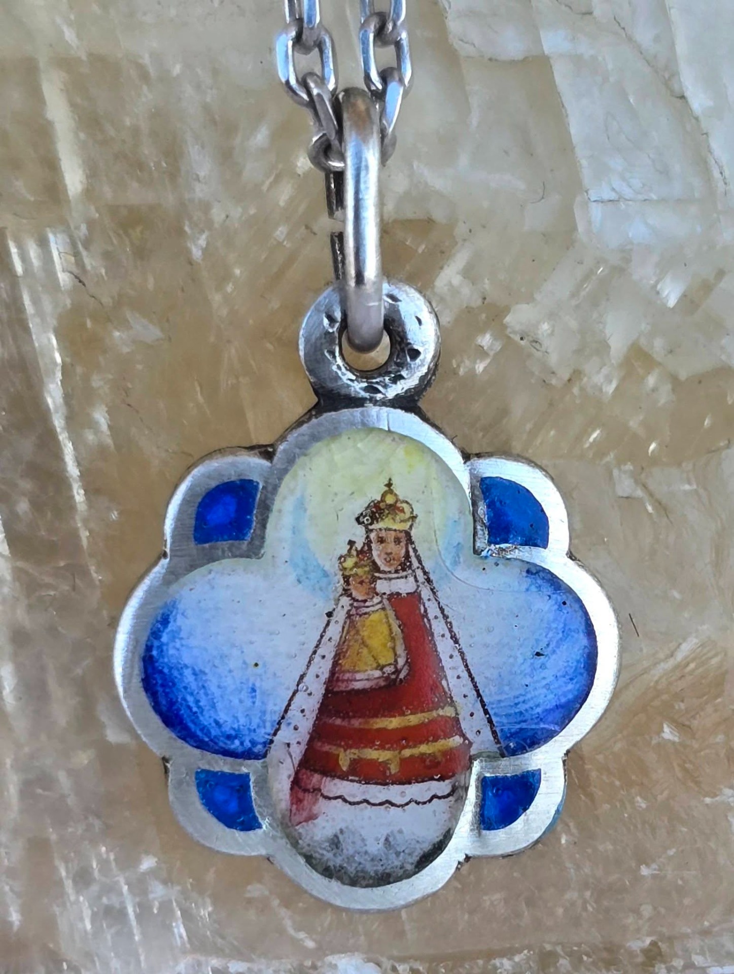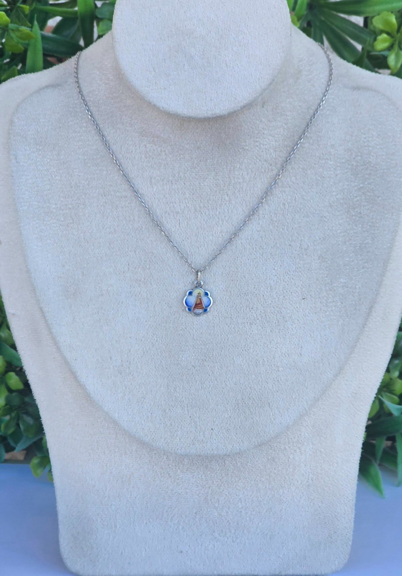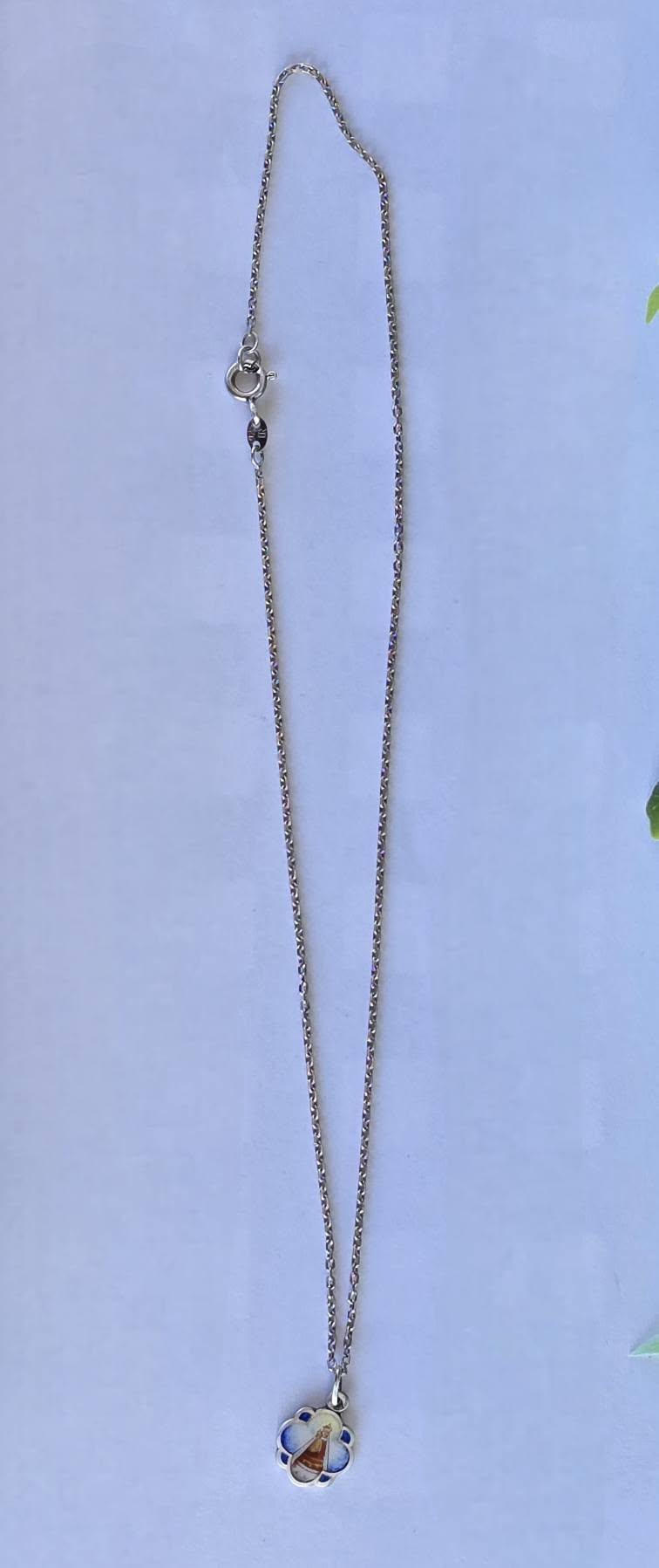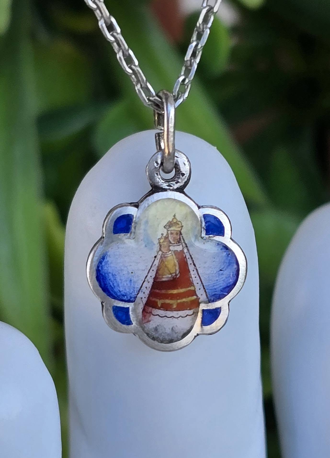 Lanț cu medalion religios vechi, din argint, cu email frumos pictat manual, cu reprezentare a „Magna Mater Austriae” (Marea Mamă a Austriei), statuia făcătoare de minuni din sec.XII care se află la Mariazell, important loc de pelerinaj, manufactură de meșter austriac (anii 1920-1930, Austria).