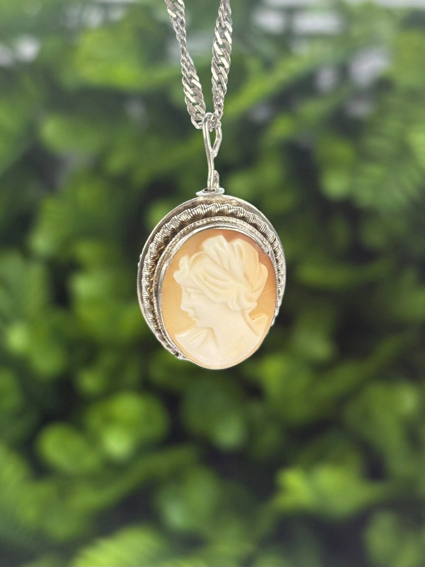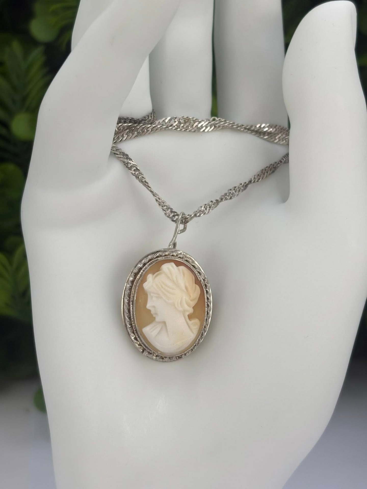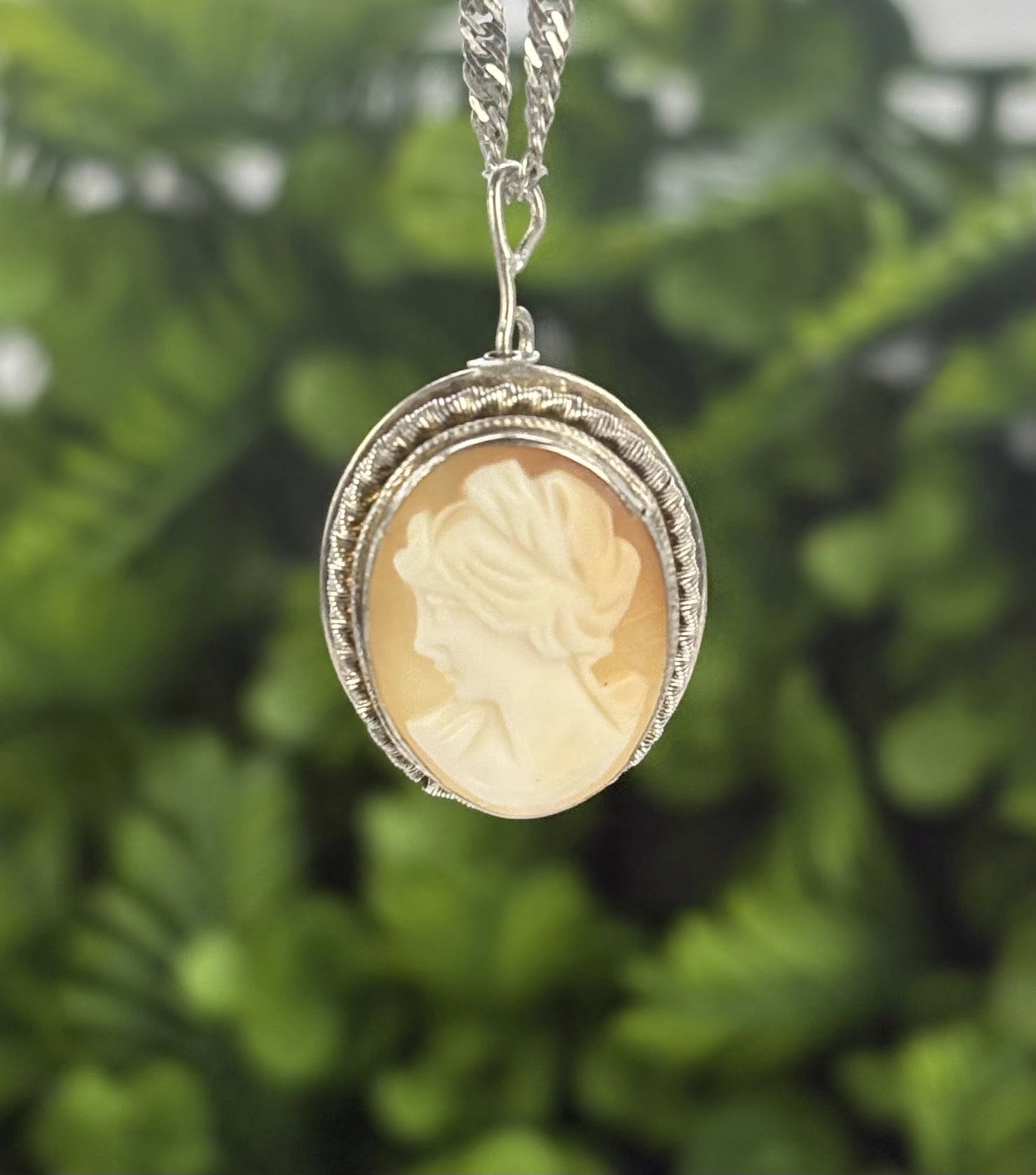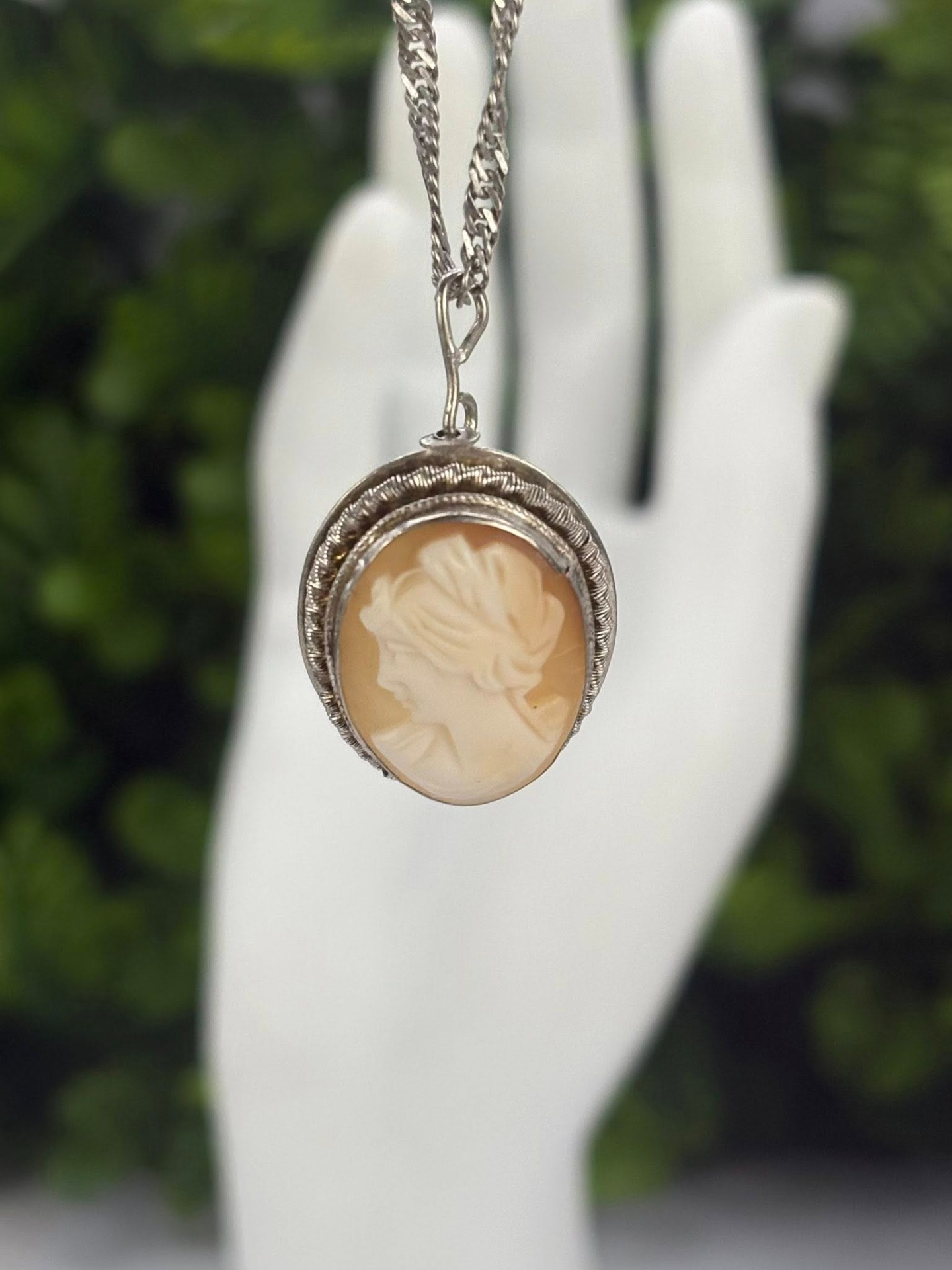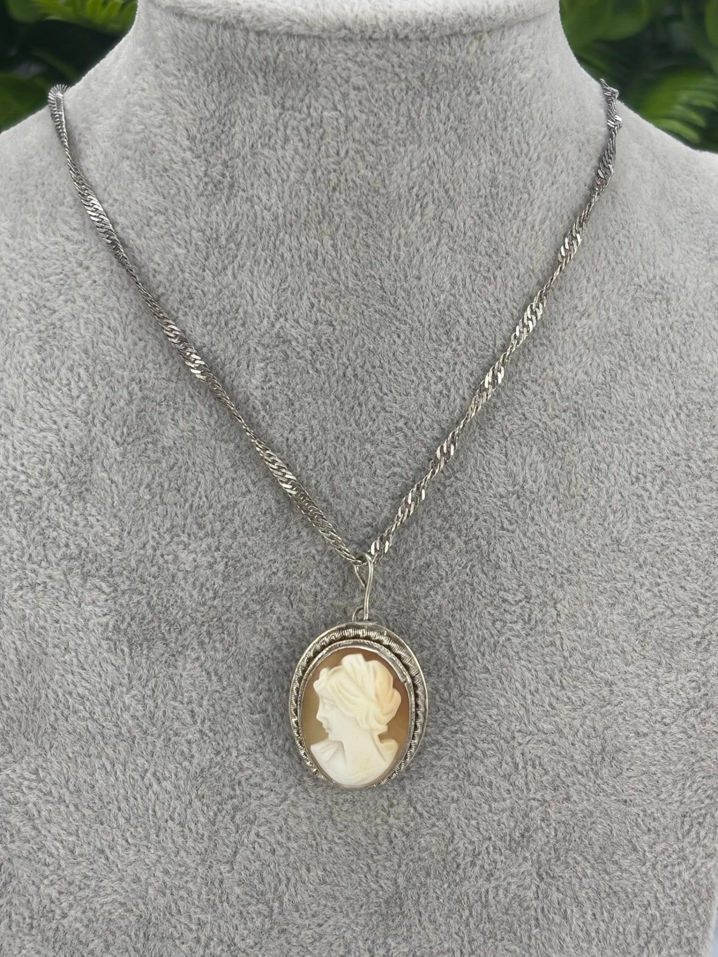 Lanț cu pandantiv broșă vechi din argint, cu camee.