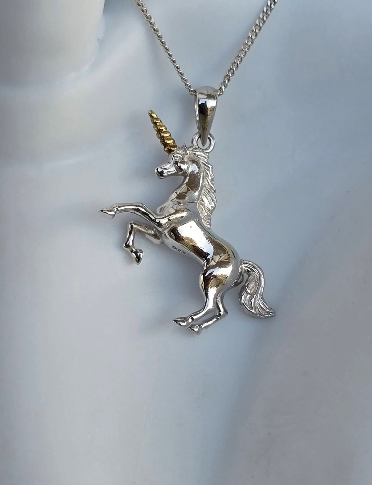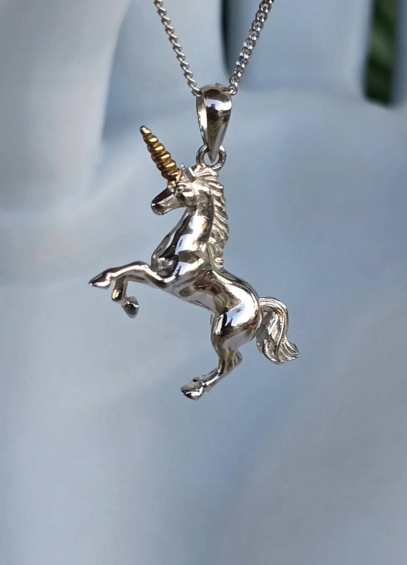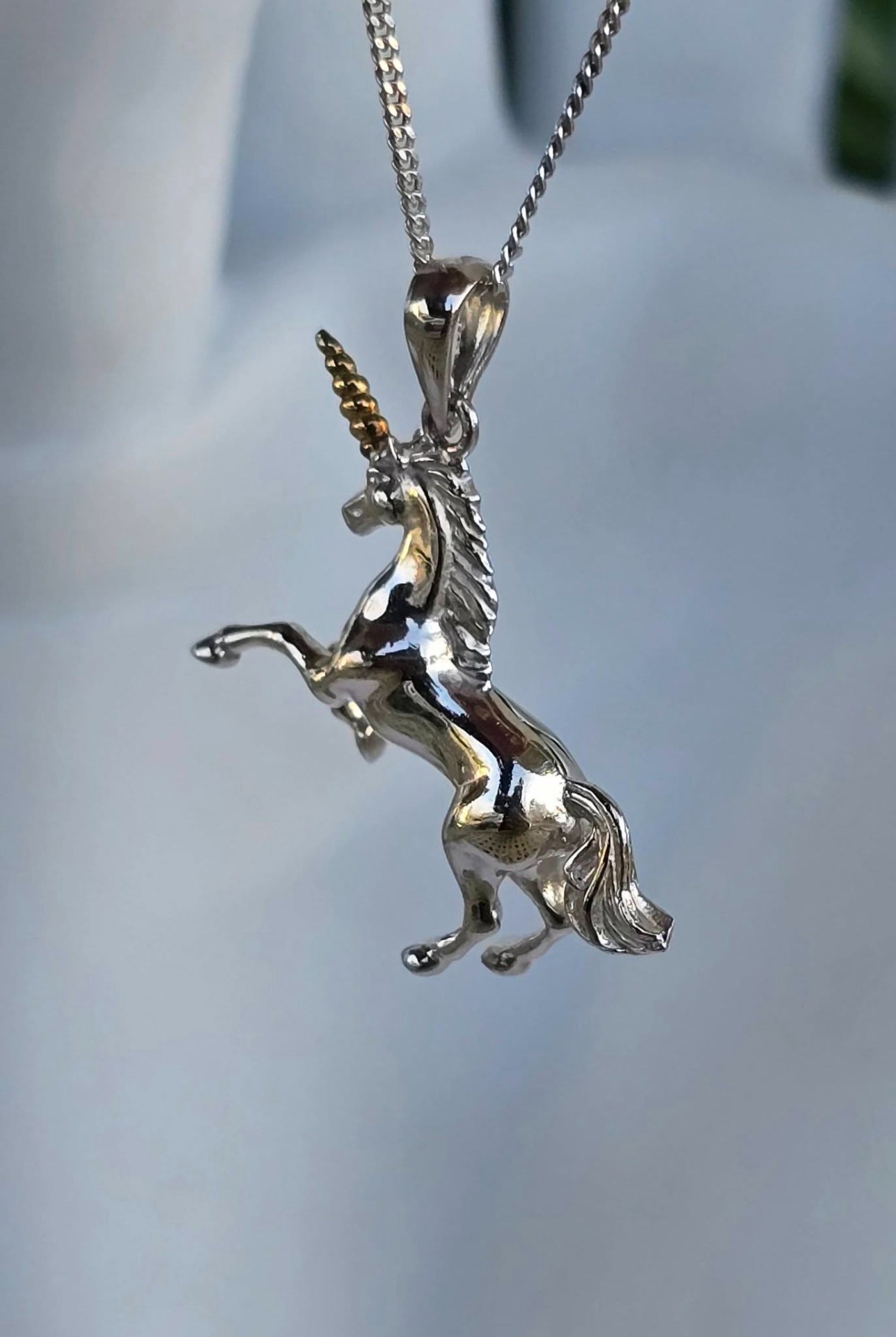 Lanț cu pandantiv contemporan din argint și argint aurit, frumos stilizat sub forma unui unicorn.