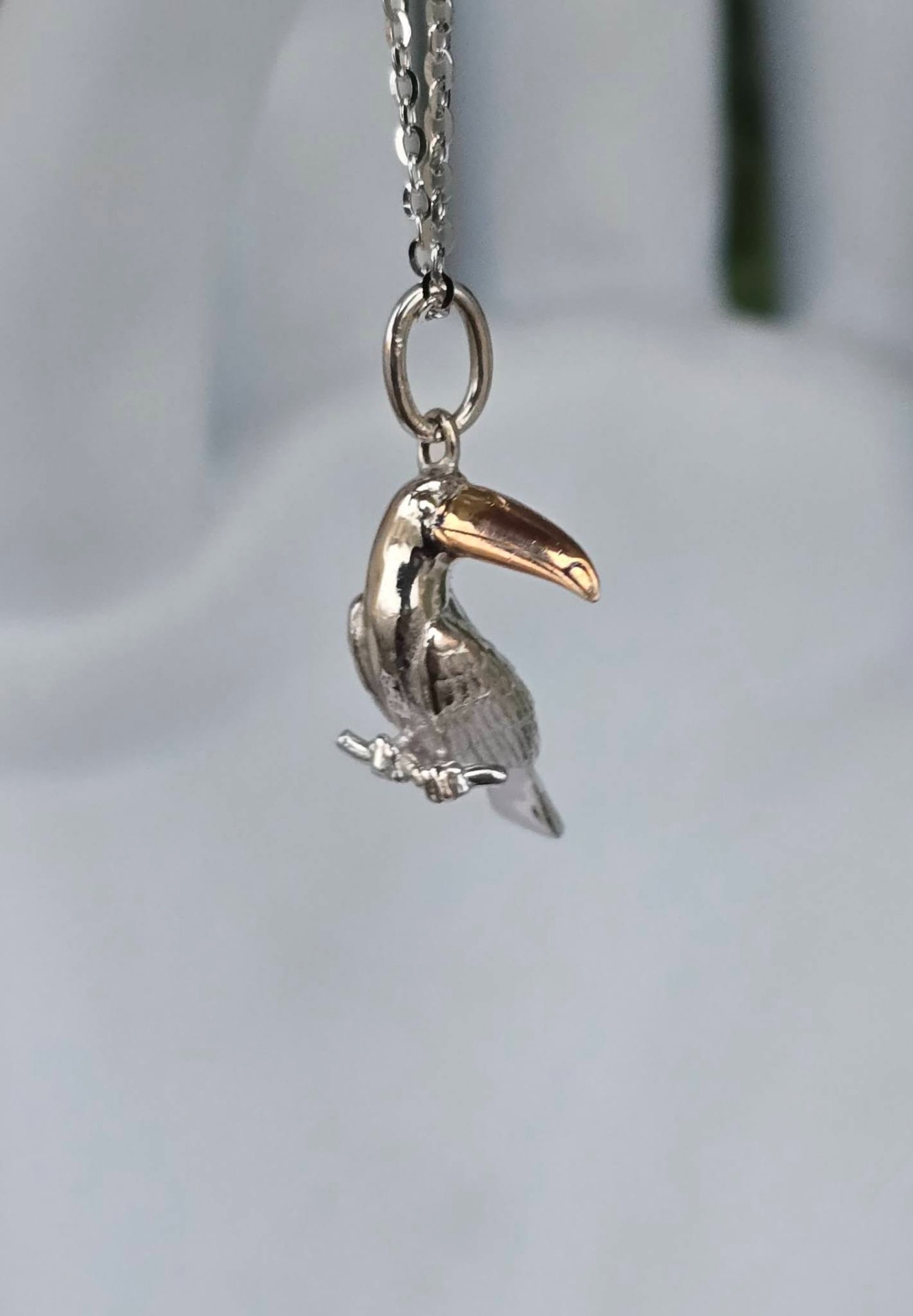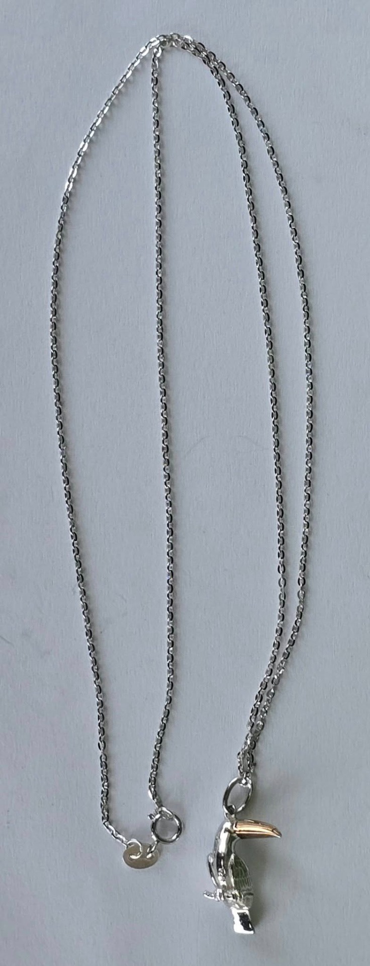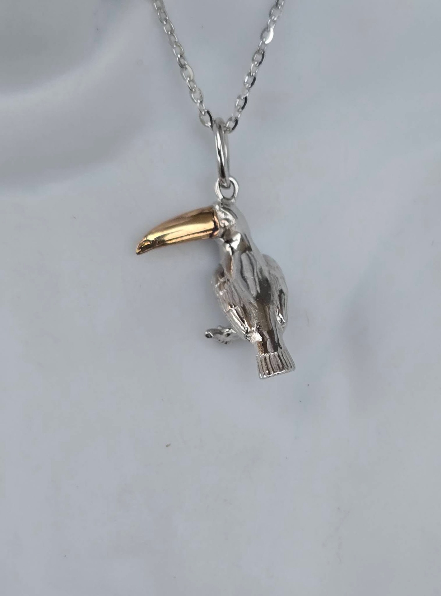 Lanț cu pandantiv contemporan din argint și argint aurit, frumos stilizat sub forma unui toucan.