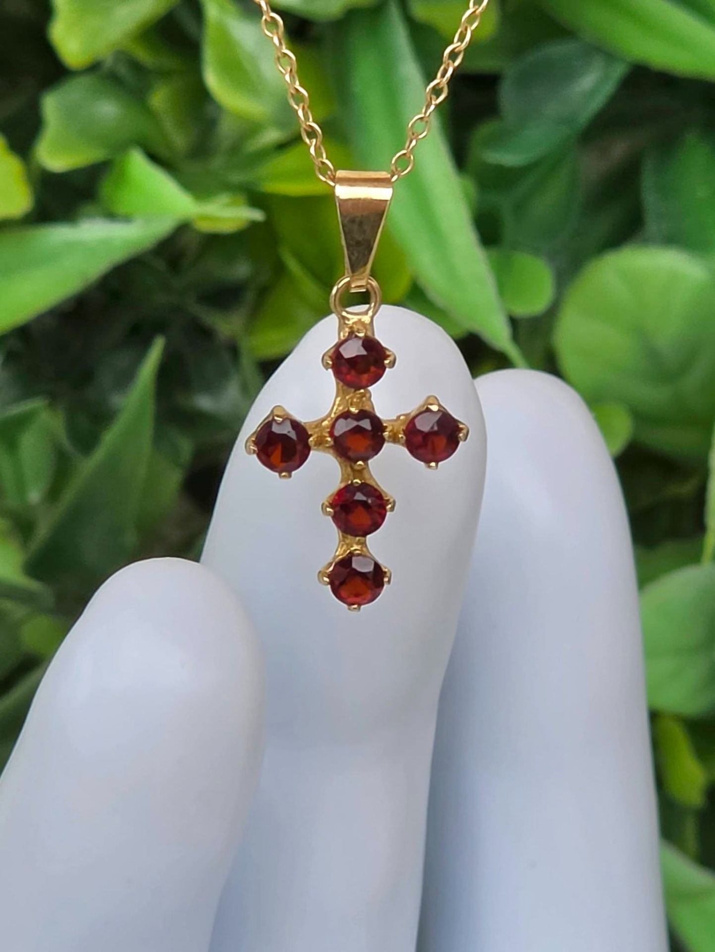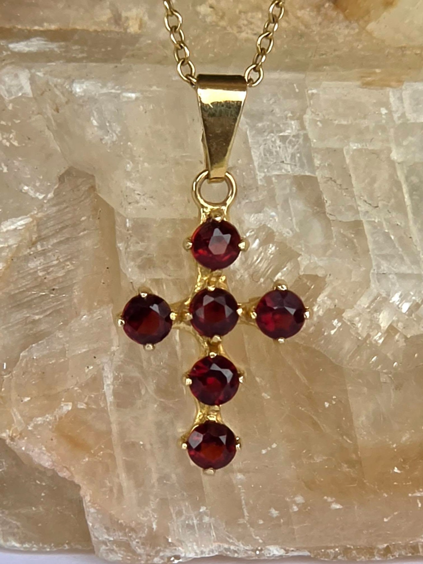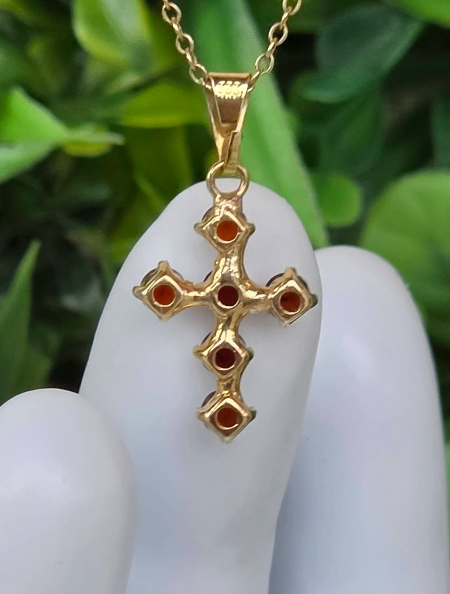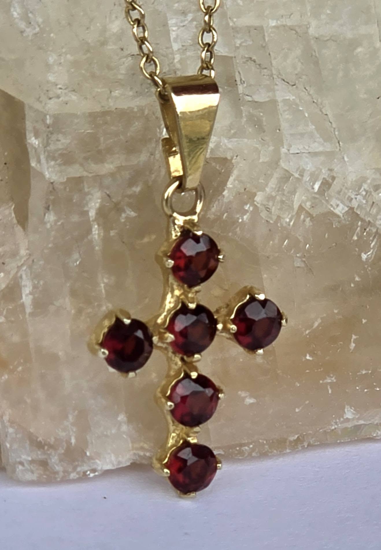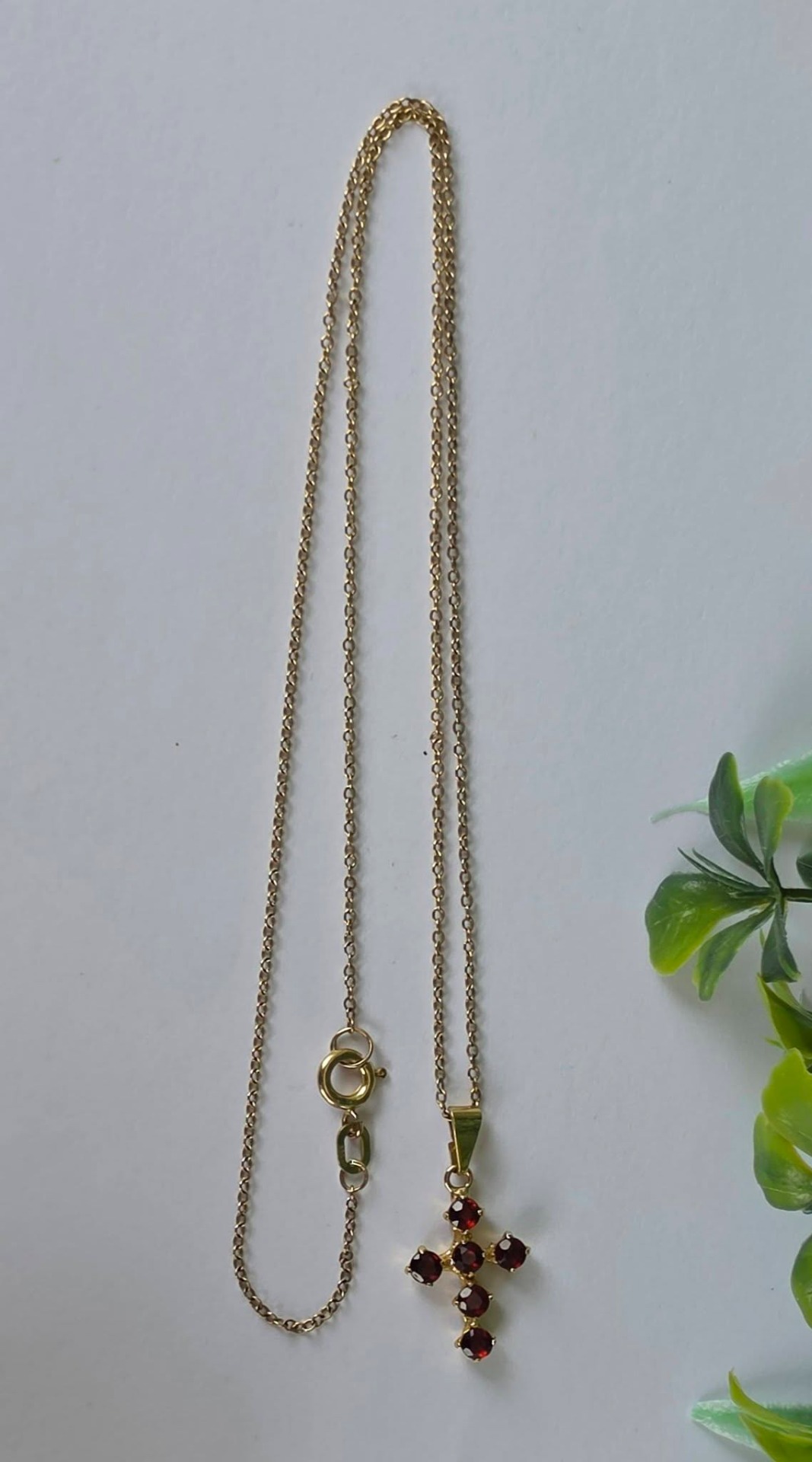 Lanț cu pandantiv-cruce vechi, din aur de 8K, cu 6 granate Bohemia naturale.