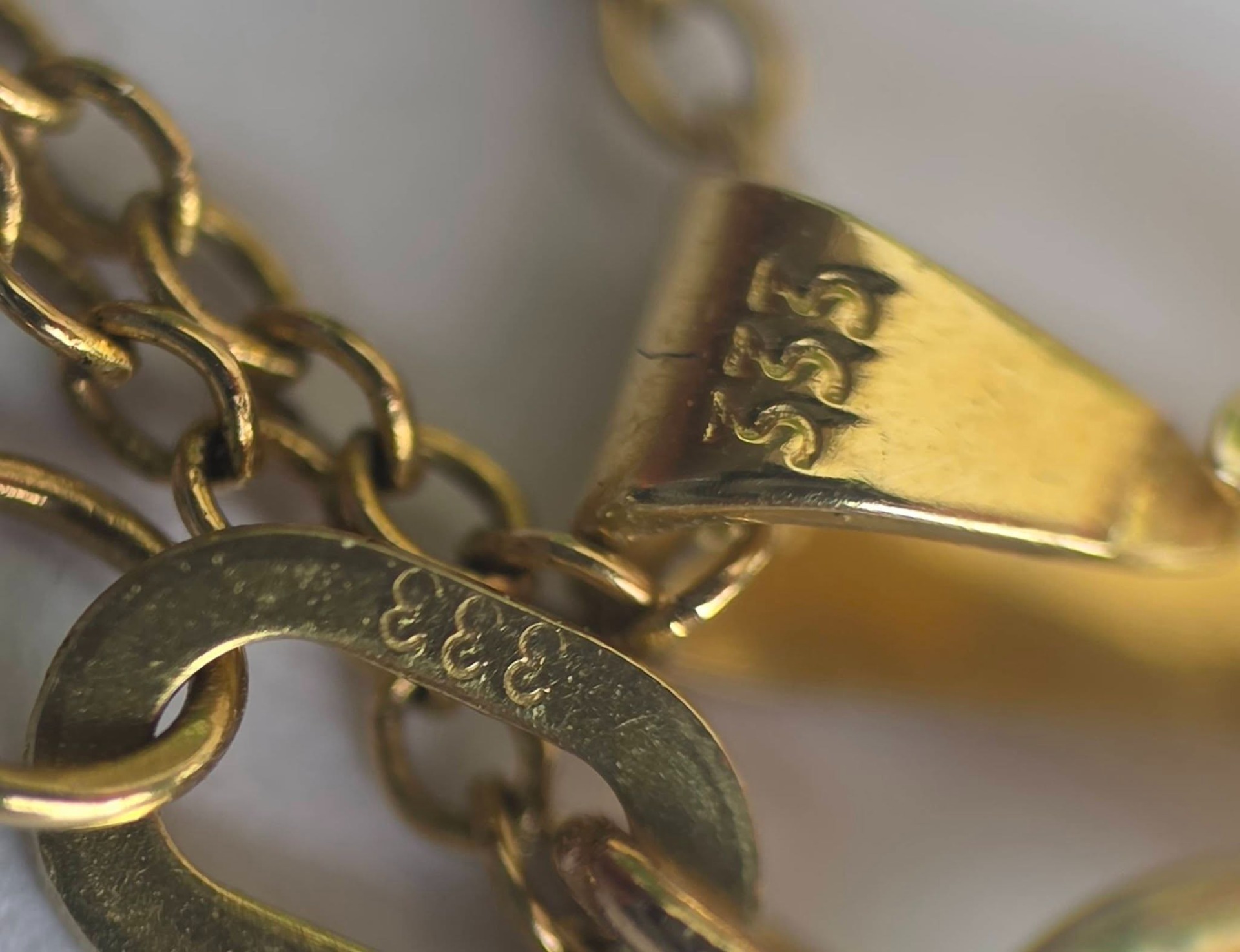 Prezintă marcaje 333 pentru puritate aur de 8K , atât lanțul cât și pandantul.