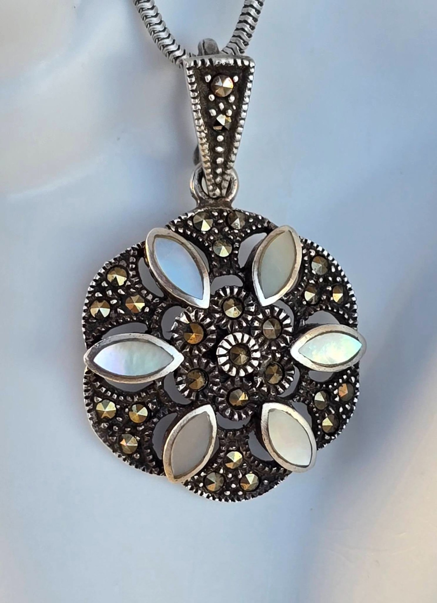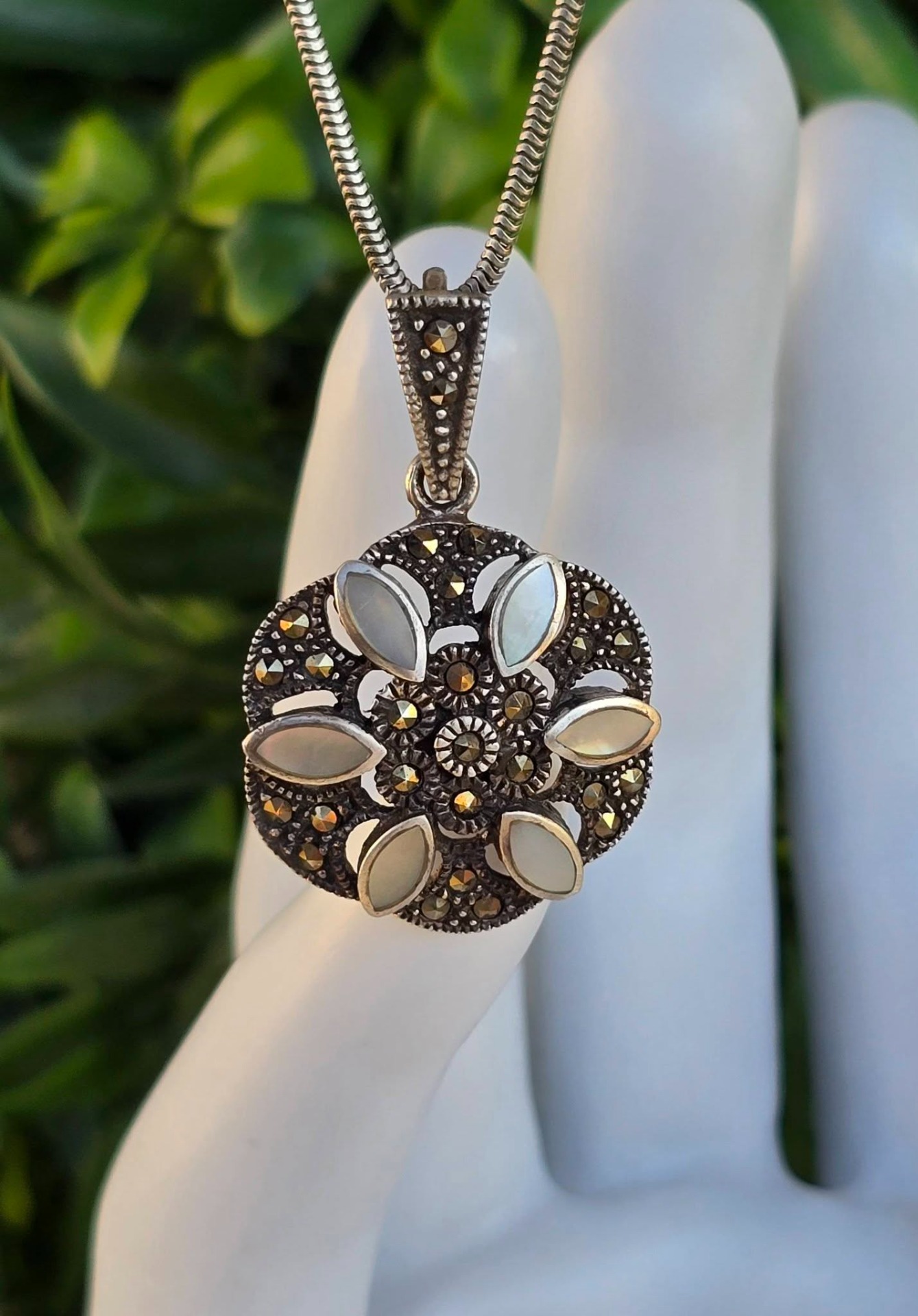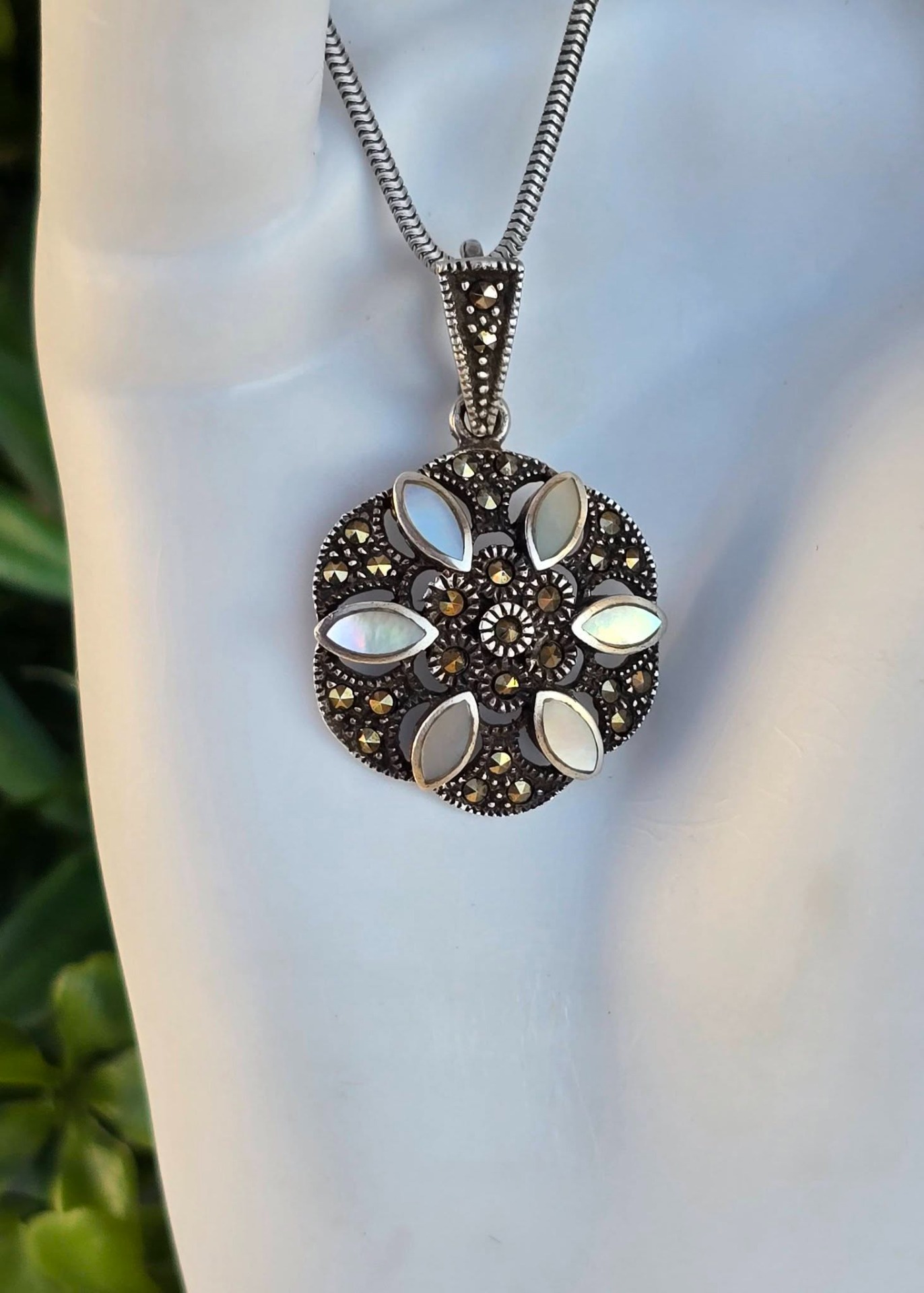Lanț cu pandantiv "Mandala" vechi, din argint, cu marcasite și floare cu petale din sidef natural.