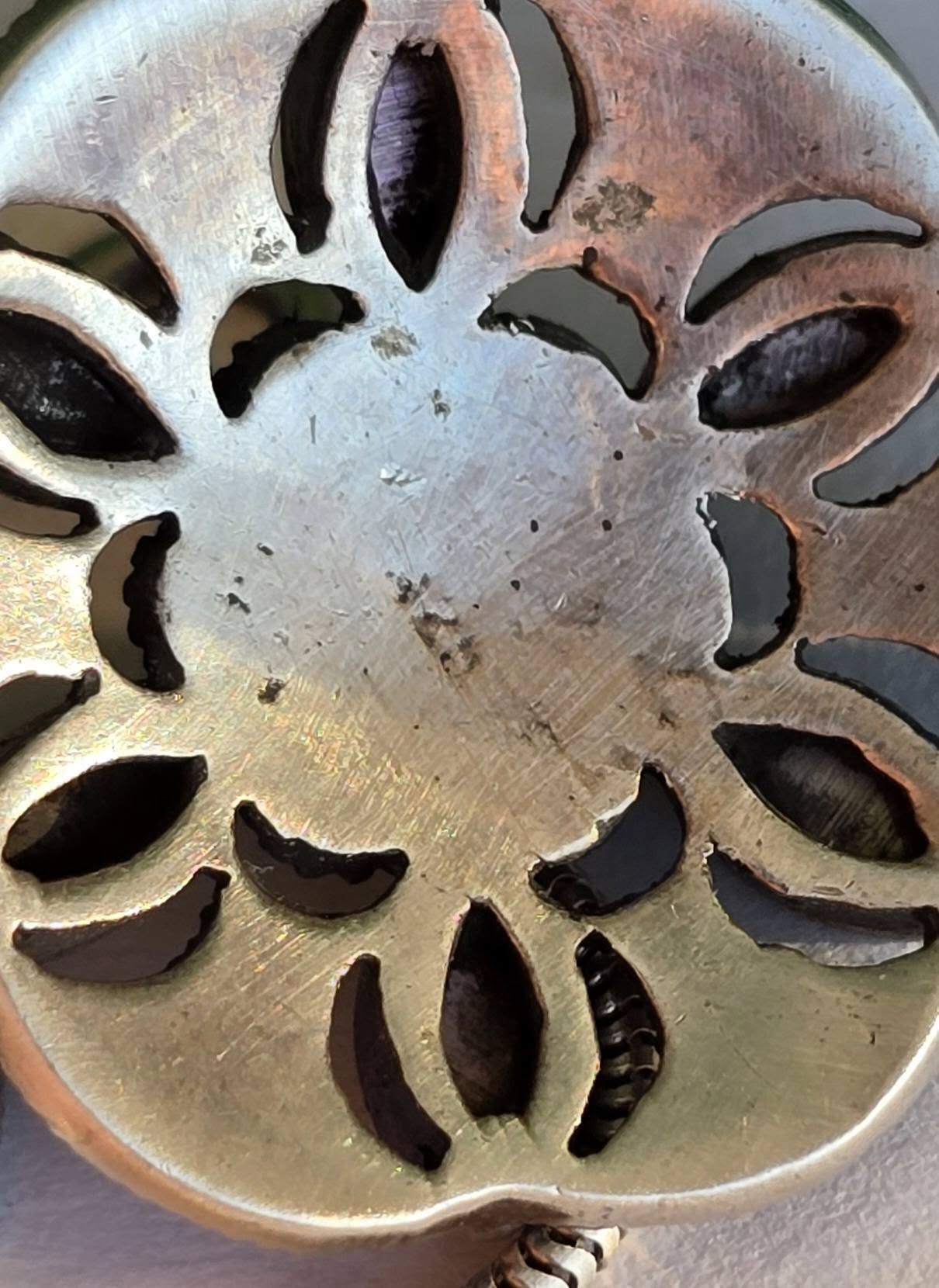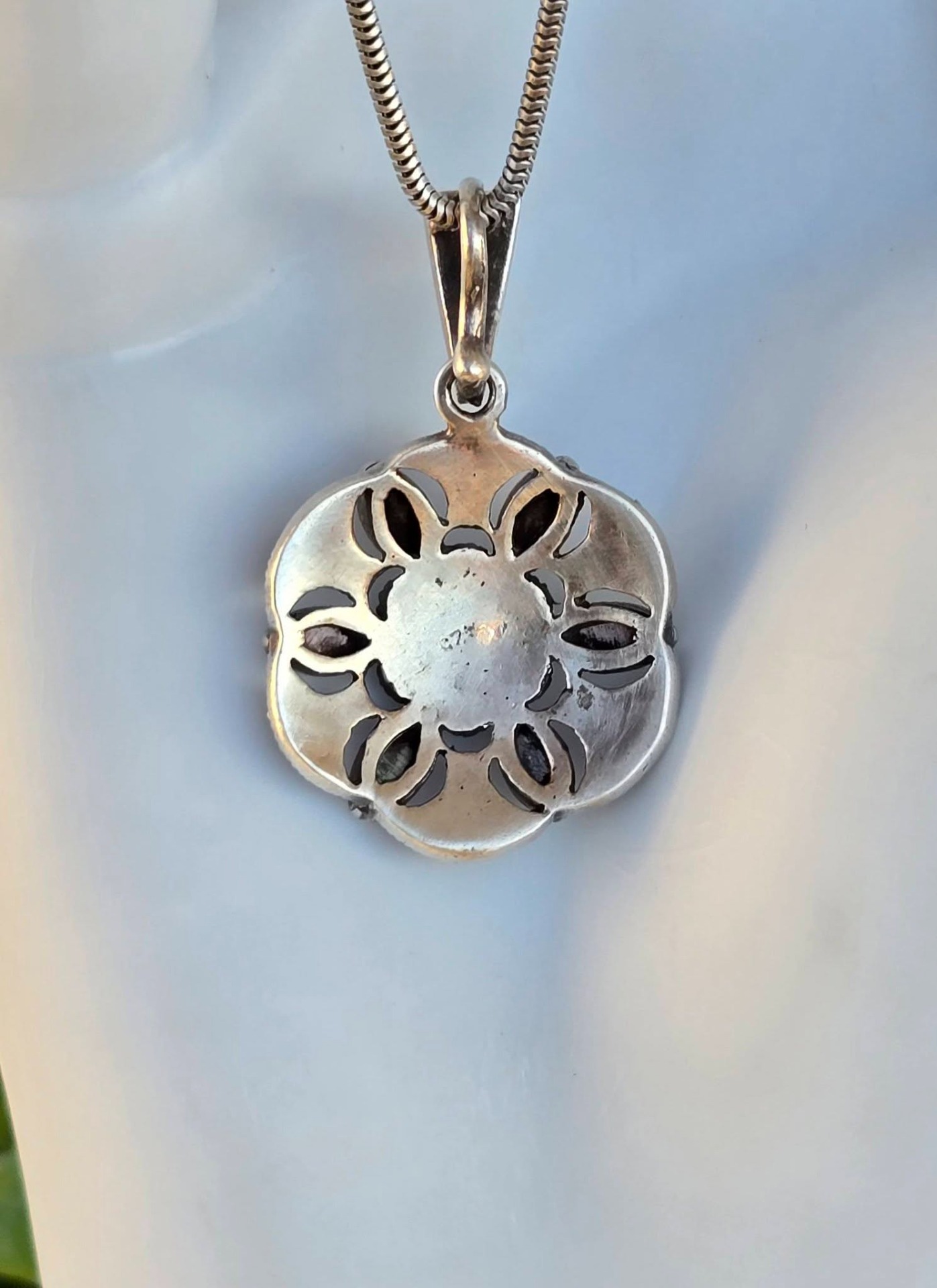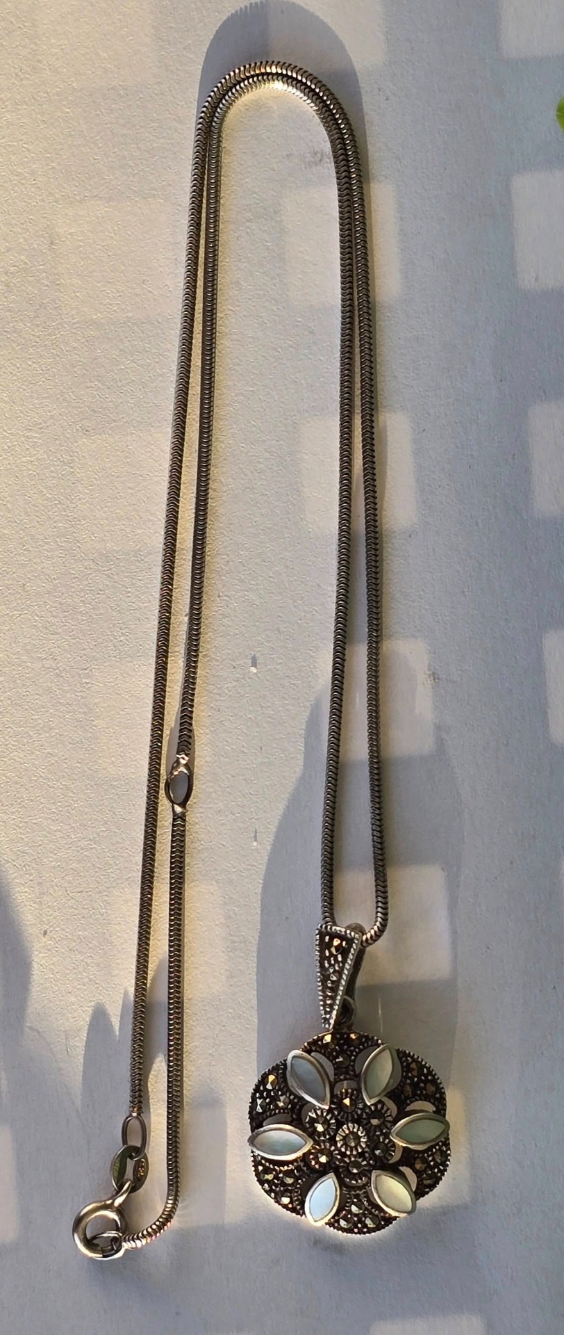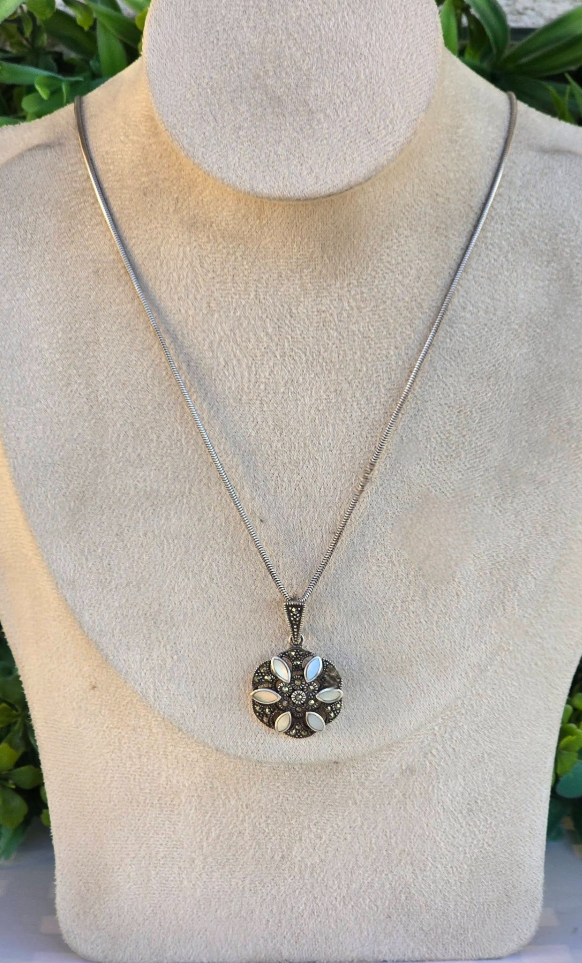 Lanț cu pandantiv "Mandala" vechi, din argint, cu marcasite și floare cu petale din sidef natural.