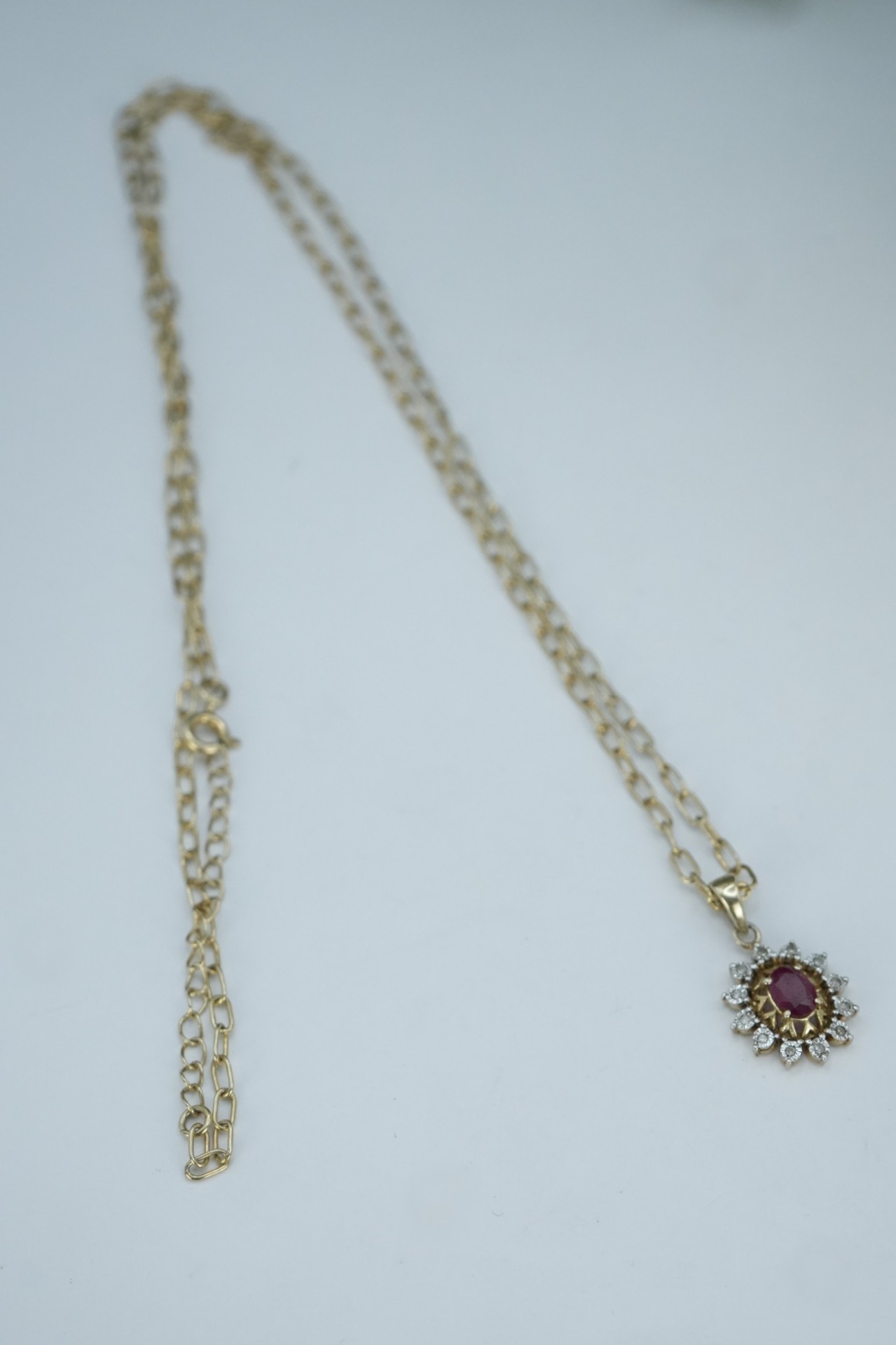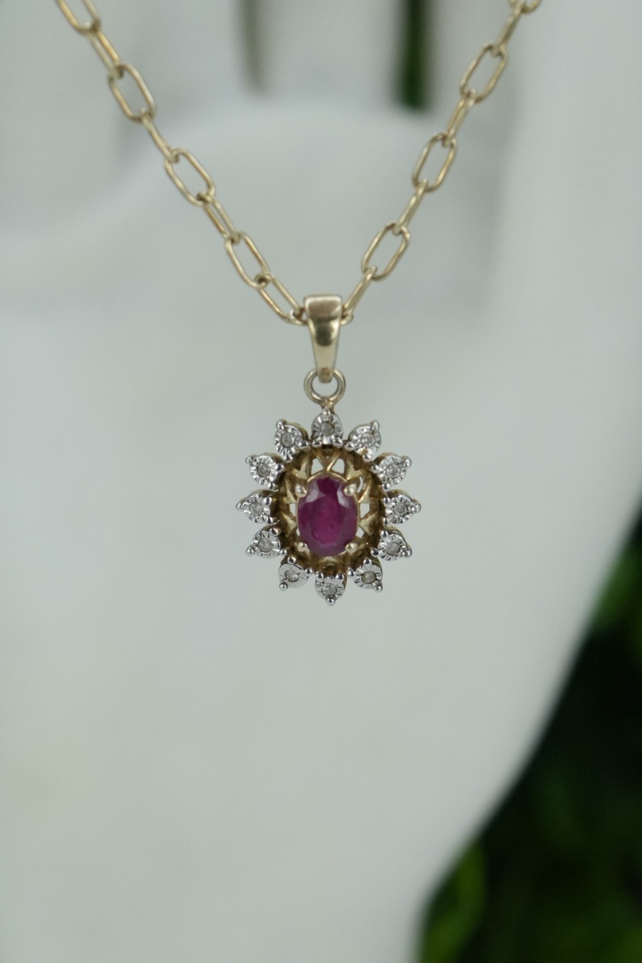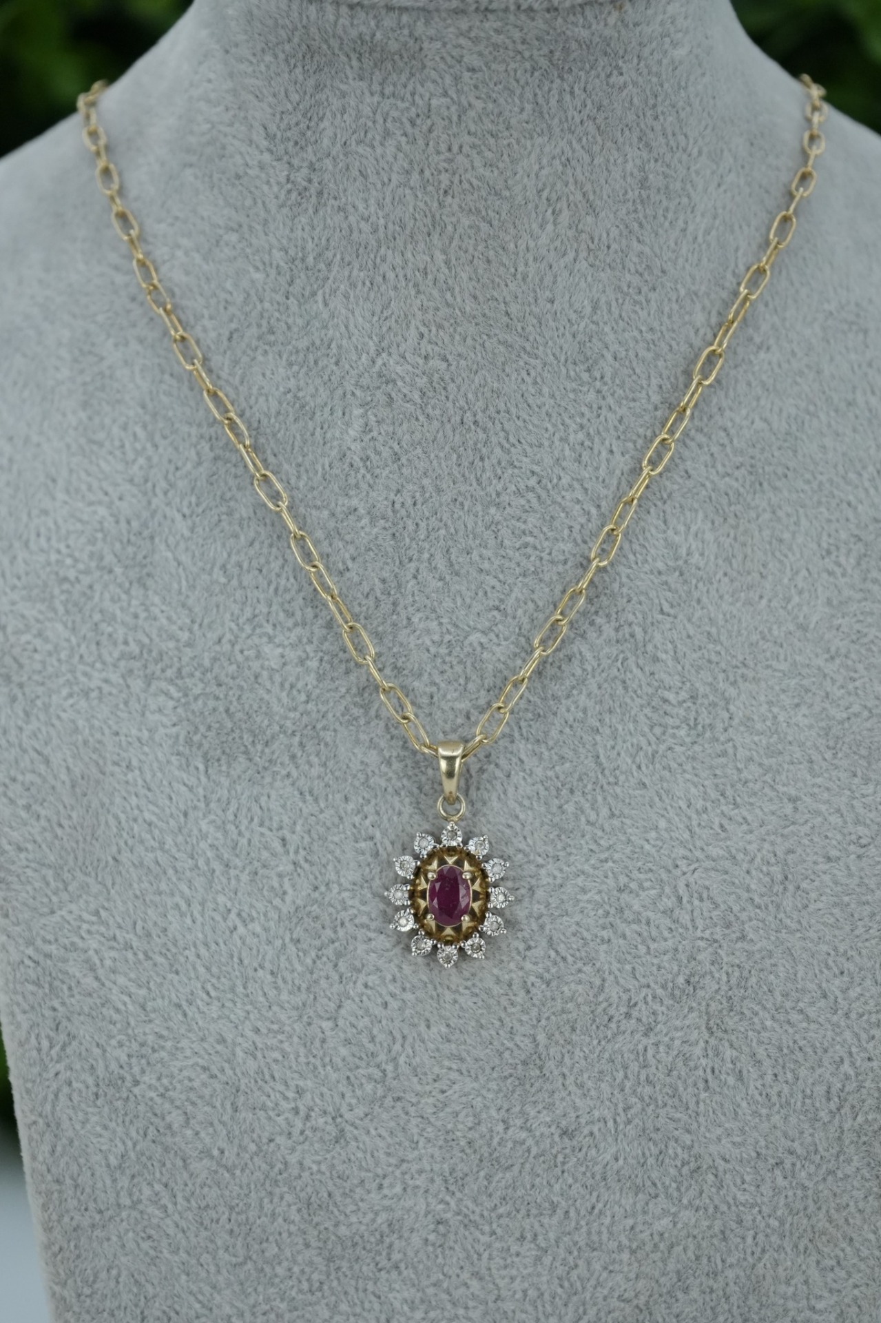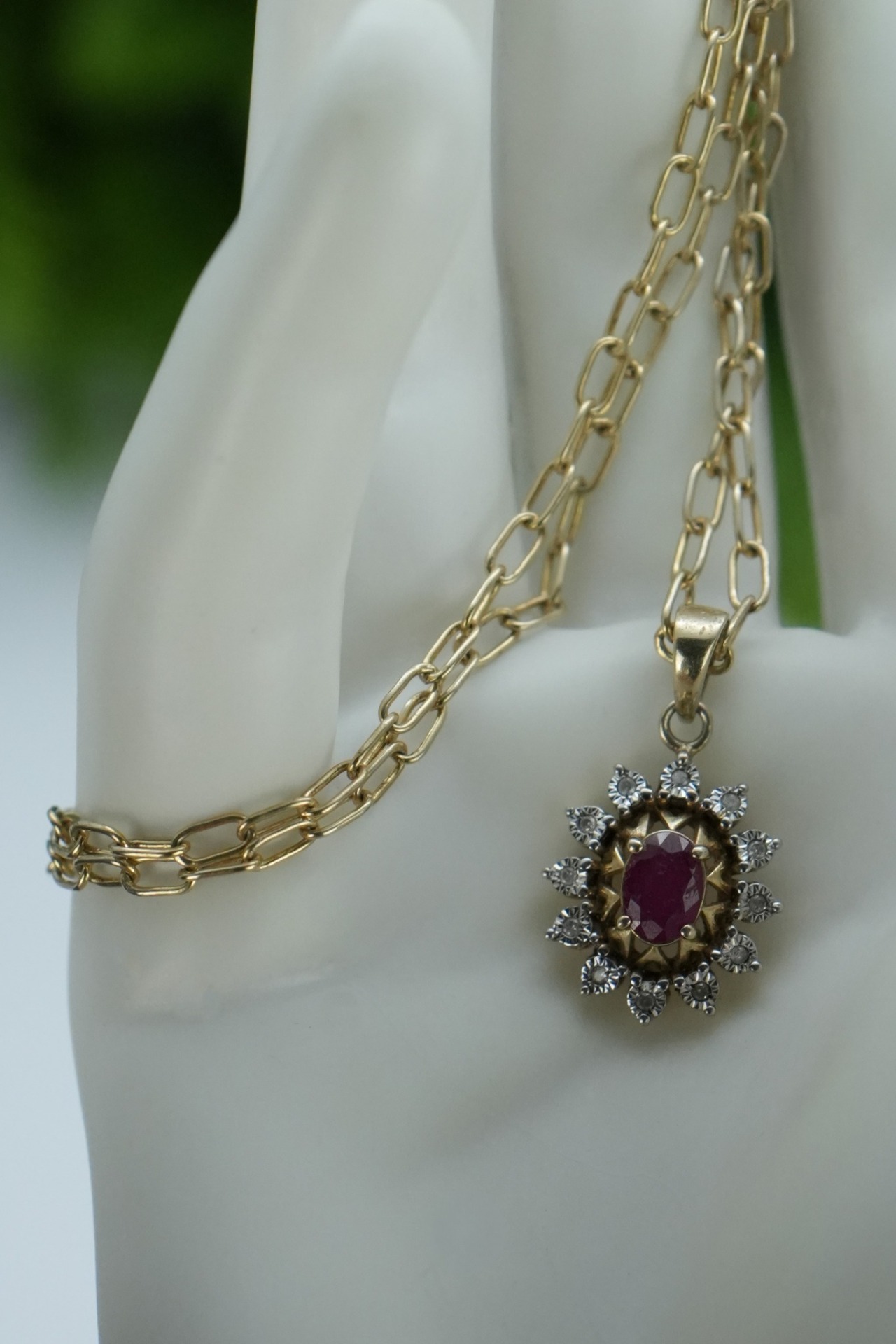 Lanț cu pandantiv vechi din argint aurit, cu rubin și 12 diamante naturale.