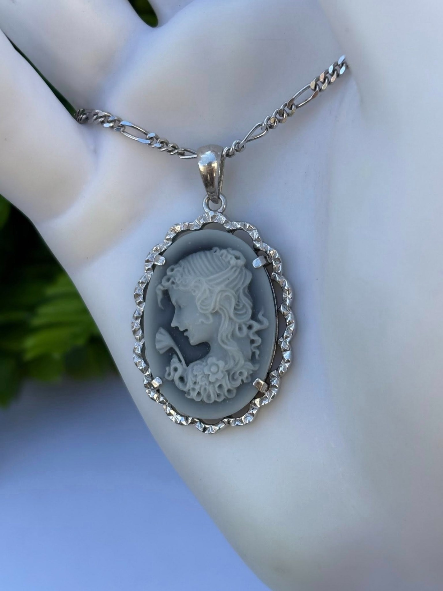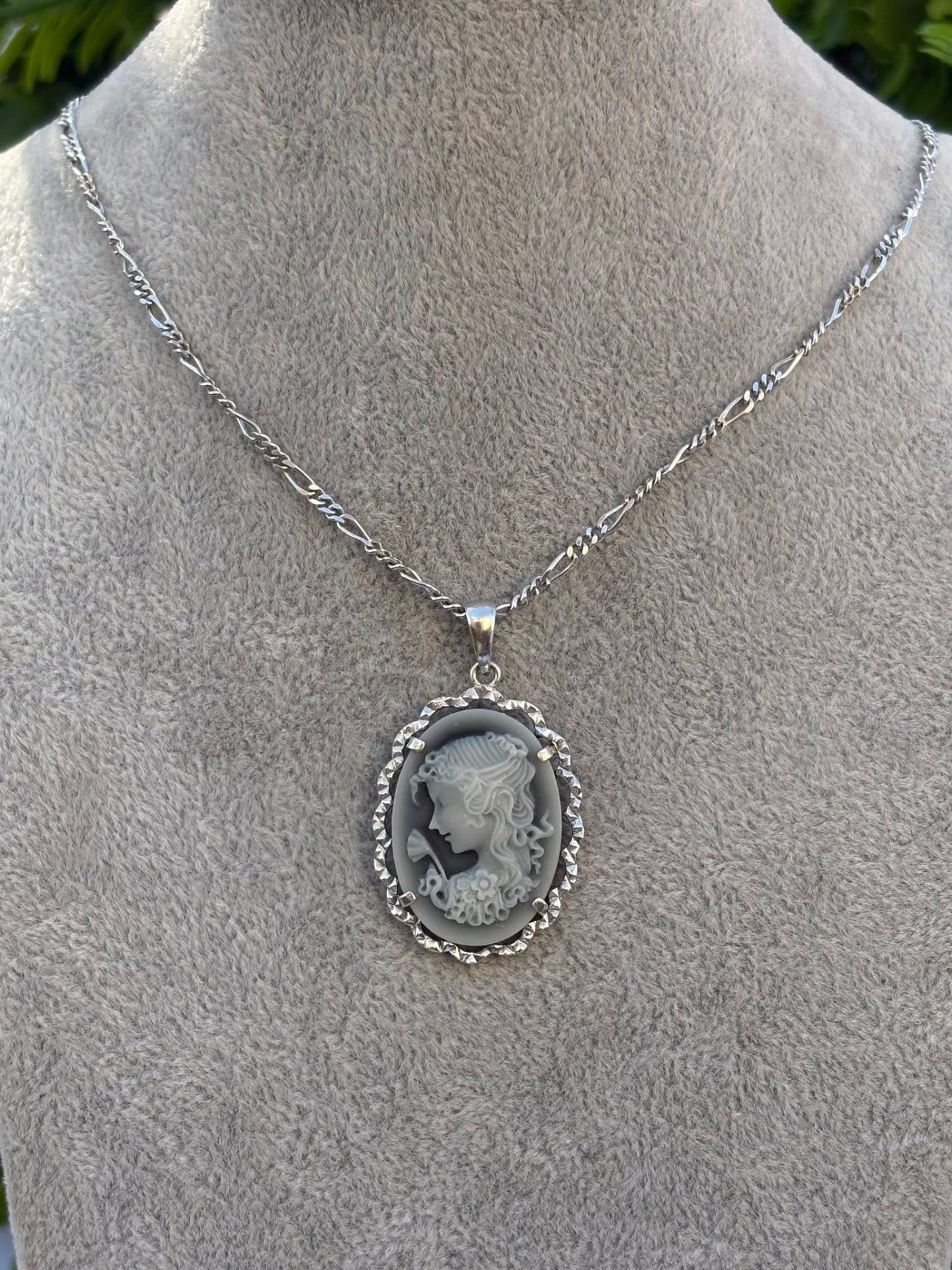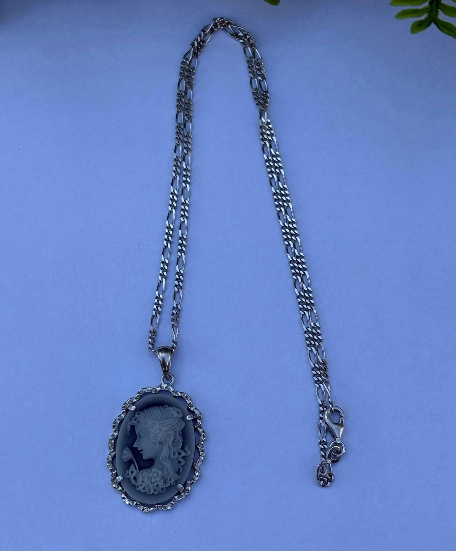 Lanț cu pandantiv vechi din argint cu camee pe onix albastru.