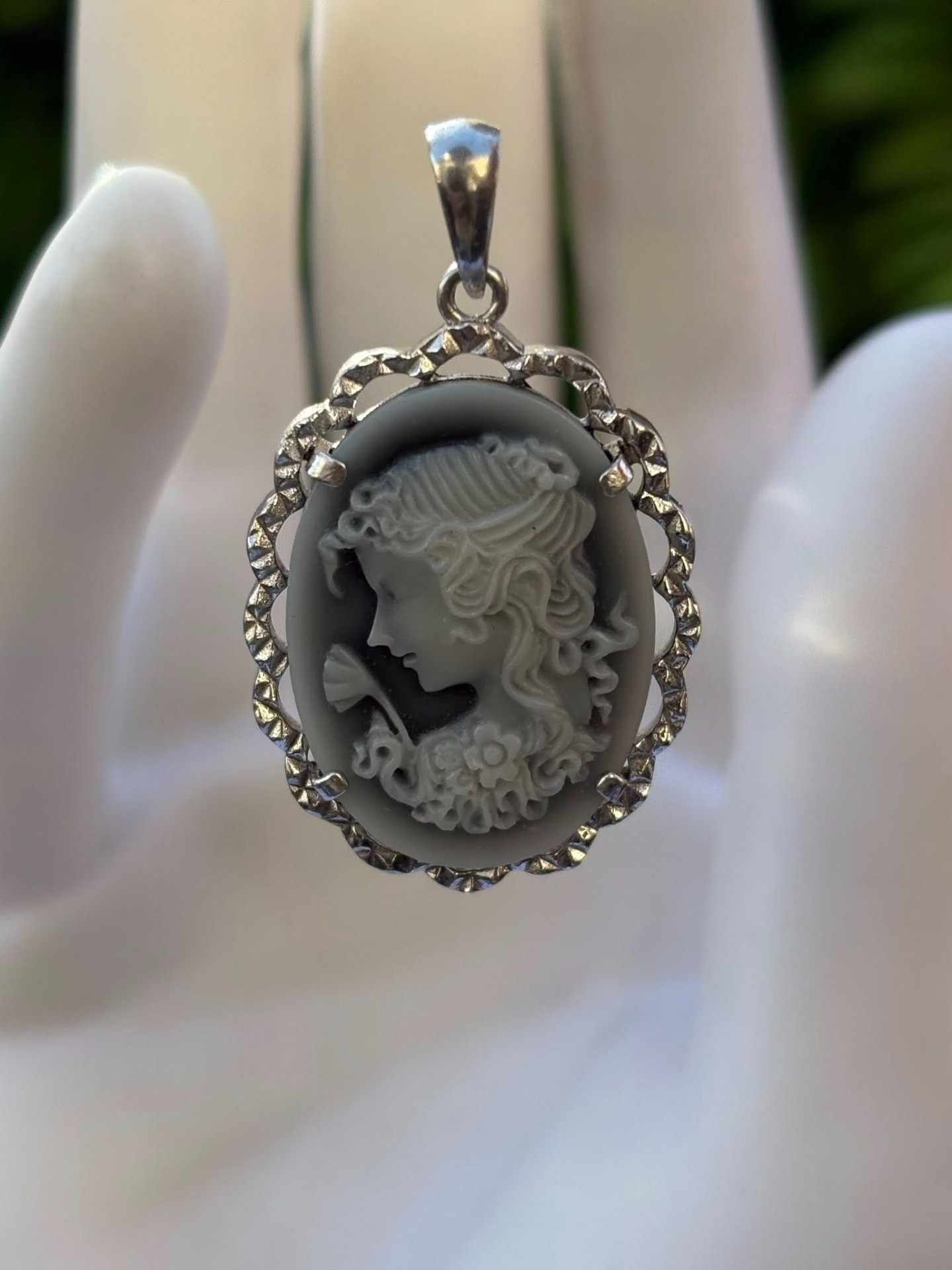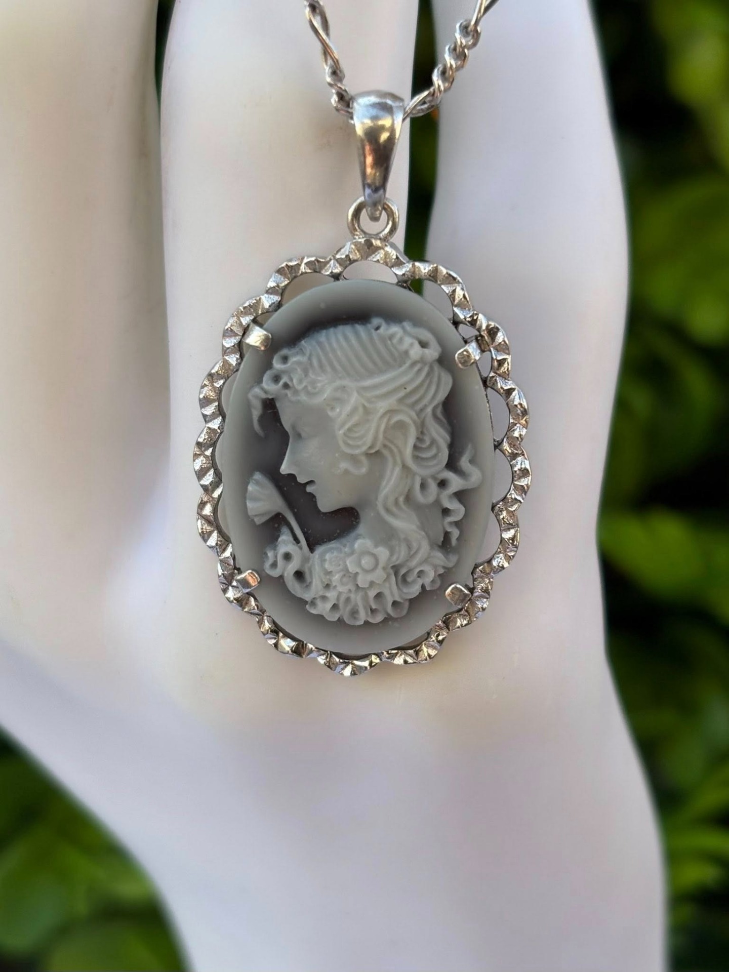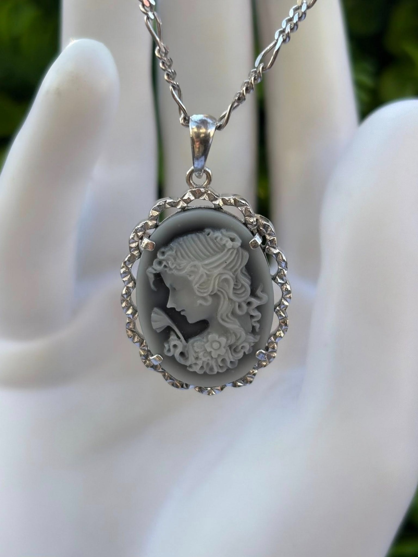 Lanț cu pandantiv vechi din argint cu camee pe onix albastru.