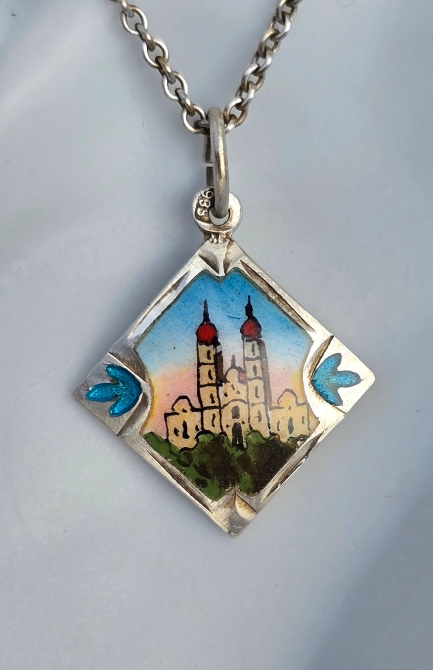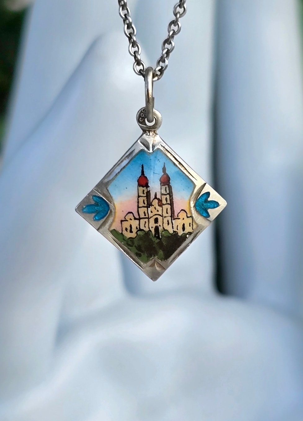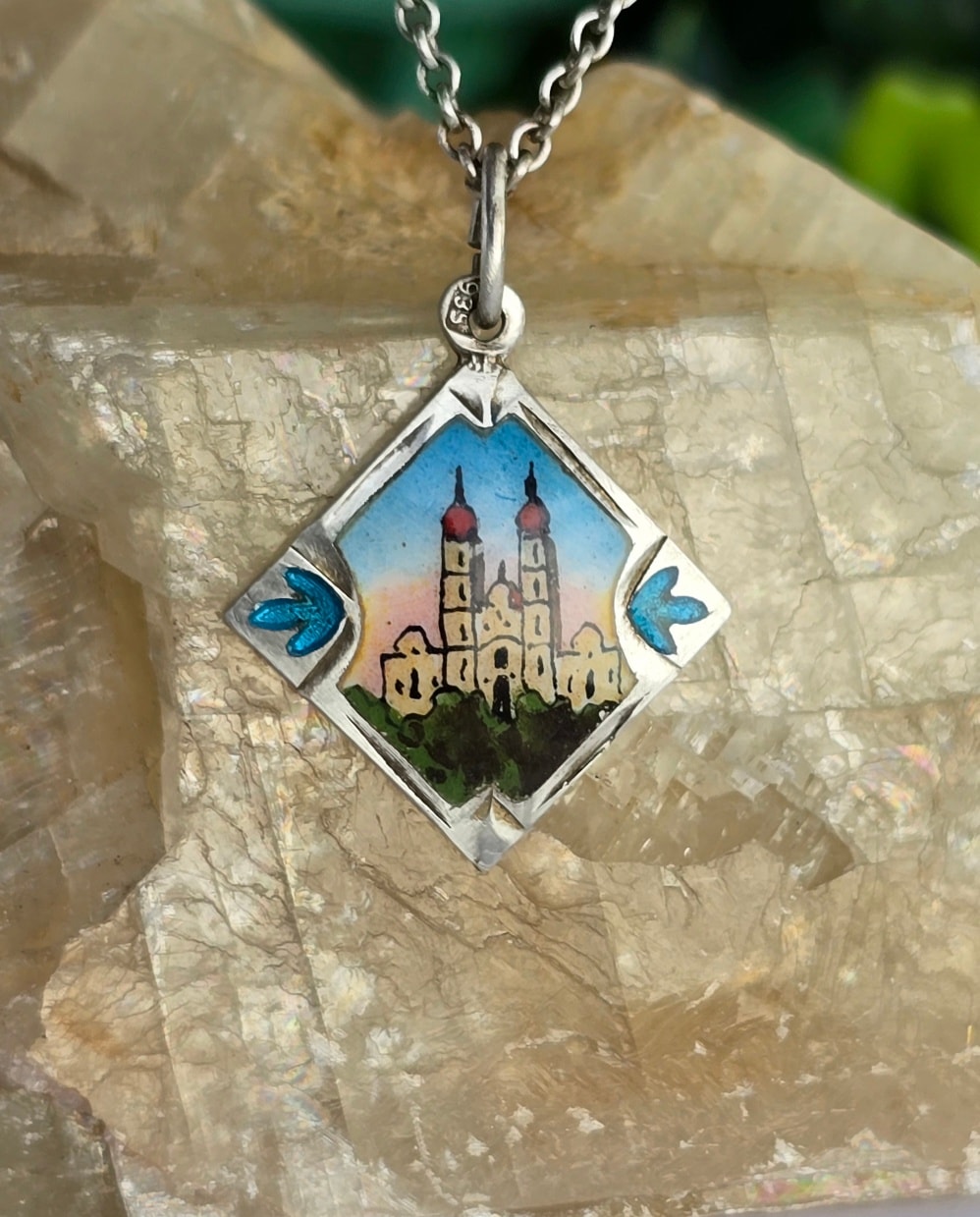Lanț cu pandantiv vechi din argint, cu email pictat manual (anii 1920-1930, Austria).