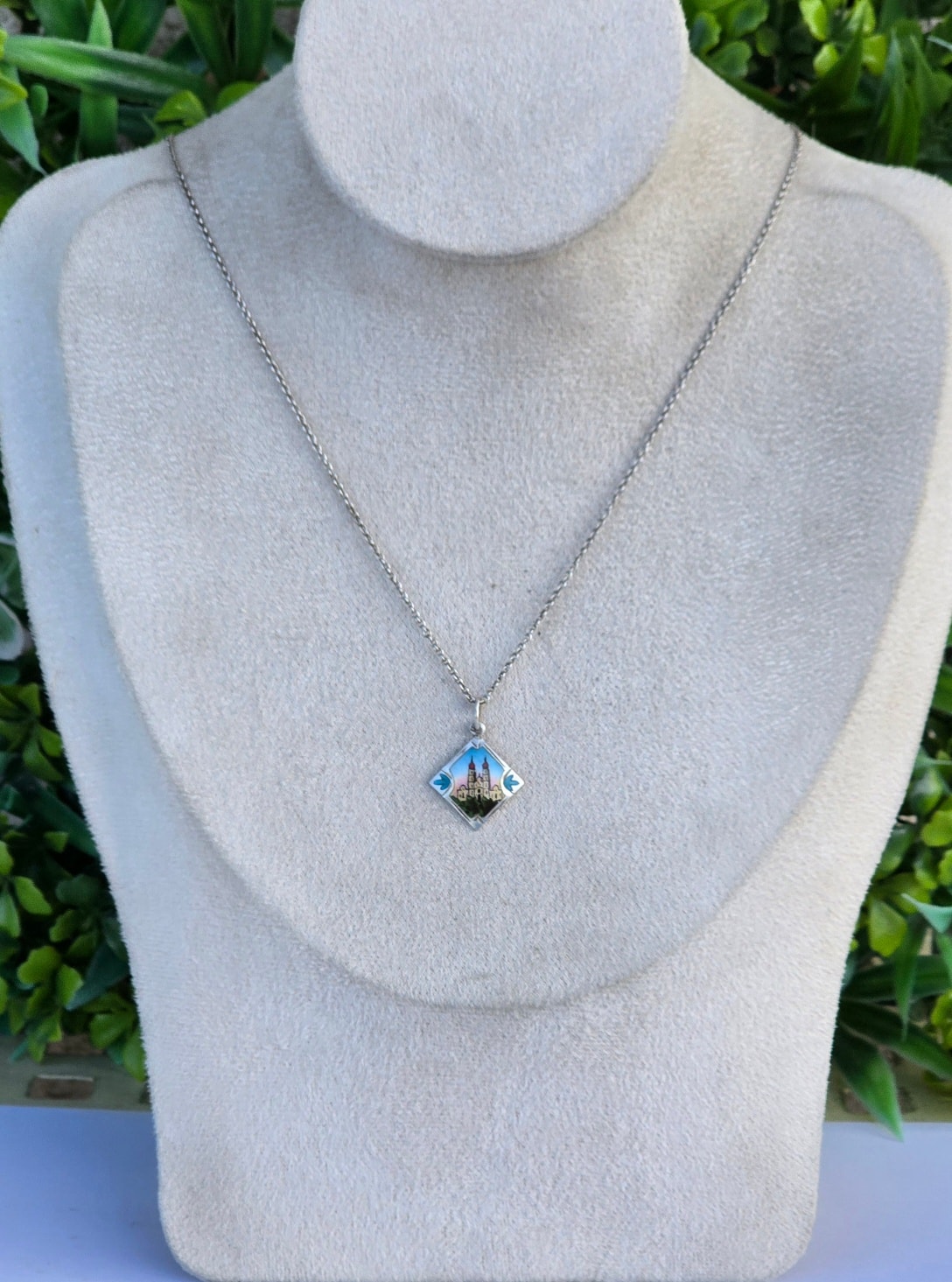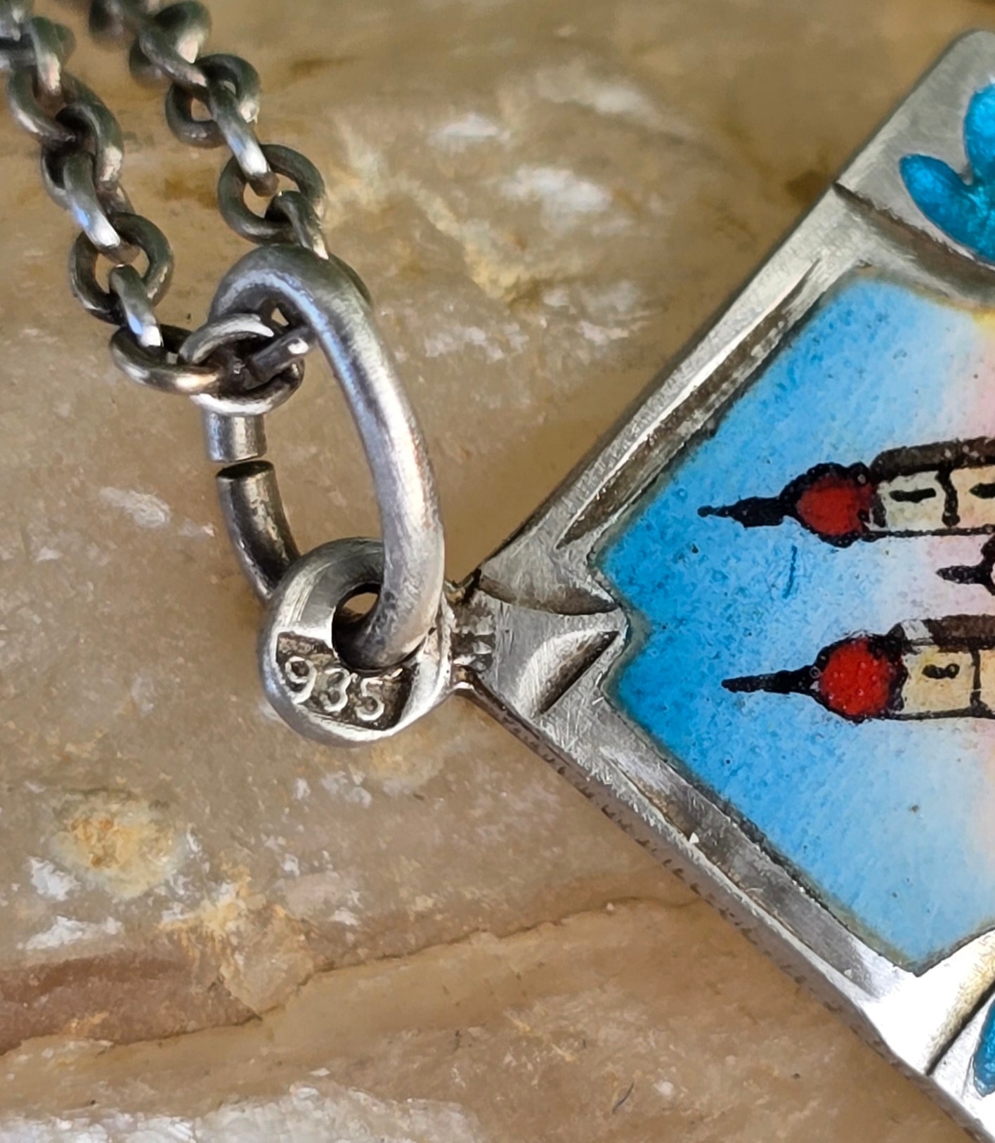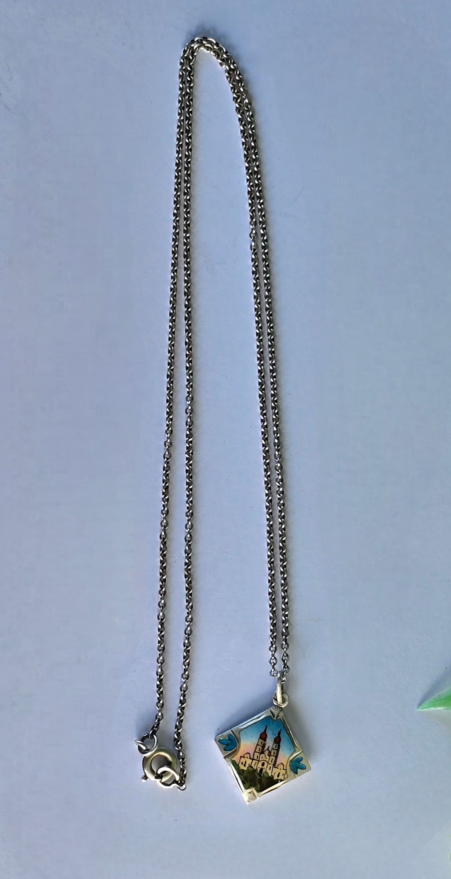Lanț cu pandantiv vechi din argint, cu email pictat manual (anii 1920-1930, Austria).