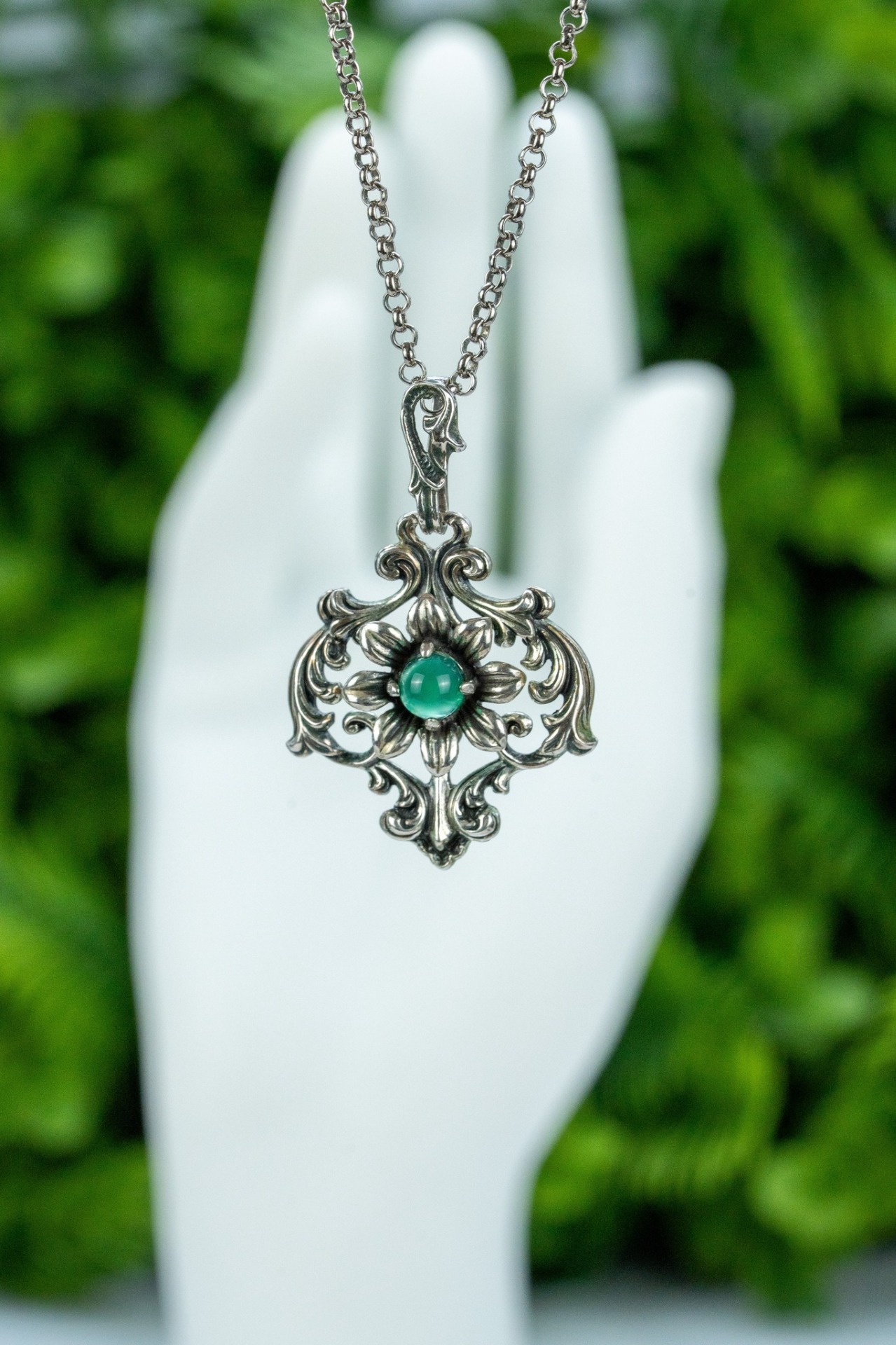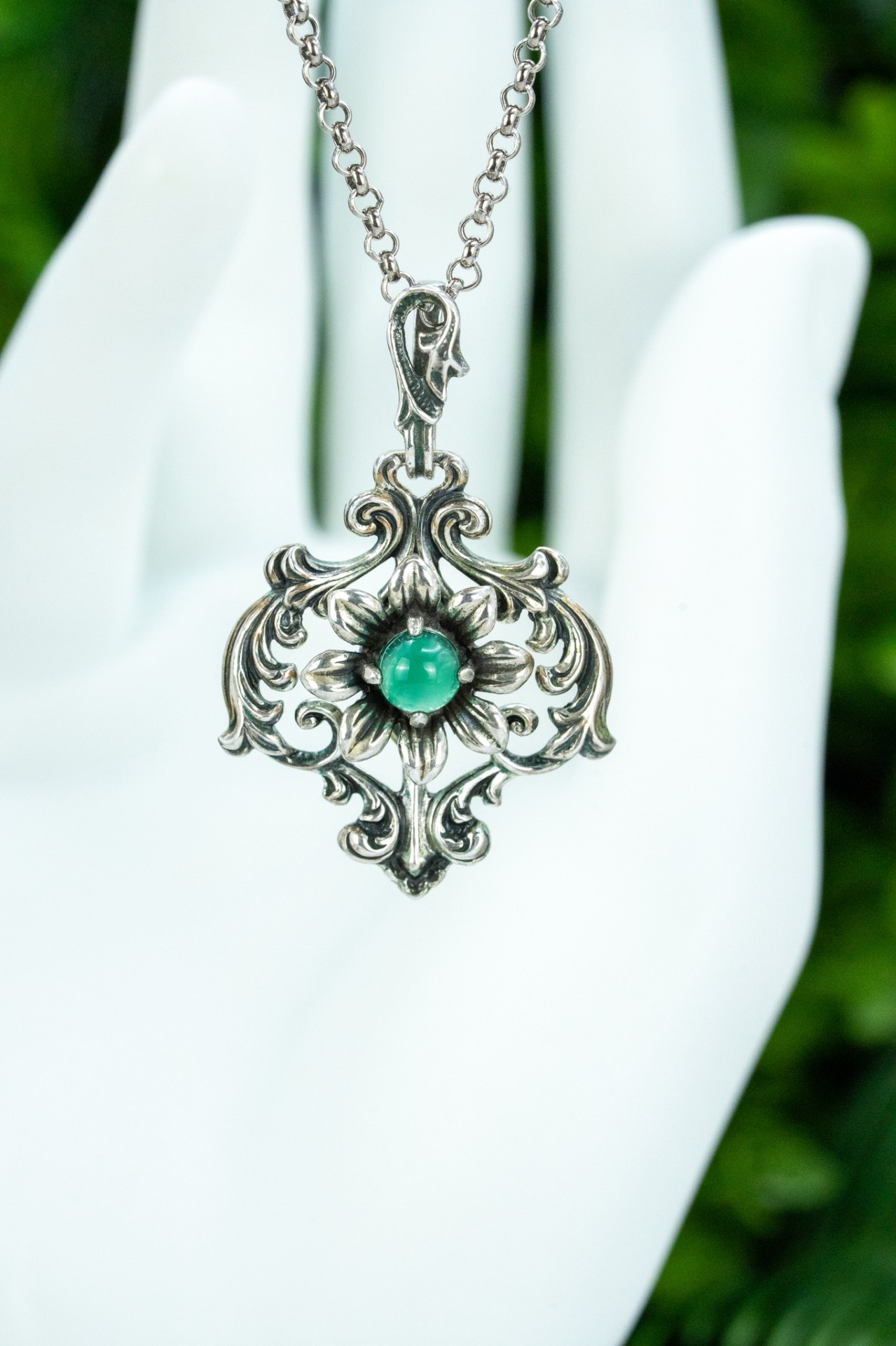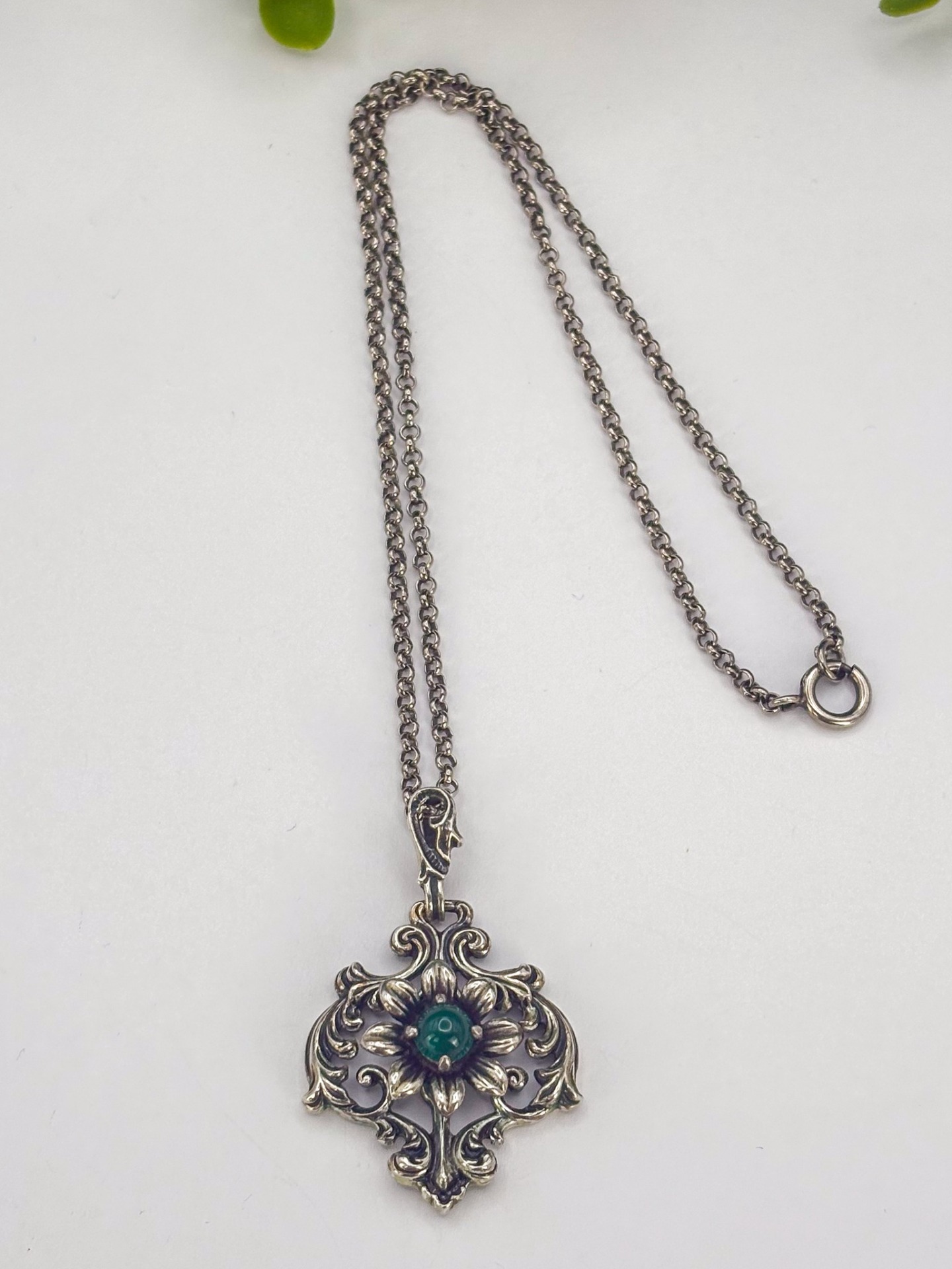 Lanț cu pandantiv vechi, din argint, cu "glass paste" verde, manufactură spectaculoasă în motiv floral.