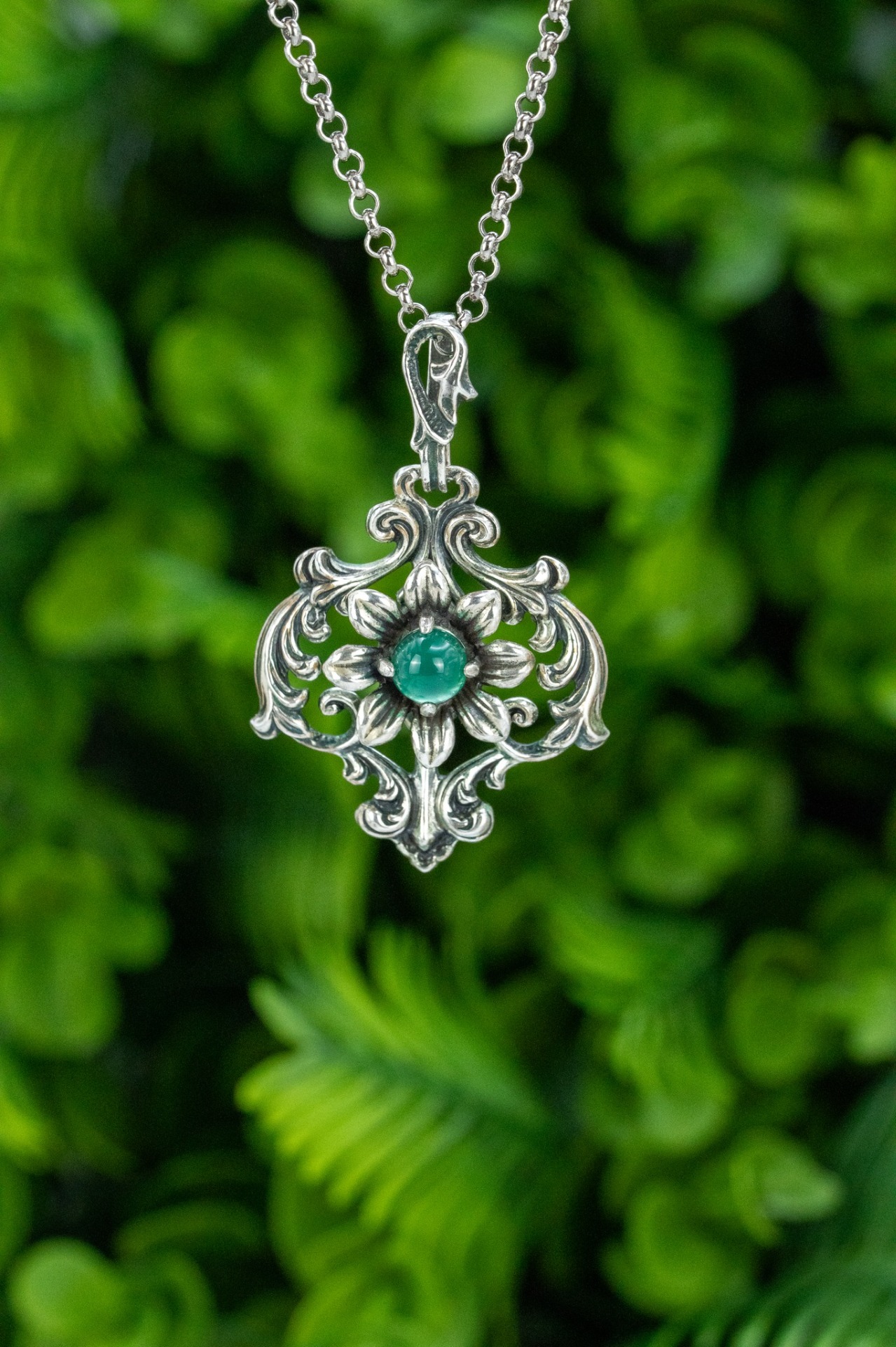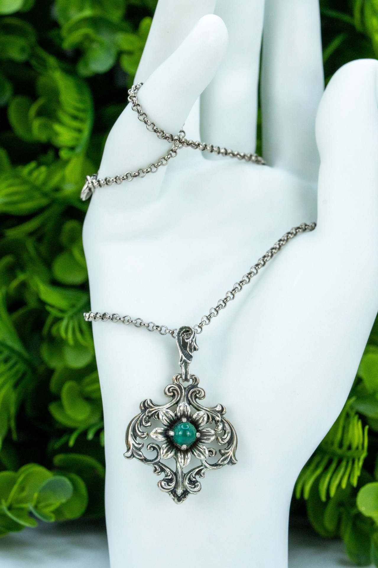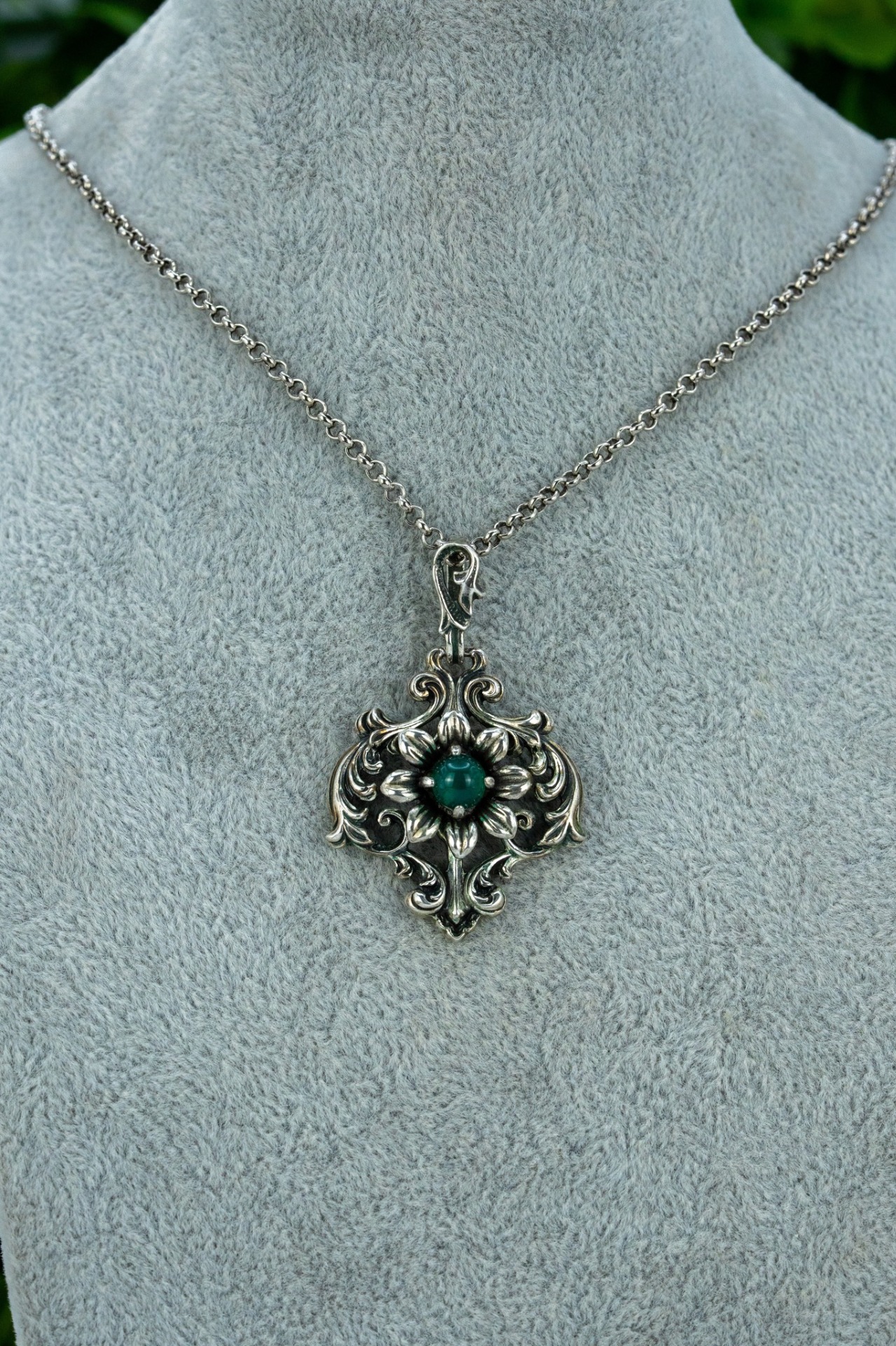 Lanț cu pandantiv vechi, din argint, cu "glass paste" verde, manufactură spectaculoasă în motiv floral.