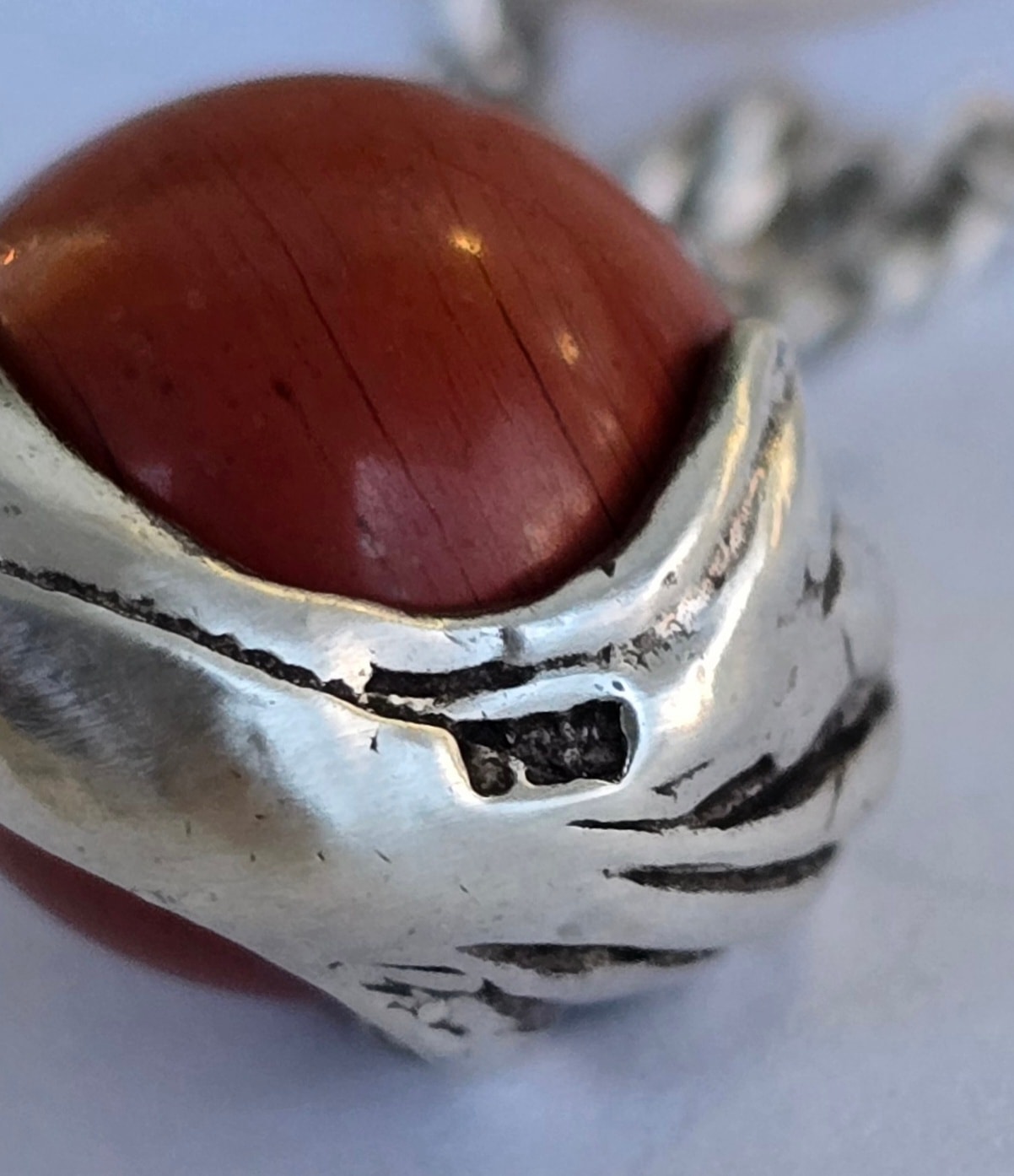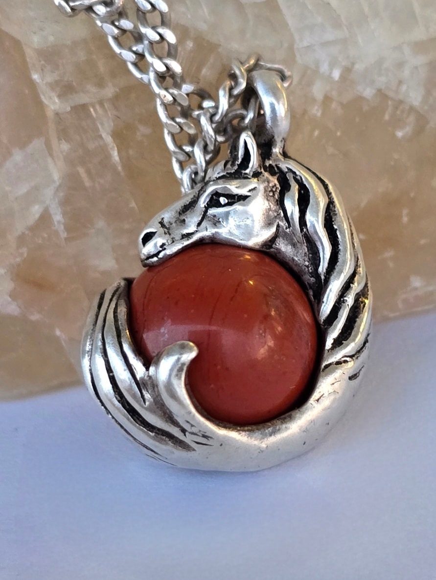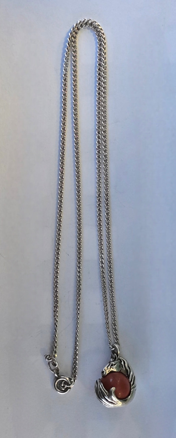 Lanț cu pandantiv vechi din argint, cu sferă mobilă din jasp roșu natural.