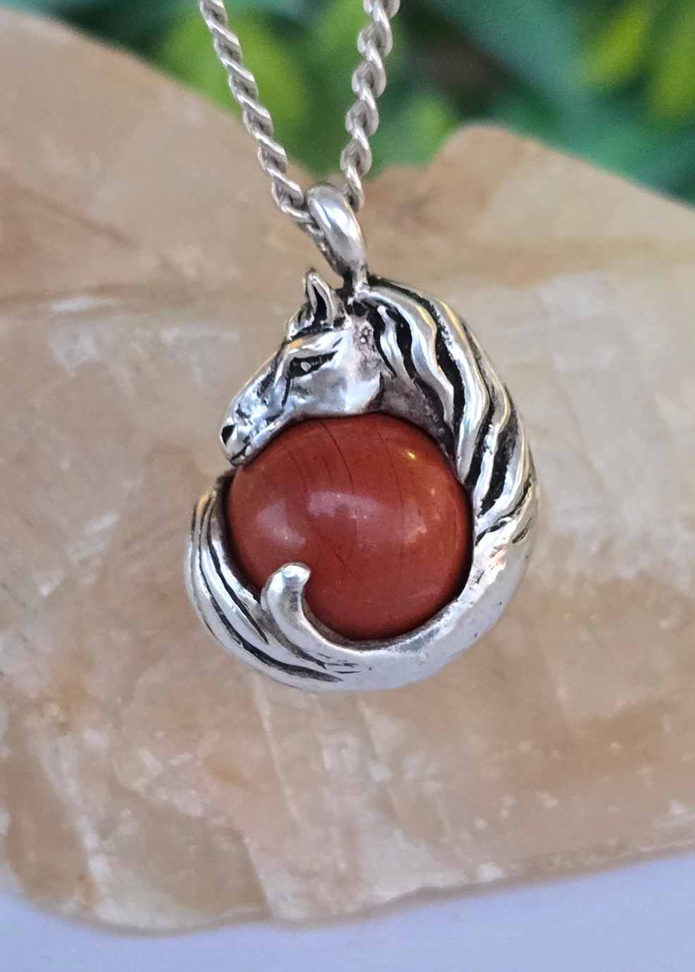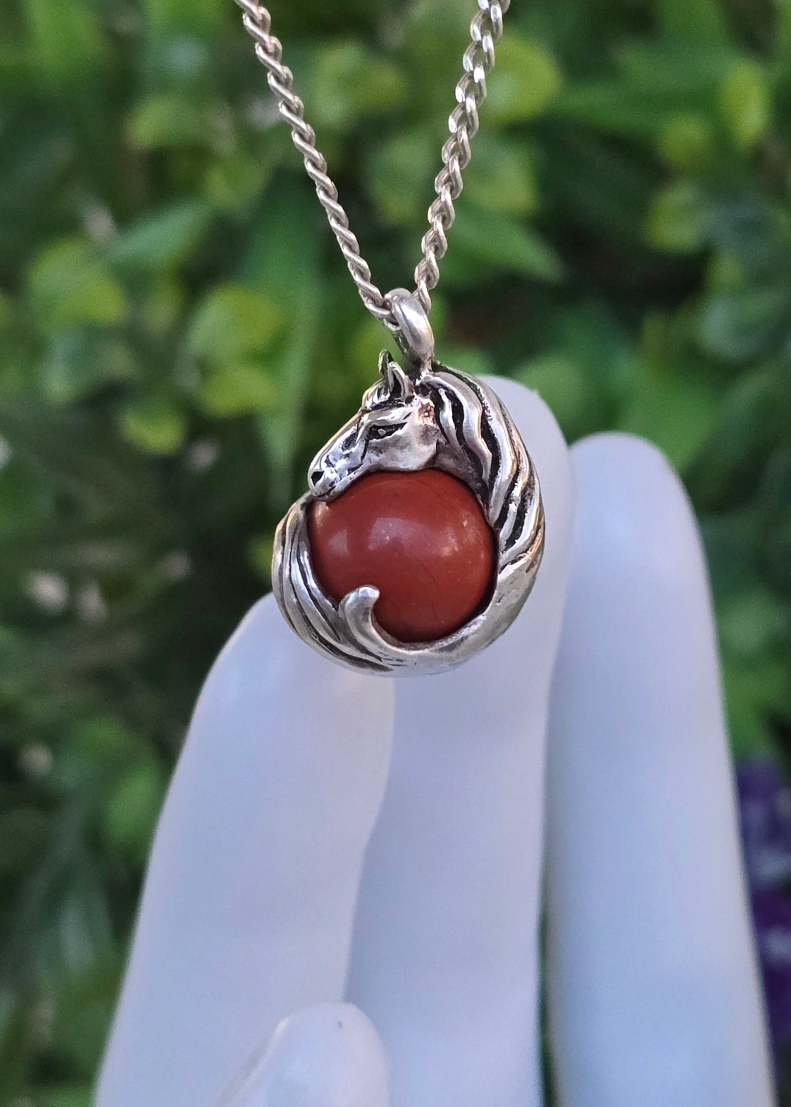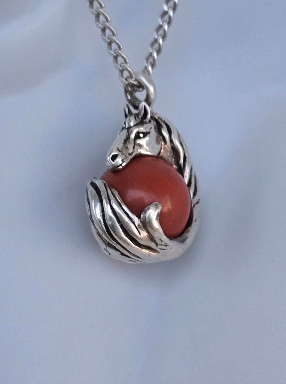 Lanț cu pandantiv vechi din argint, cu sferă mobilă din jasp roșu natural.