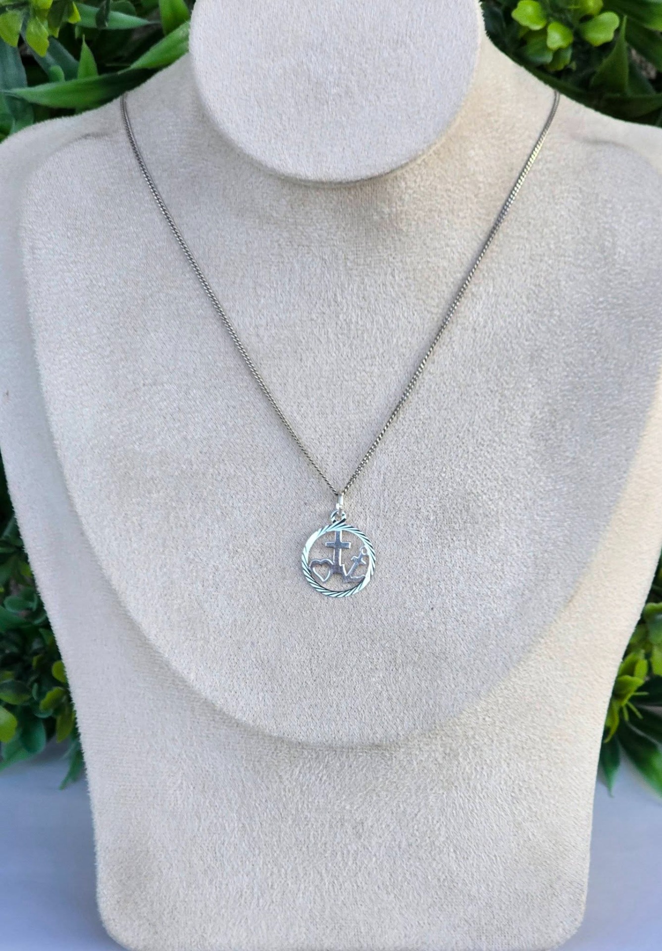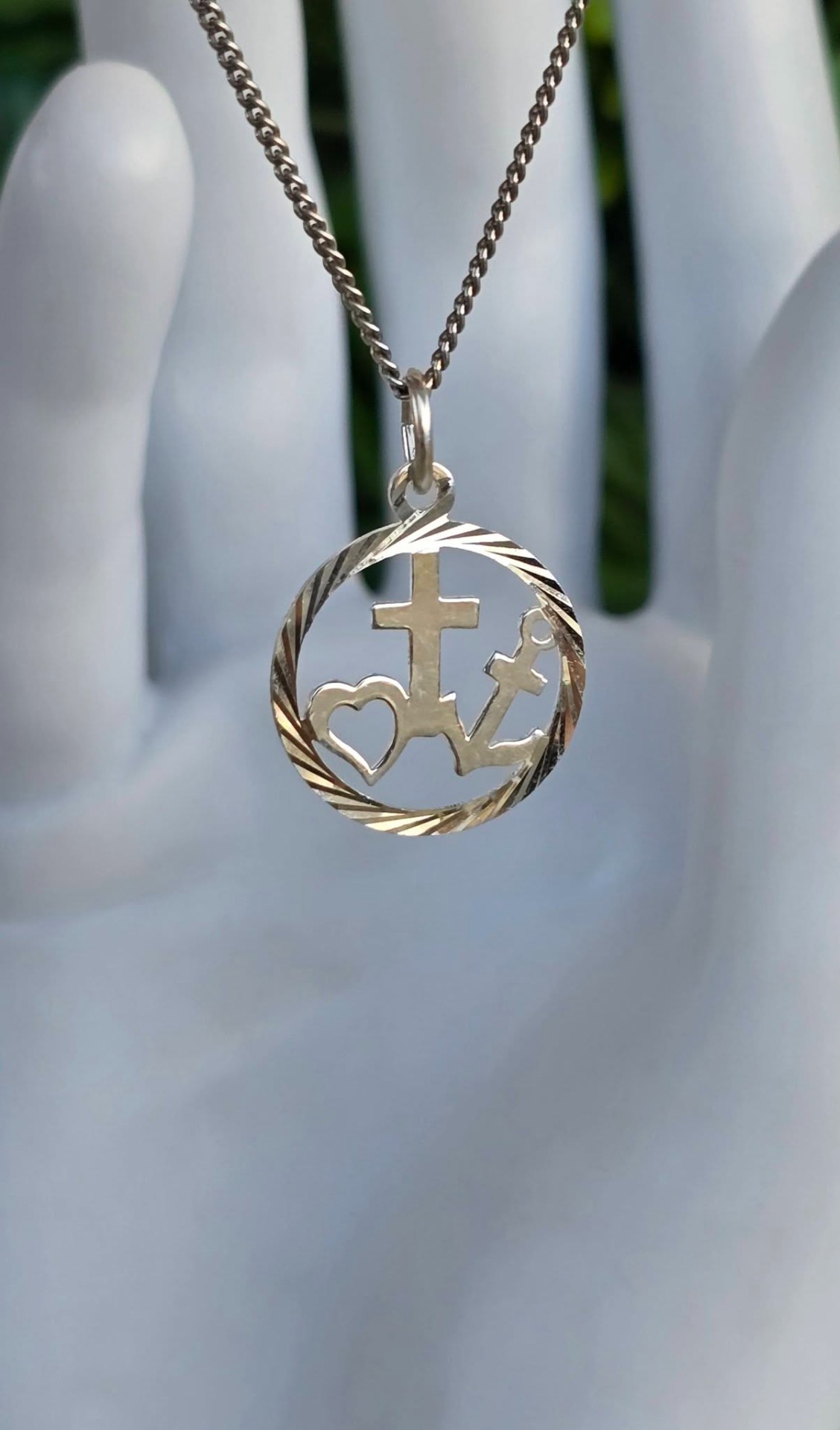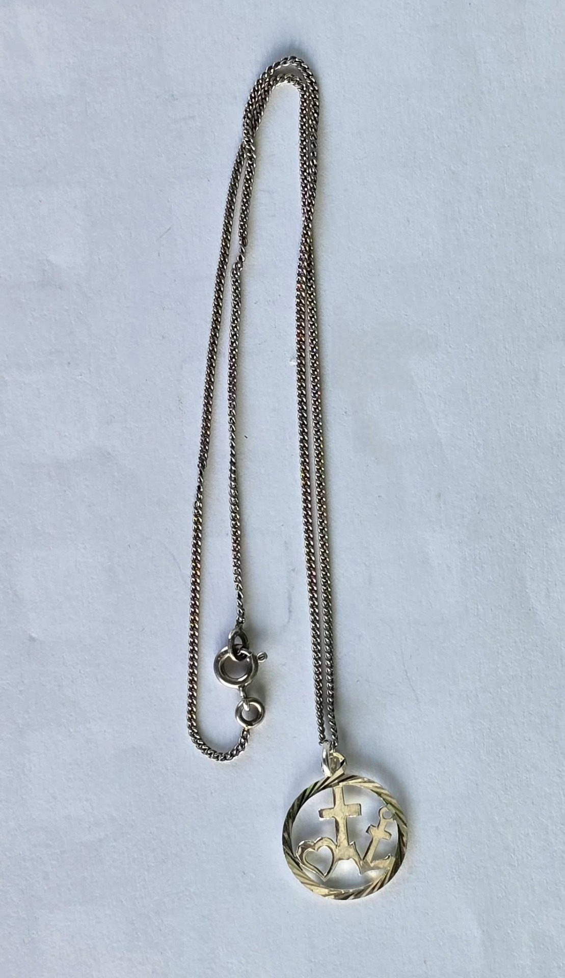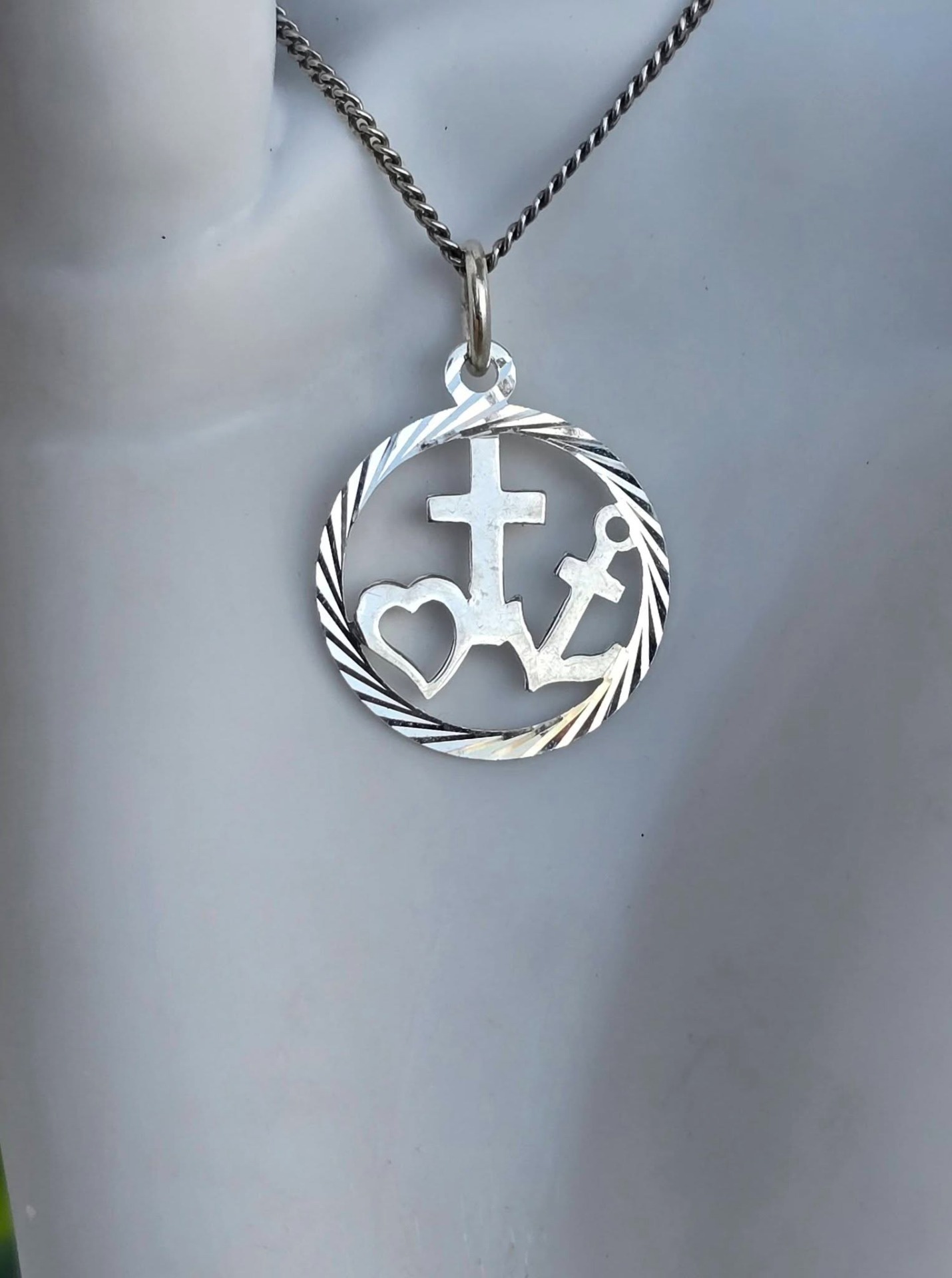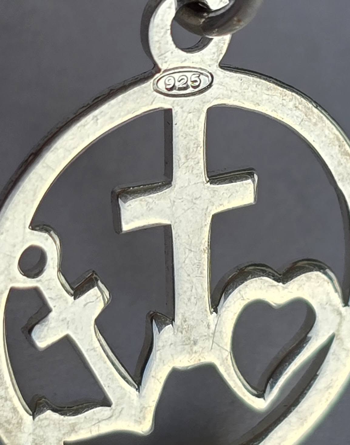 Lanț cu pandantiv vechi, din argint, cu triplă simbolistică: Credința (crucea), Speranța (ancora) și Iubirea (inima).