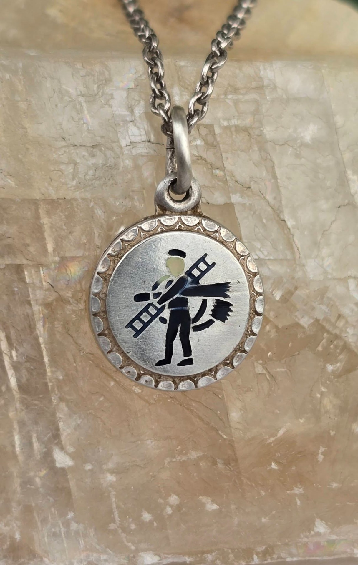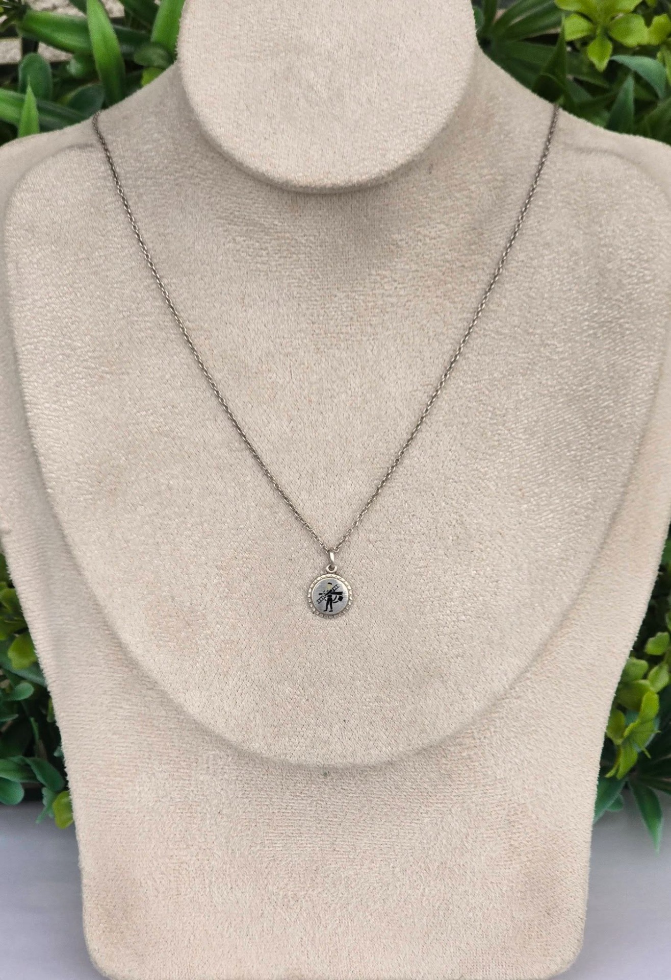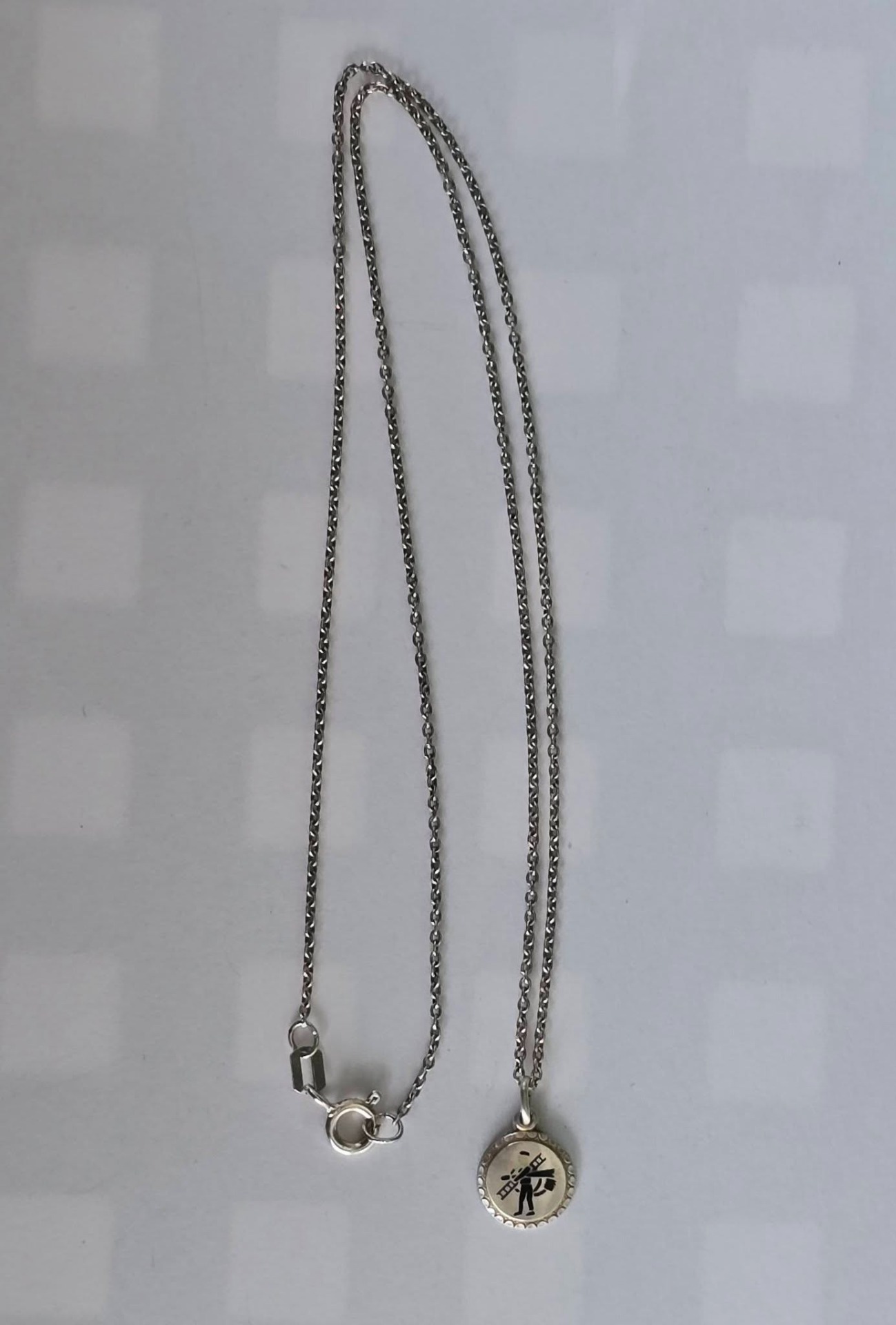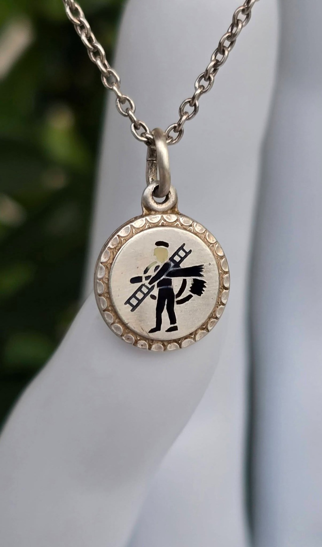 Lanț cu pandantiv vechi din argint, "lucky charm", rar, de colecție, cu email pictat manual, frumos stilizat cu un coșar, simbol clasic al norocului, manufactură de meșter austriac de la începutul sec.XX (anii 1900-1915, Imp. Austro-Ungar).