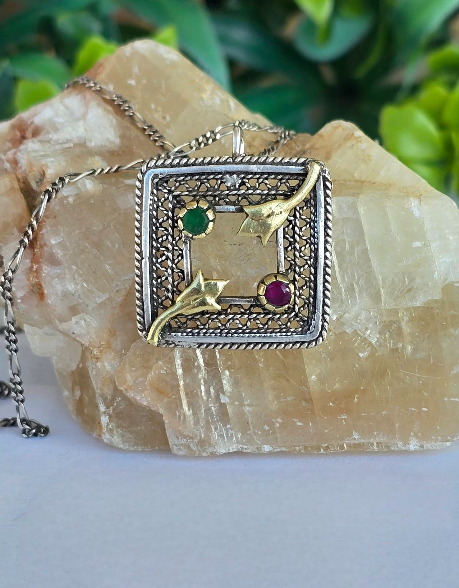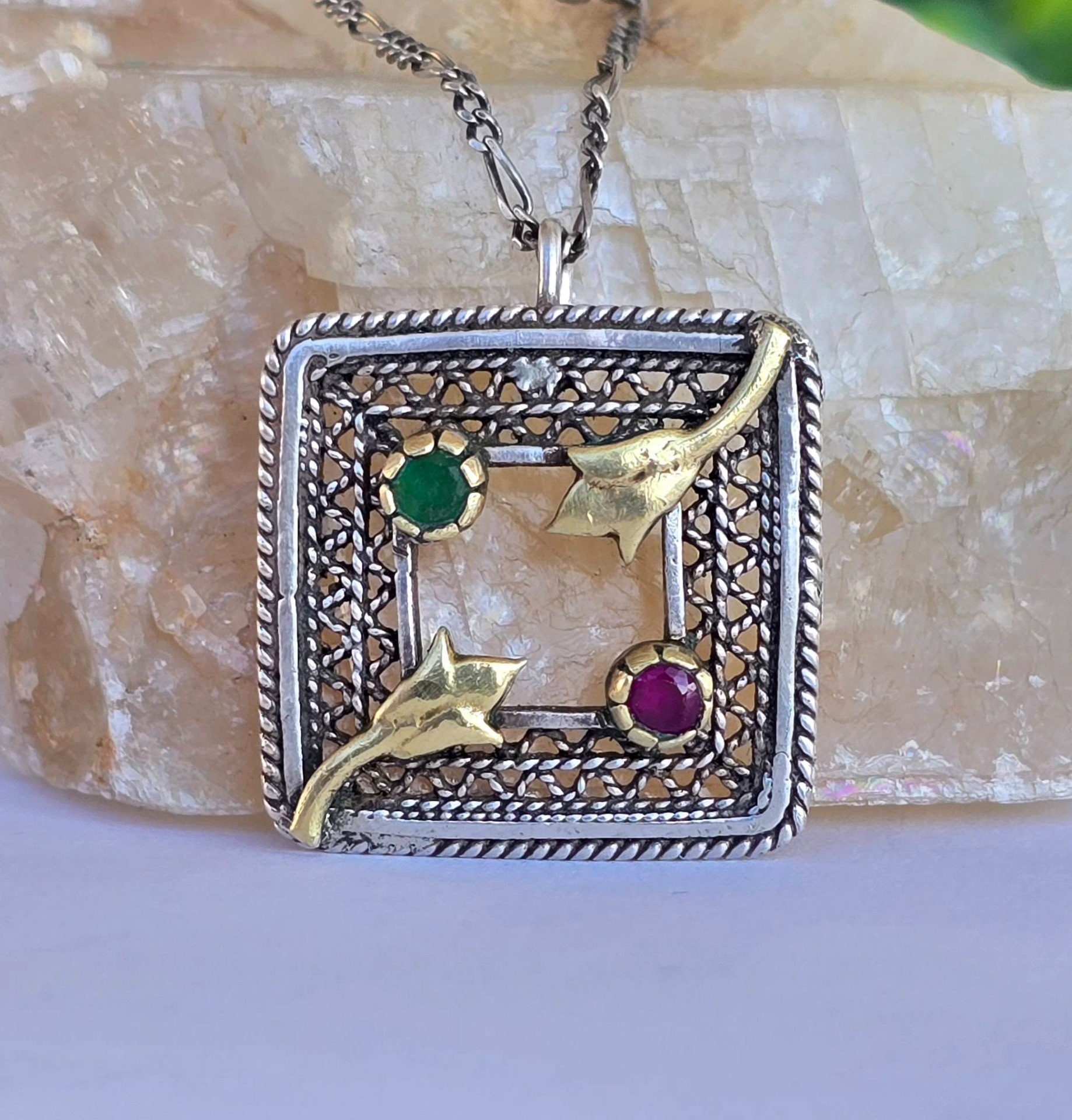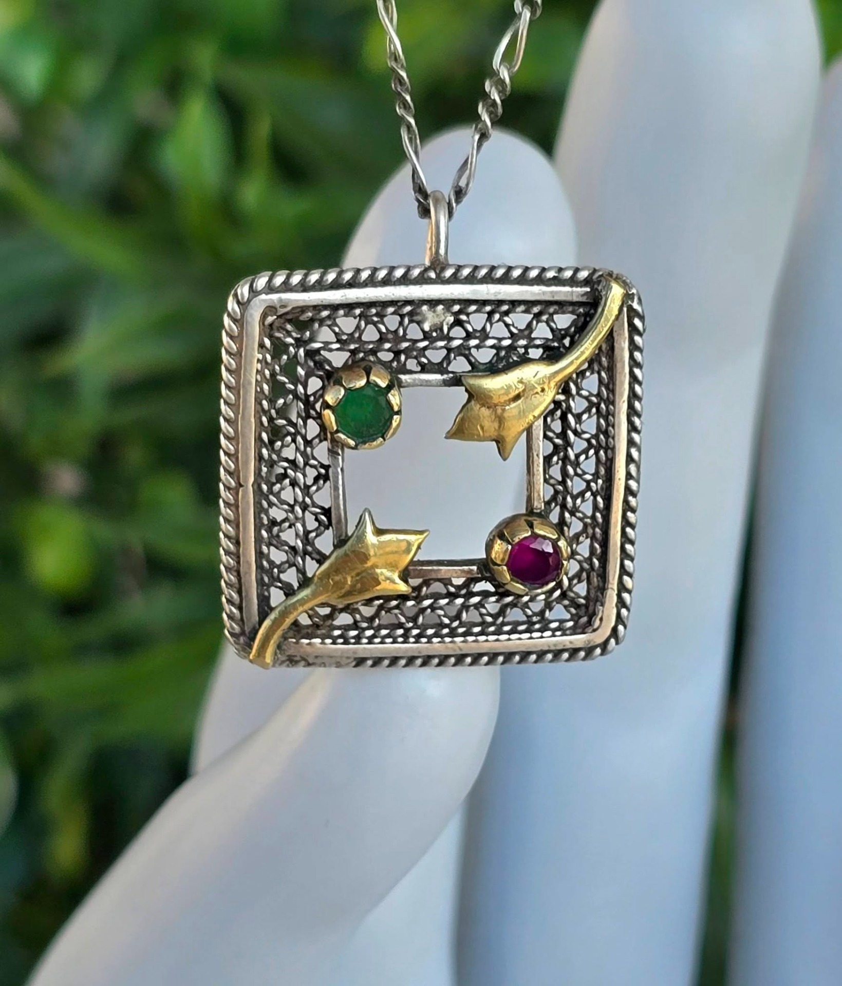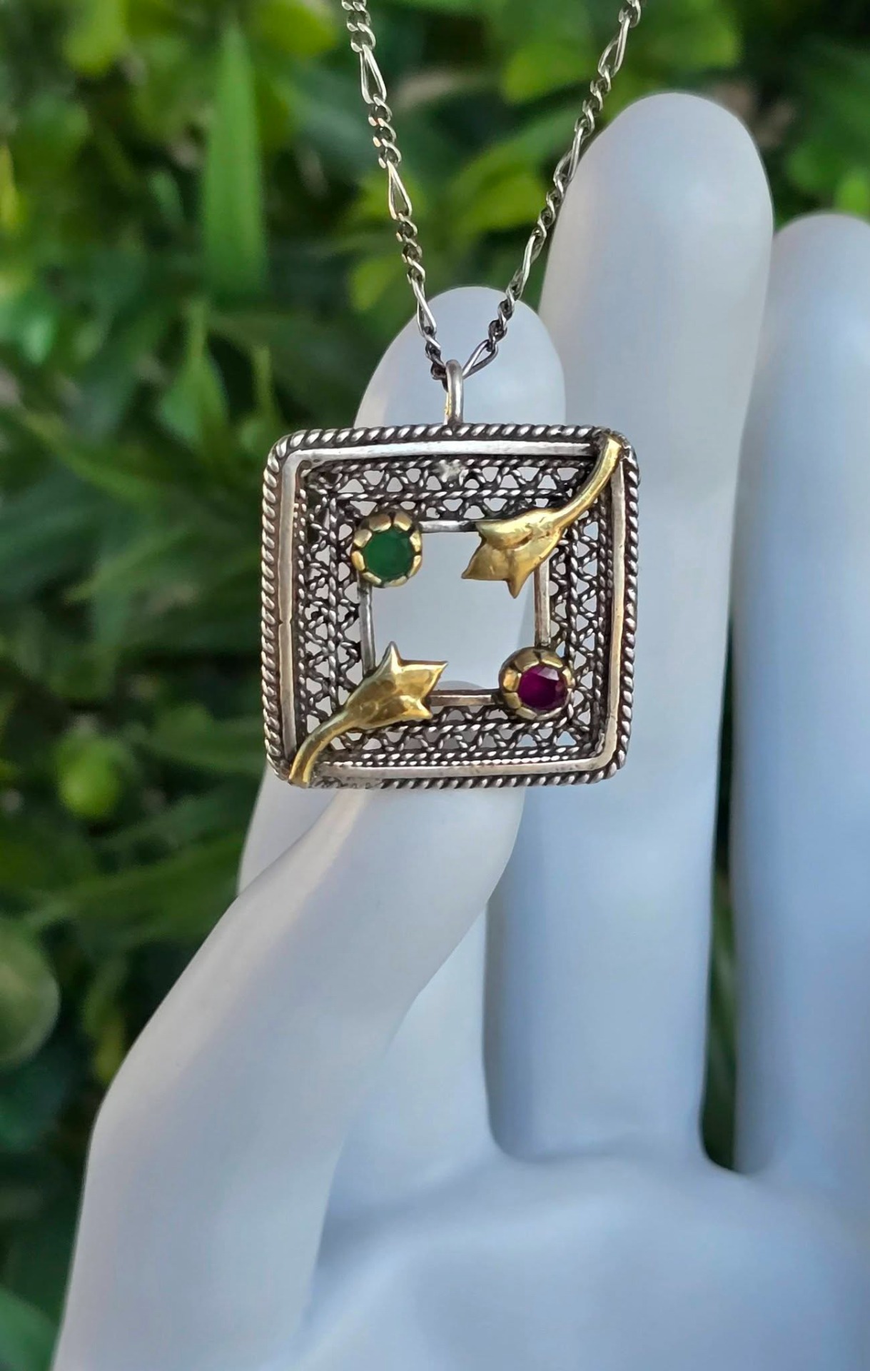 Lanț cu pandantiv vechi superb, din argint, cu rubin și smarald naturale, manufactură în filigran.