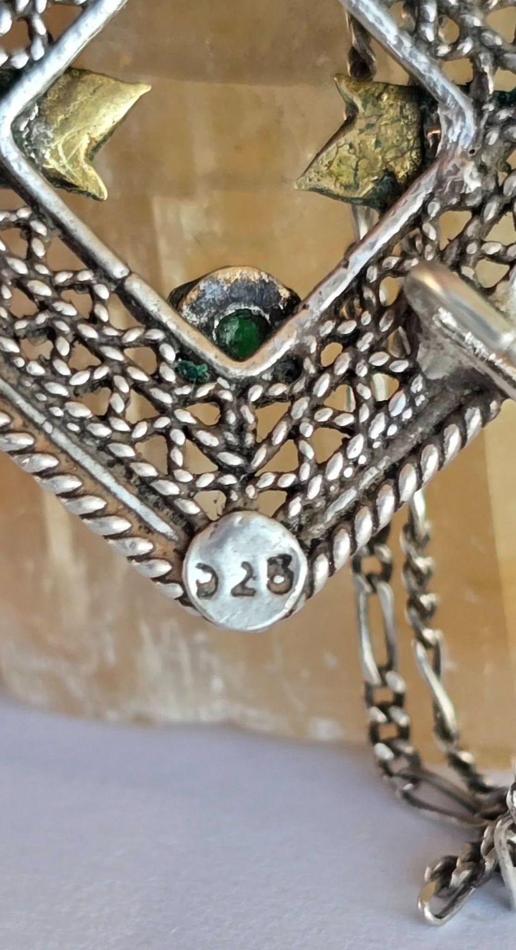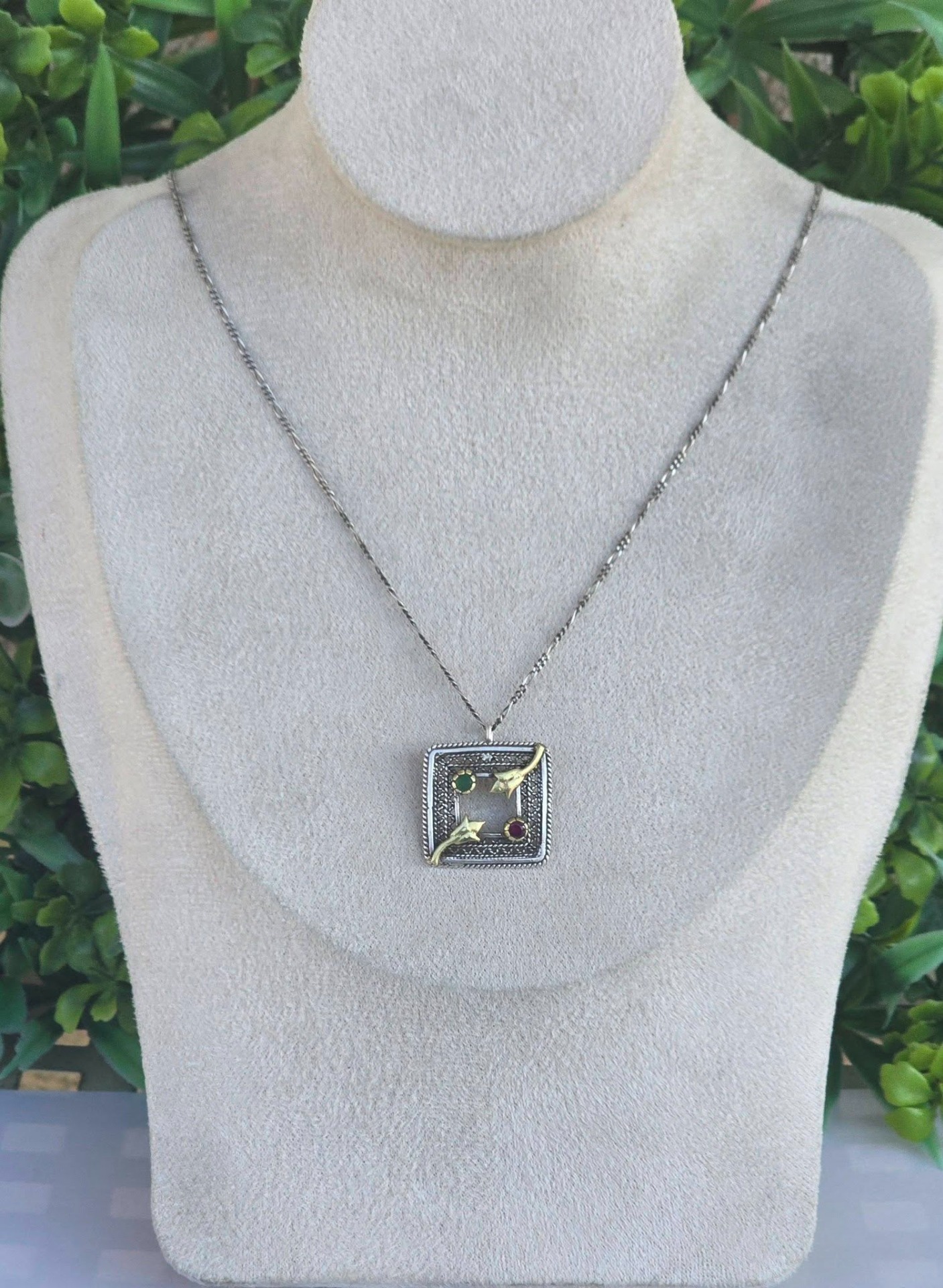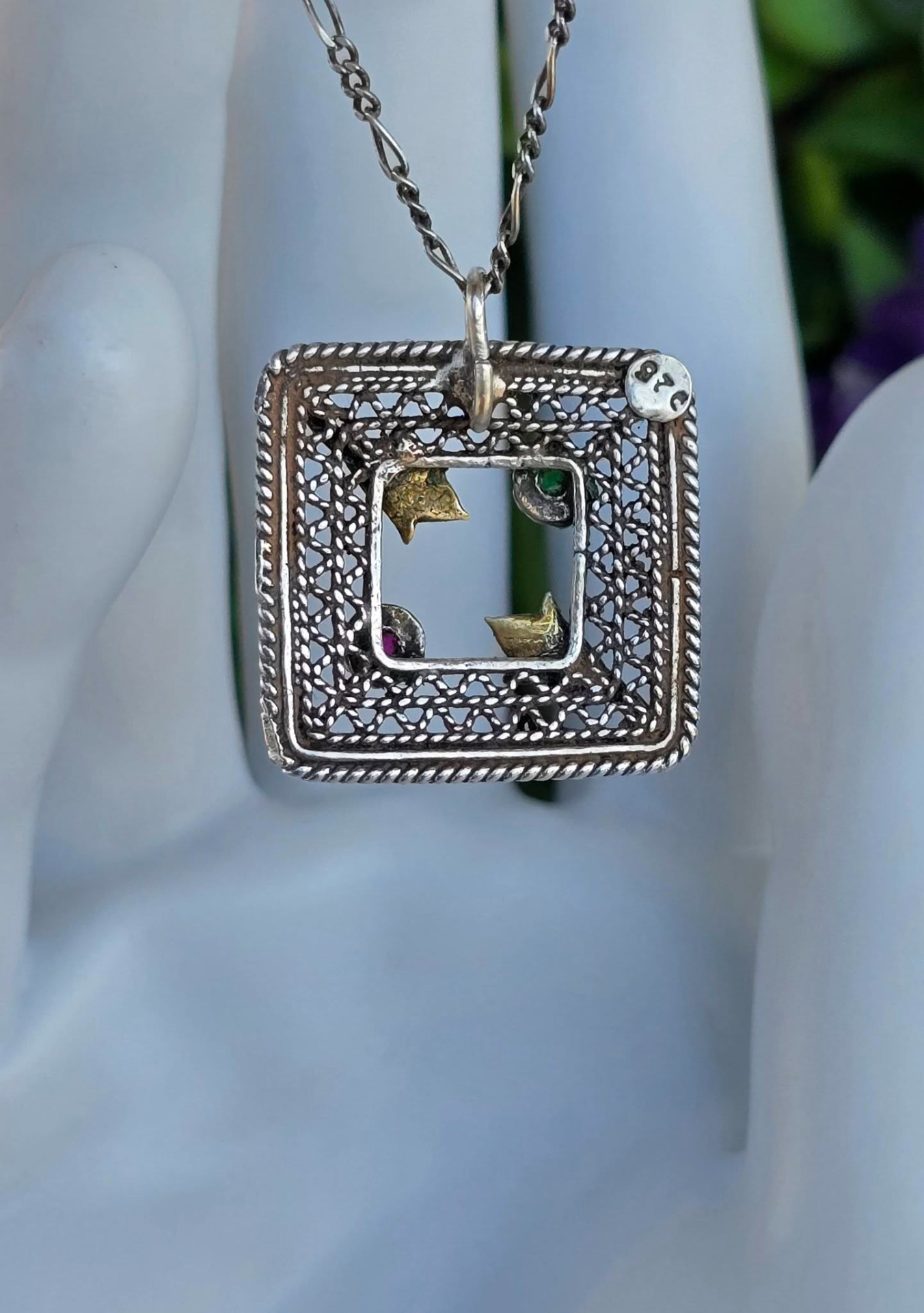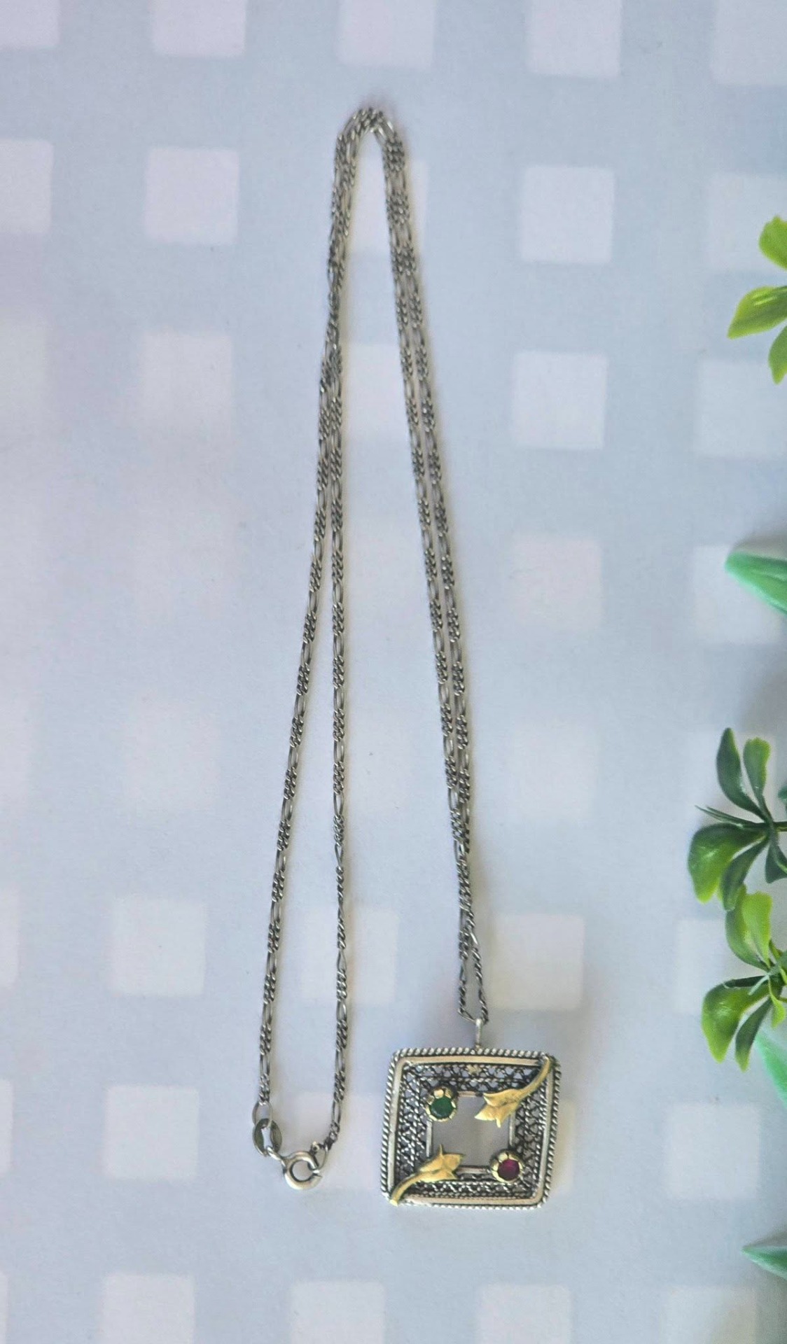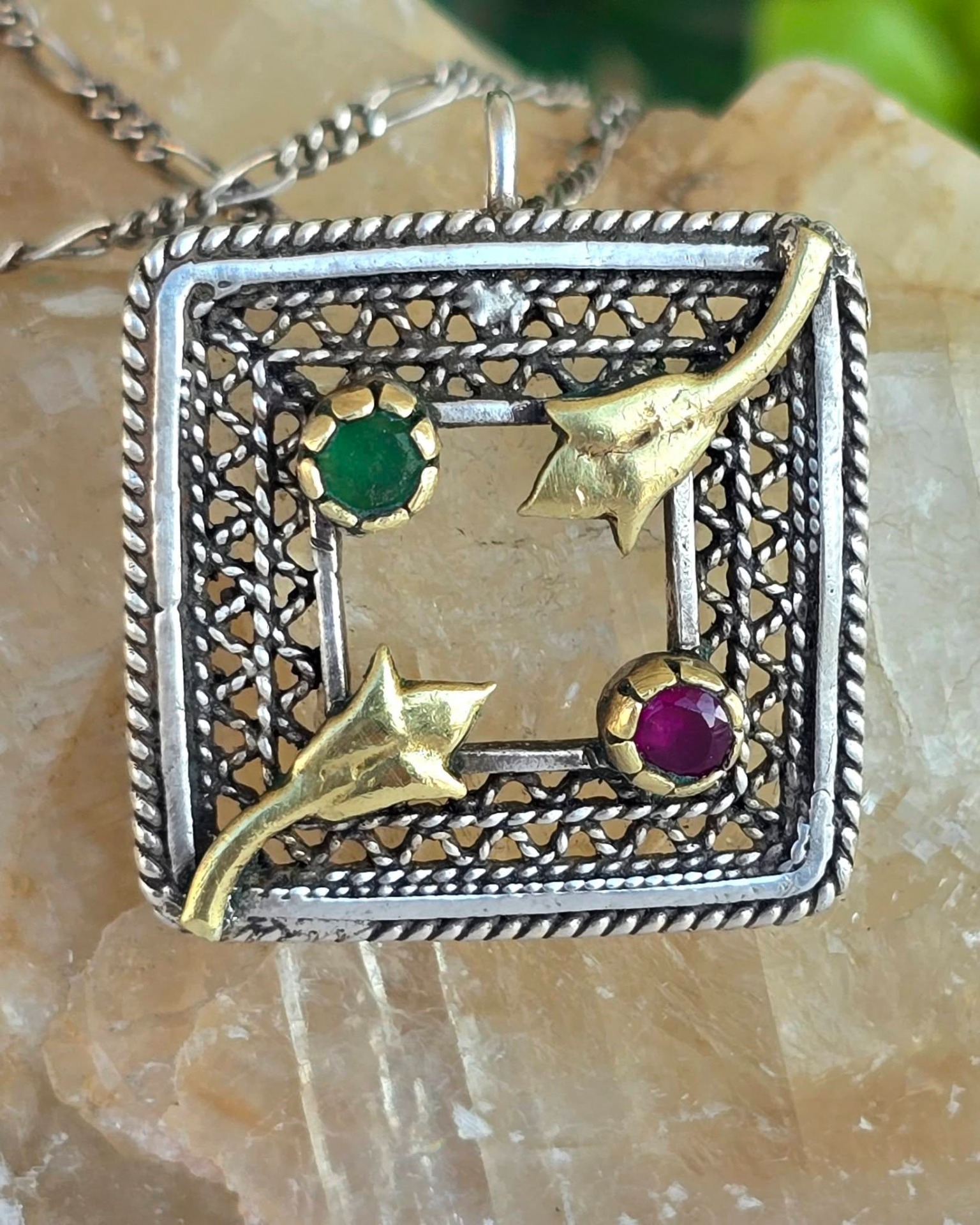Lanț cu pandantiv vechi superb, din argint, cu rubin și smarald naturale, manufactură în filigran.