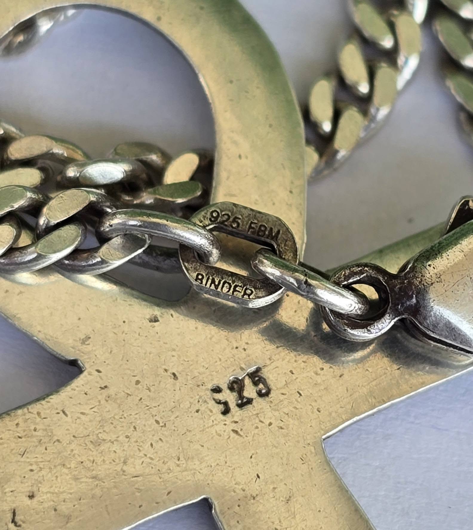 Pandantivul prezintă marcaj de argint 925 și lanțul marcaj de argint 925 și marcaj de meșter (Friedrich Binder-artizan german recunoscut pentru calitatea lanțurilor, cu o istorie care începe la 1910).