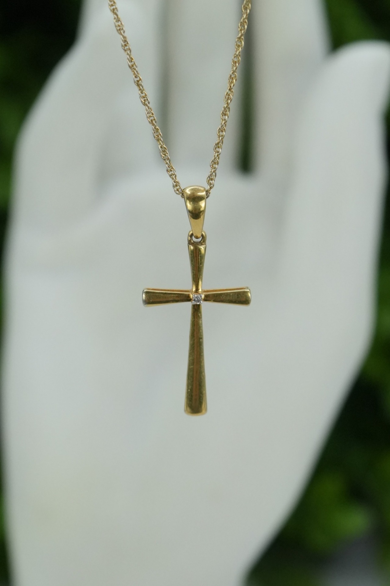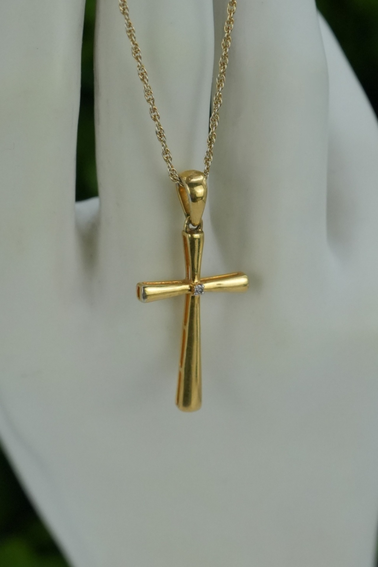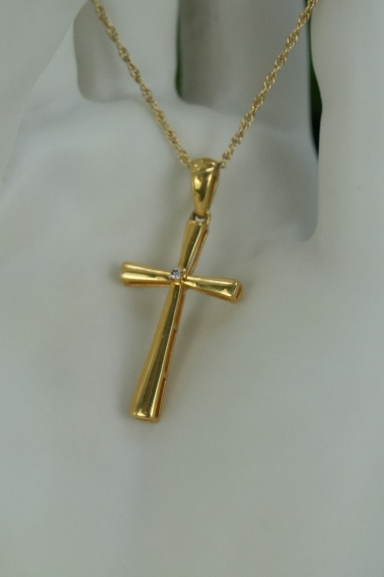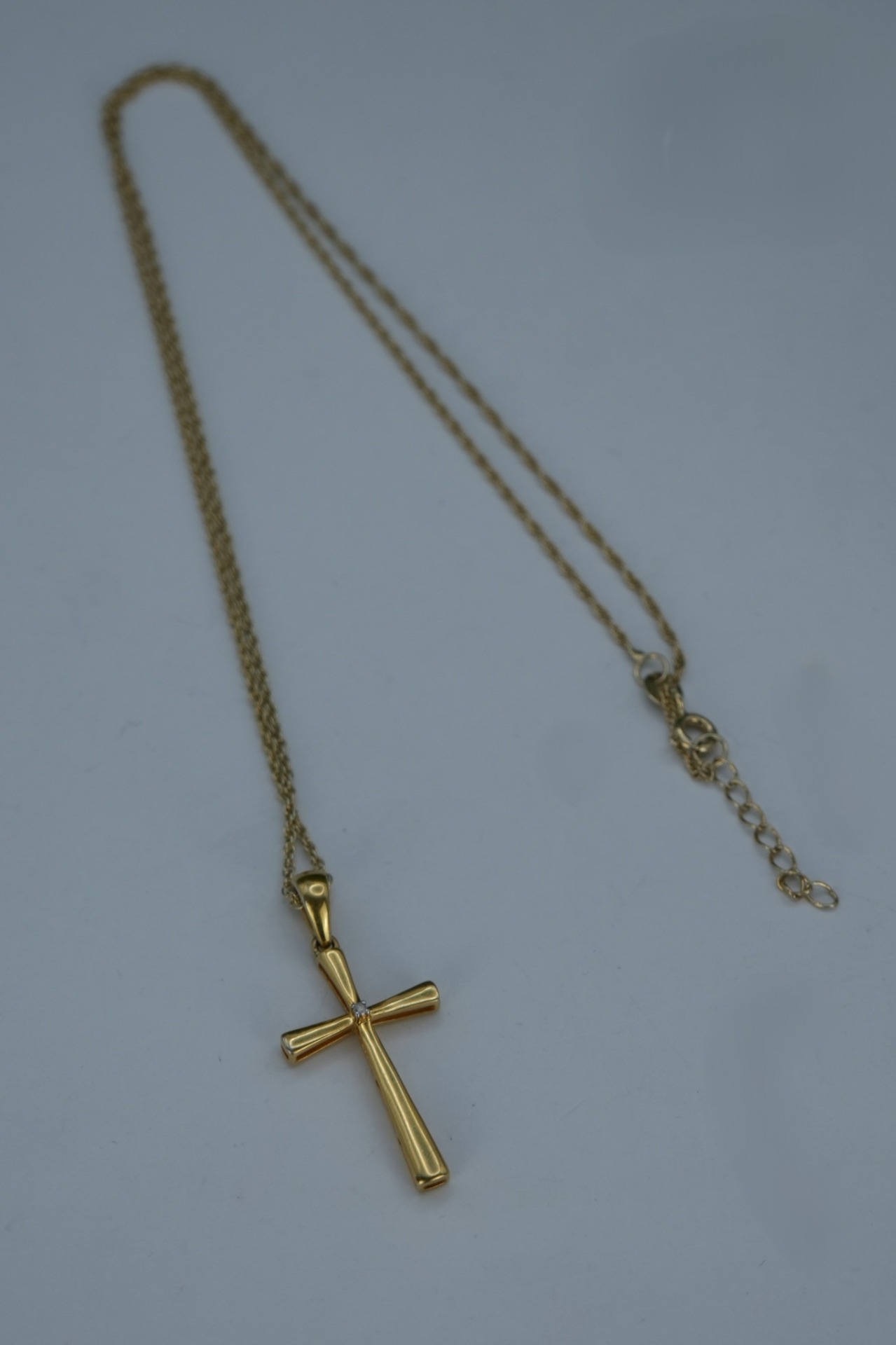 Lanț lung cu pandantiv-cruce vechi, din argint aurit, cu diamant natural.