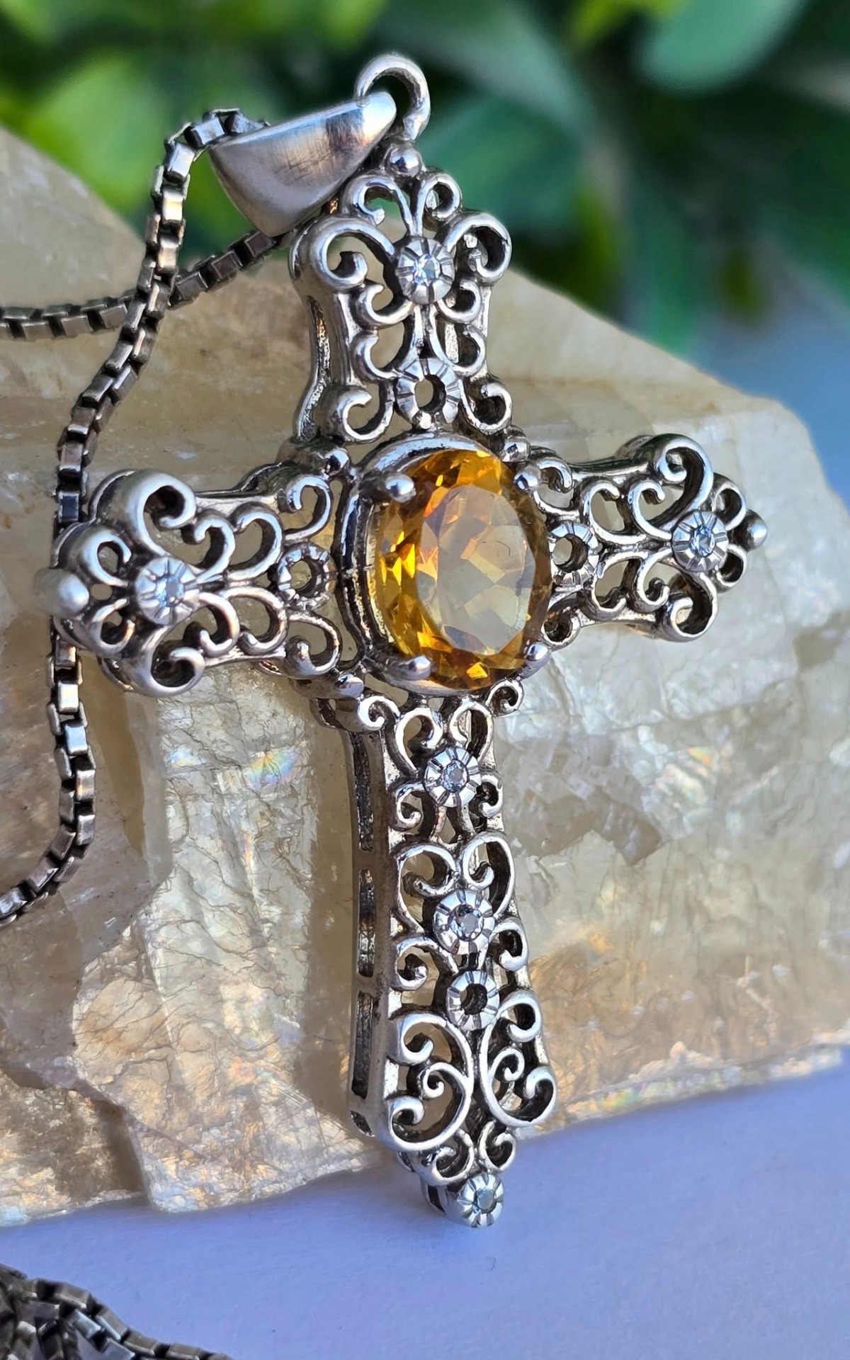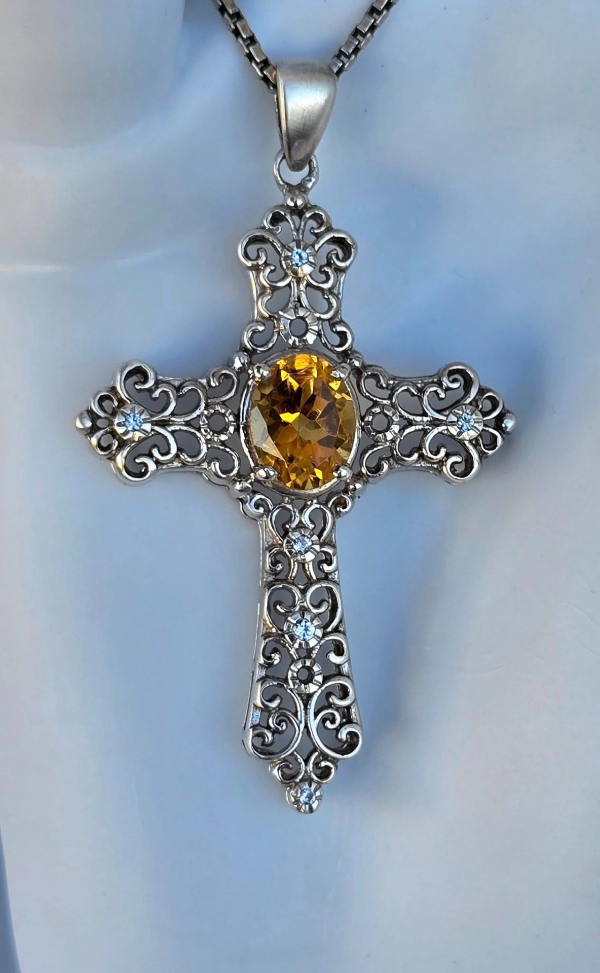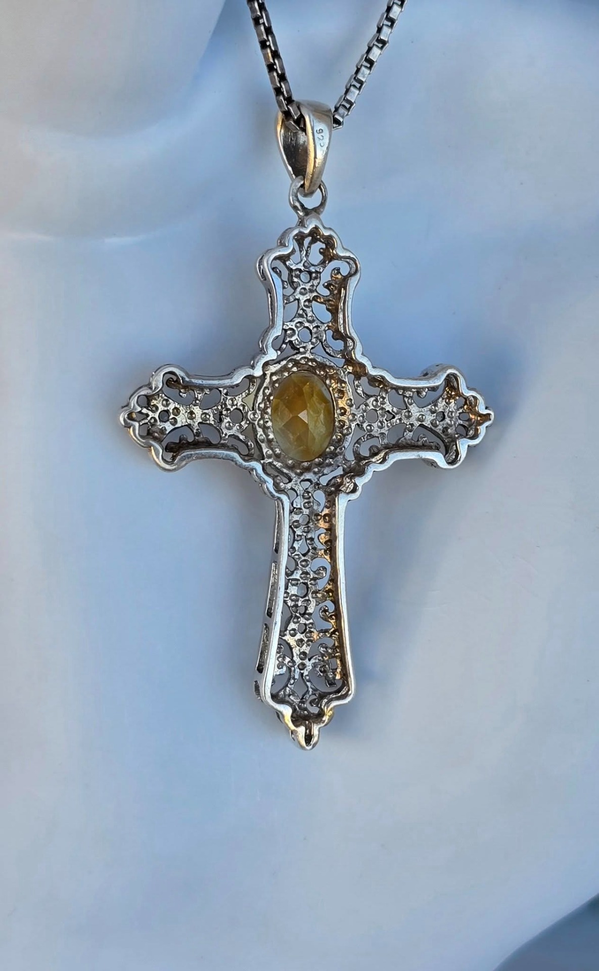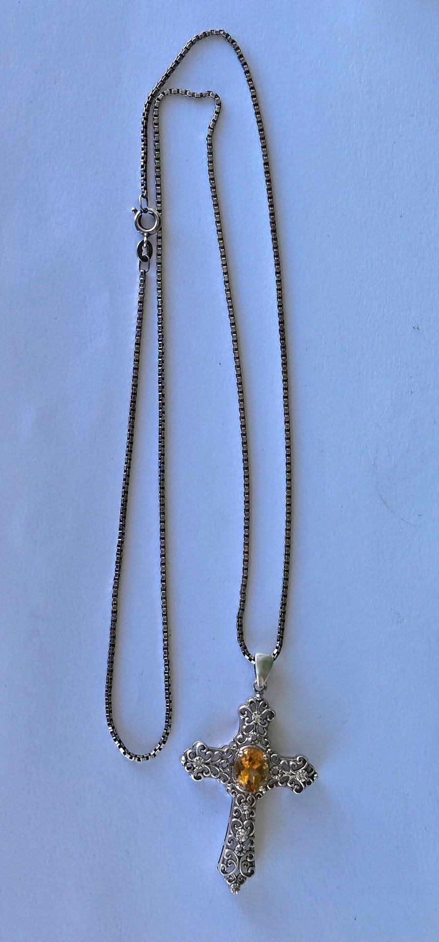 Lanț lung cu pandantiv-cruce vechi, din argint, cu citrin și 6 safire albe naturale, manufactură deosebită în filigran.