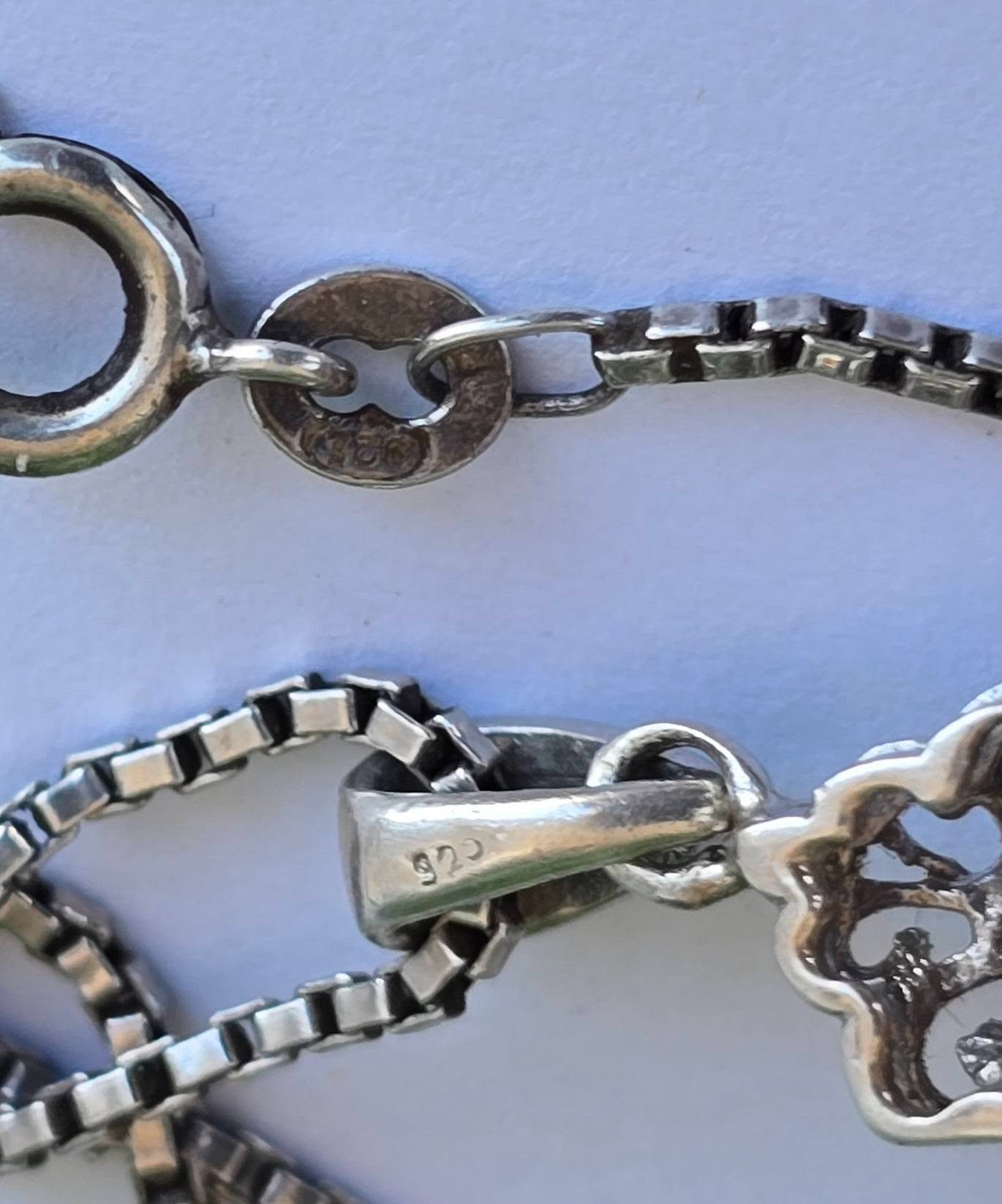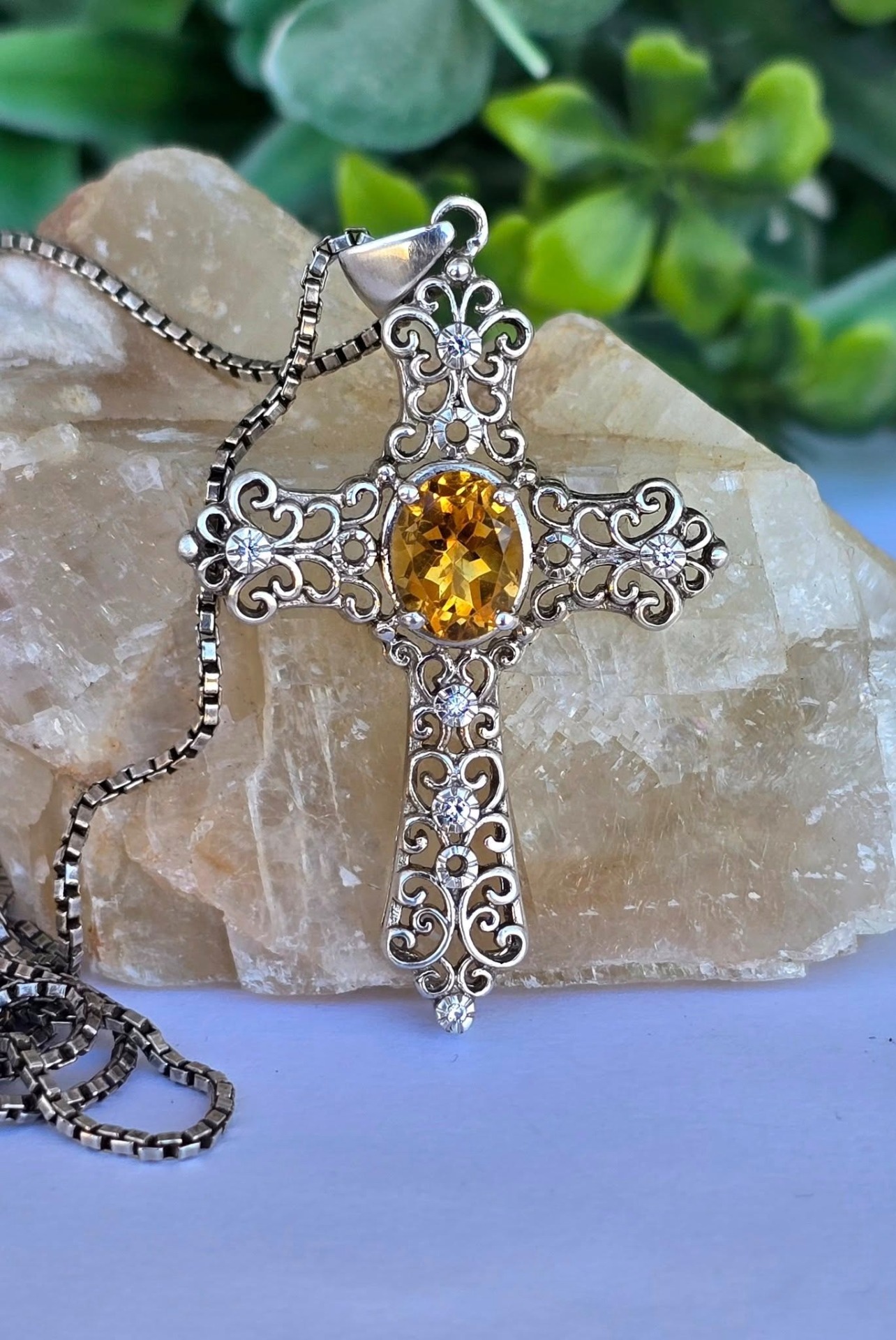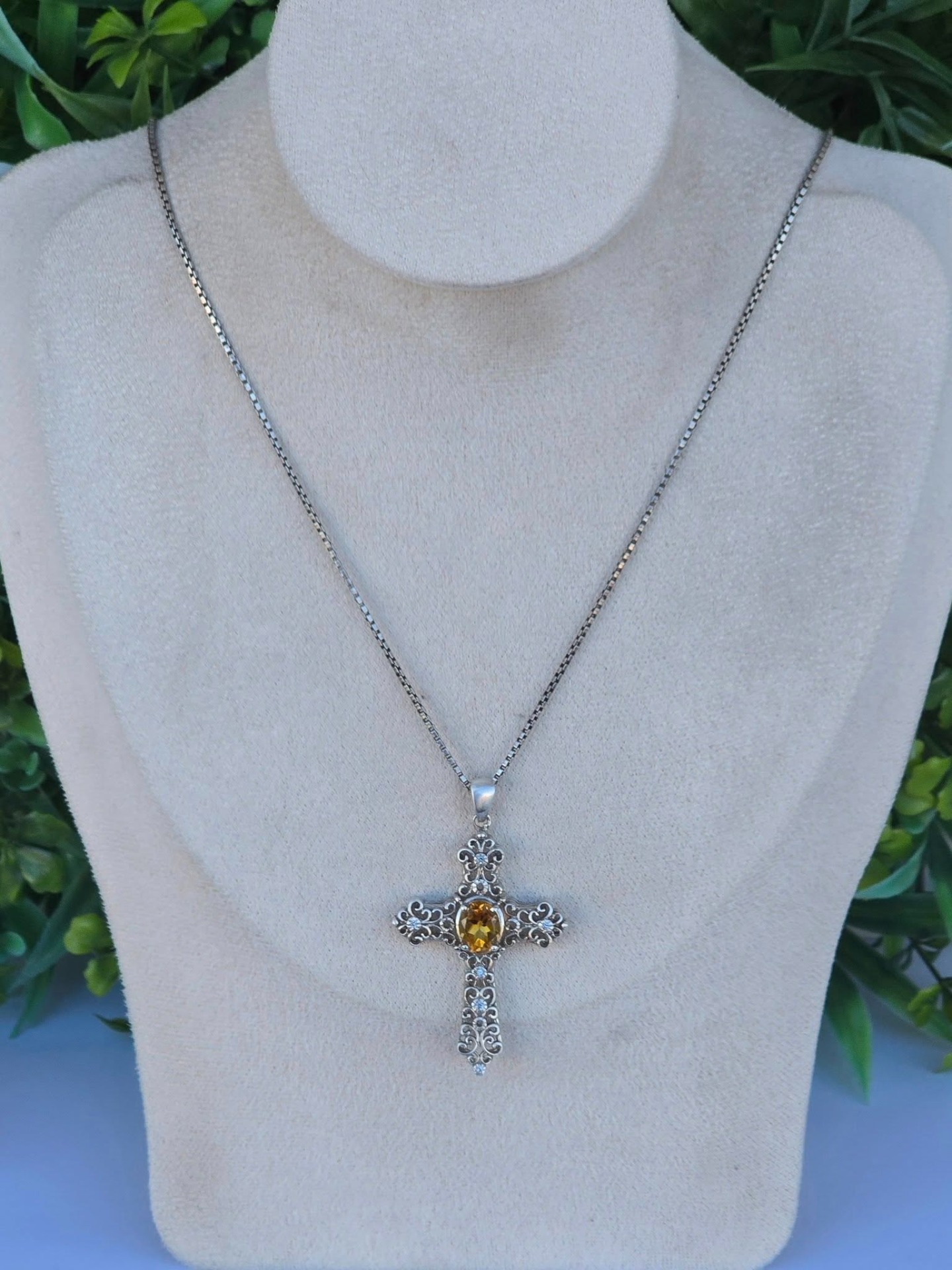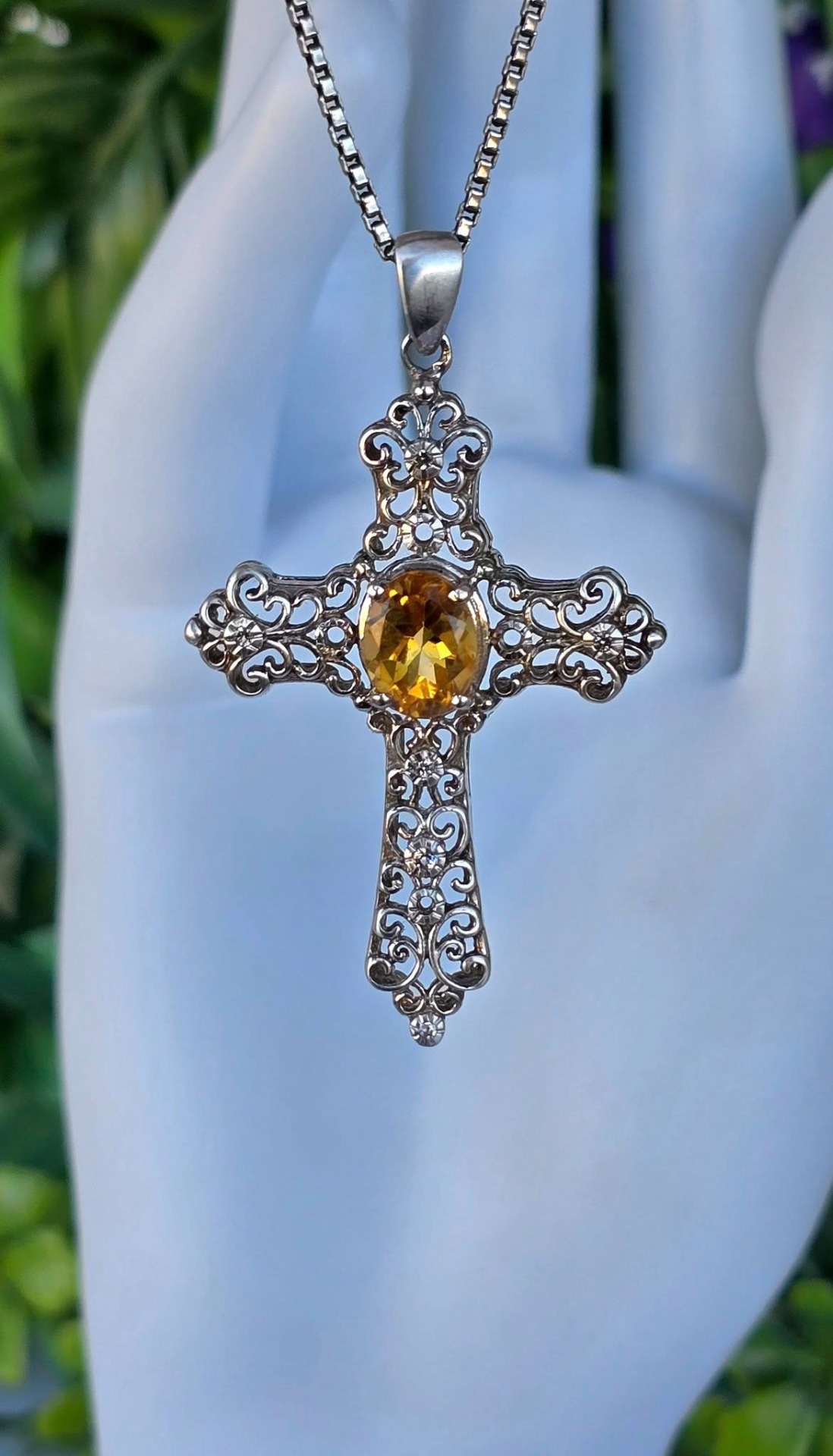 Lanț lung cu pandantiv-cruce vechi, din argint, cu citrin și 6 safire albe naturale, manufactură deosebită în filigran.