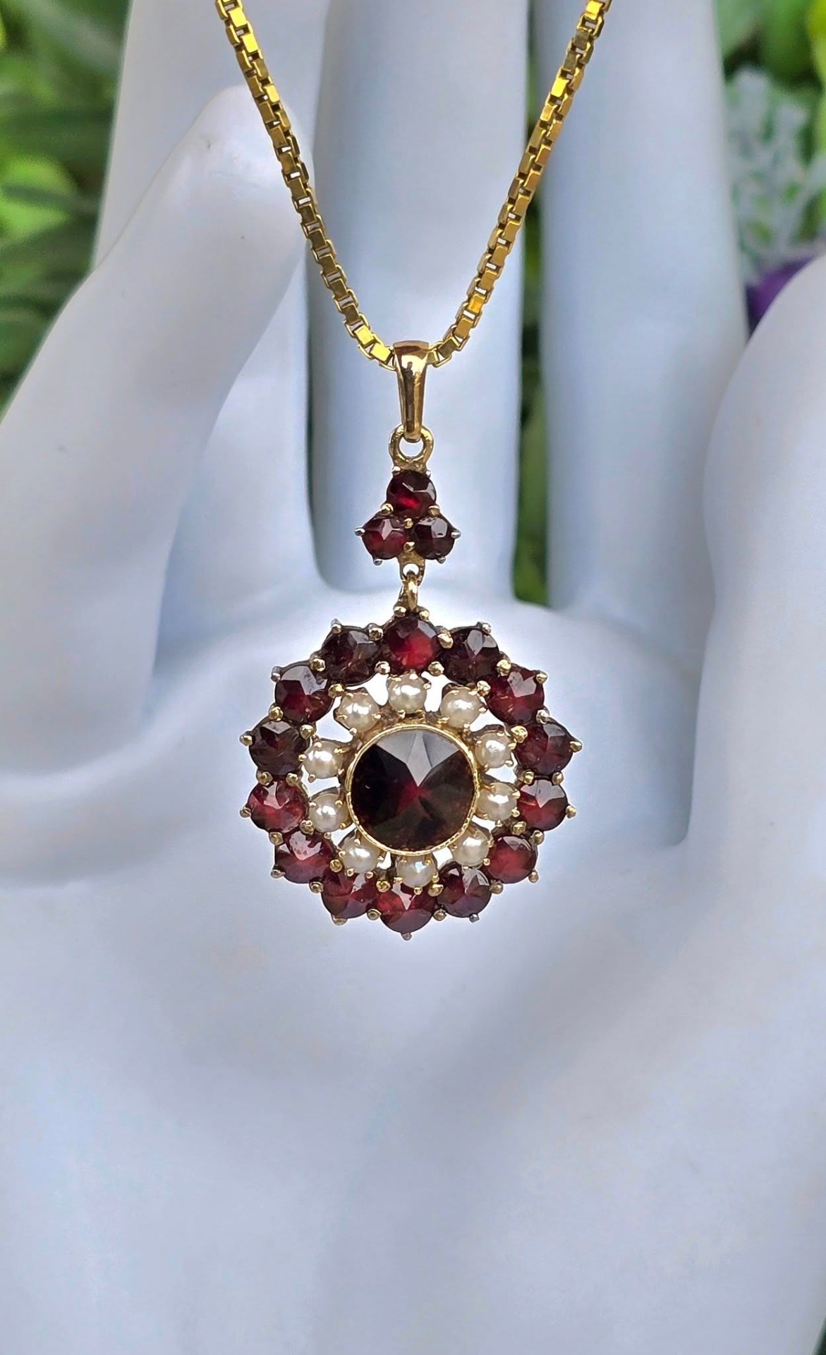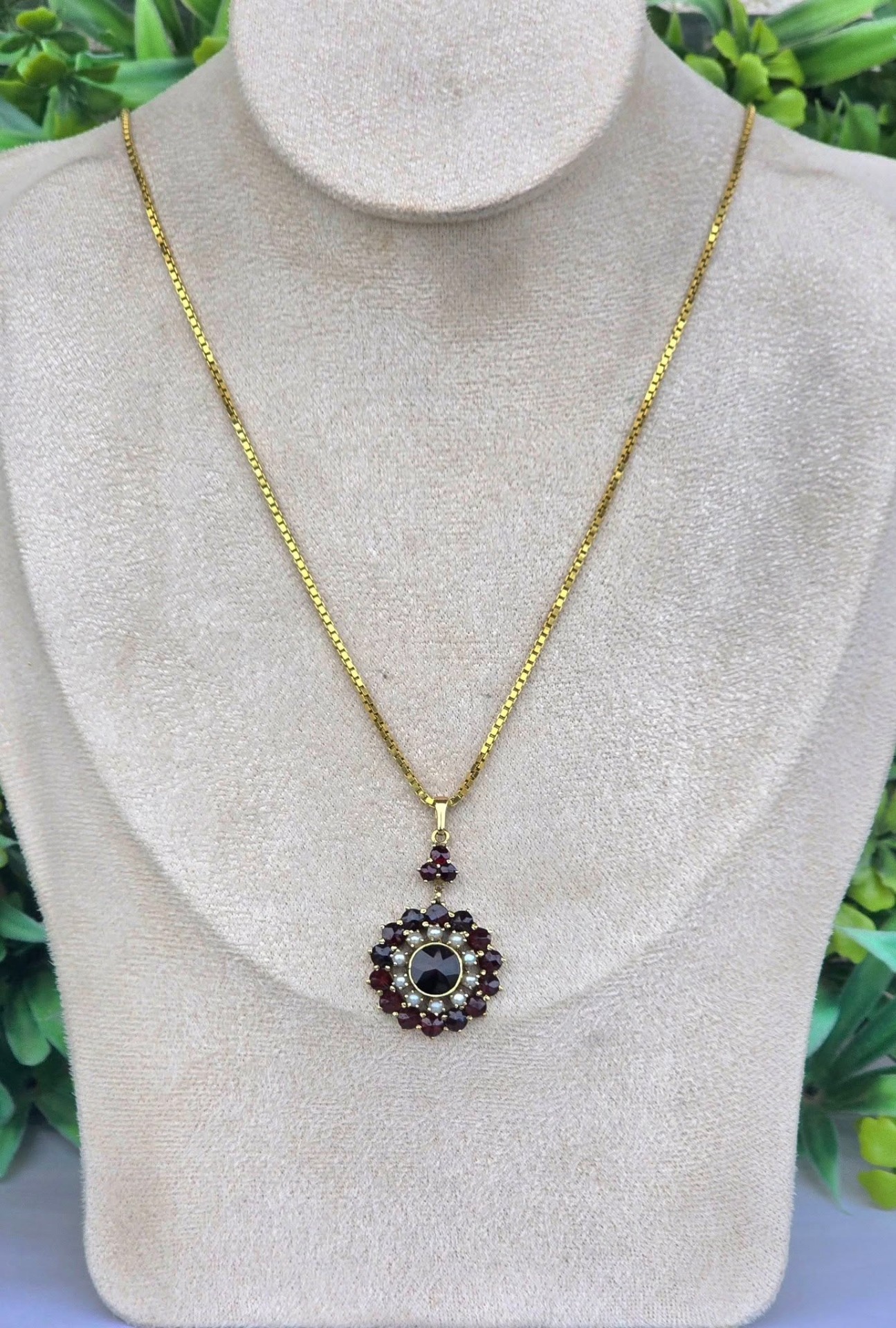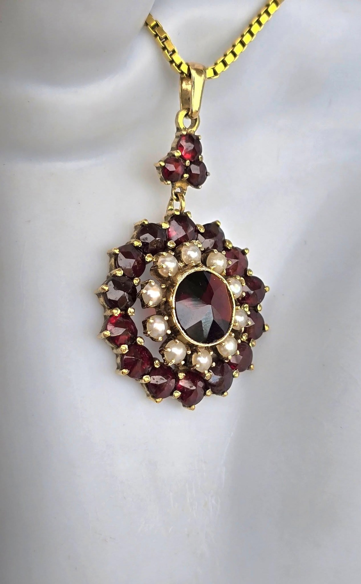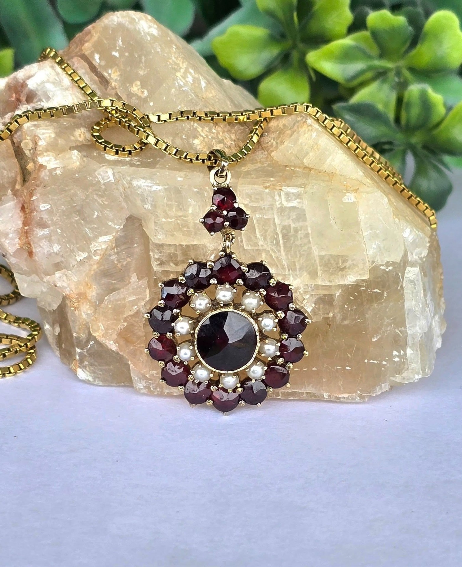 Lanț lung cu pandantiv vechi superb, din aur de 8K, cu 18 granate Bohemia naturale și 10 perle naturale de cultură.