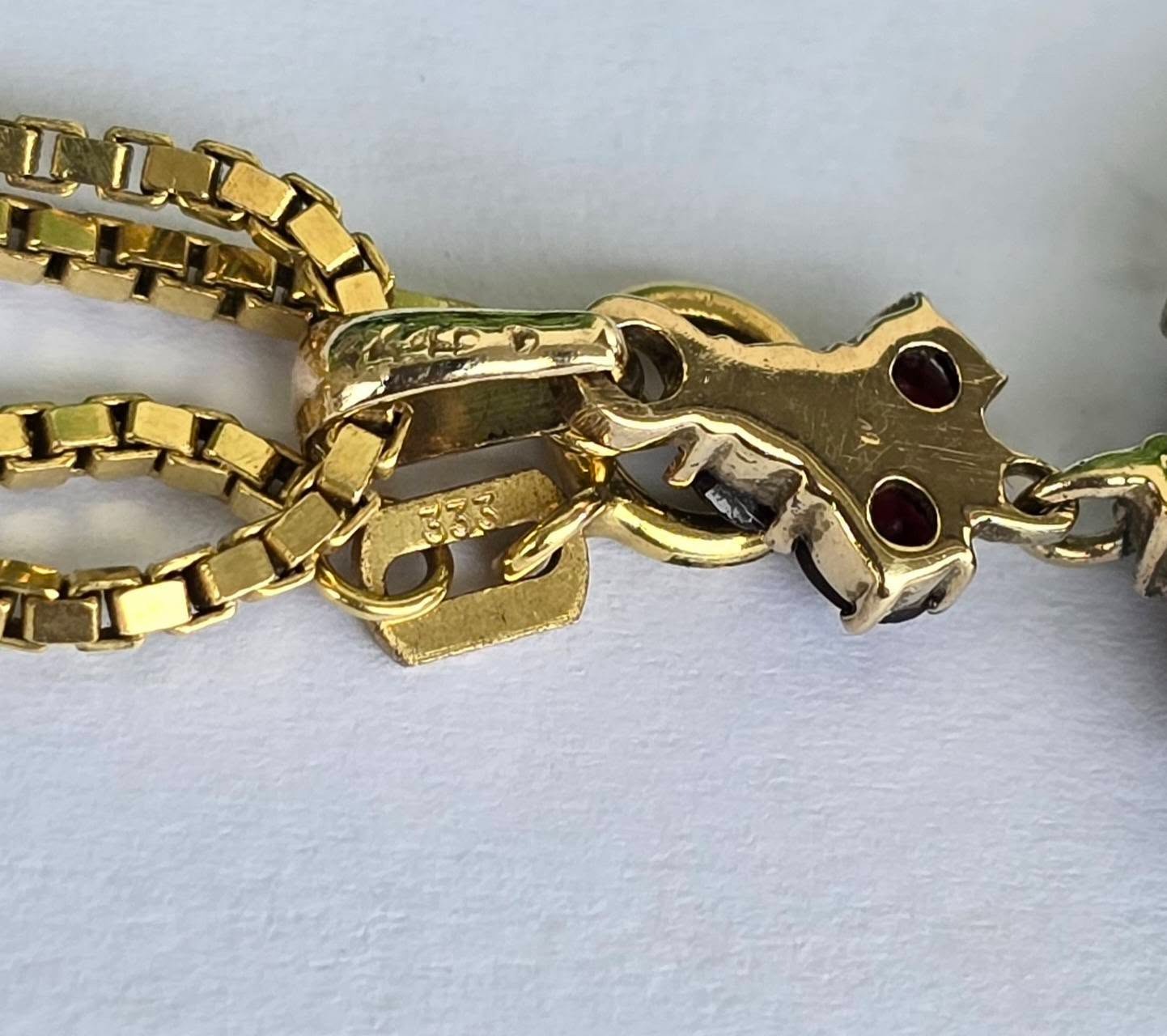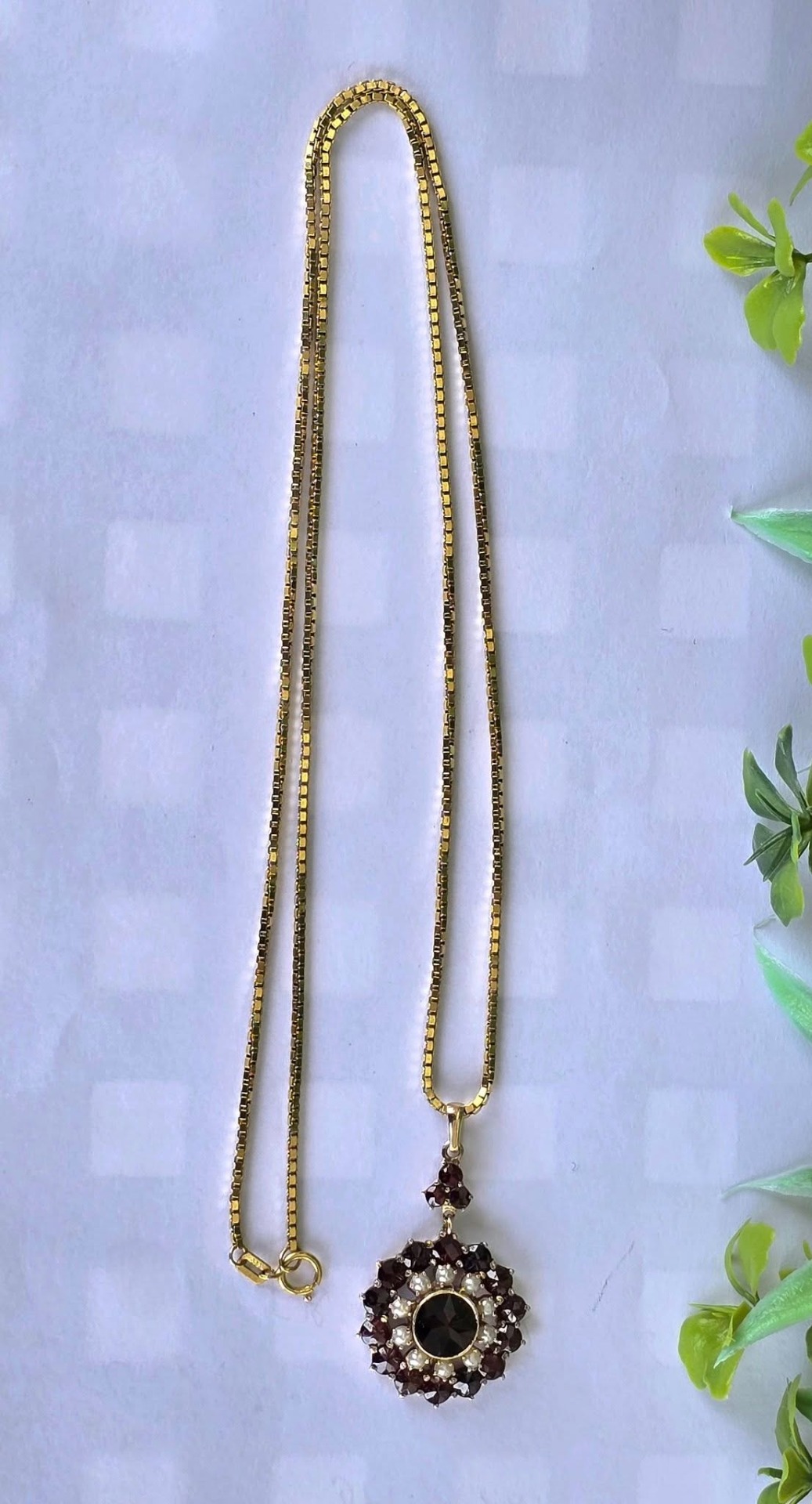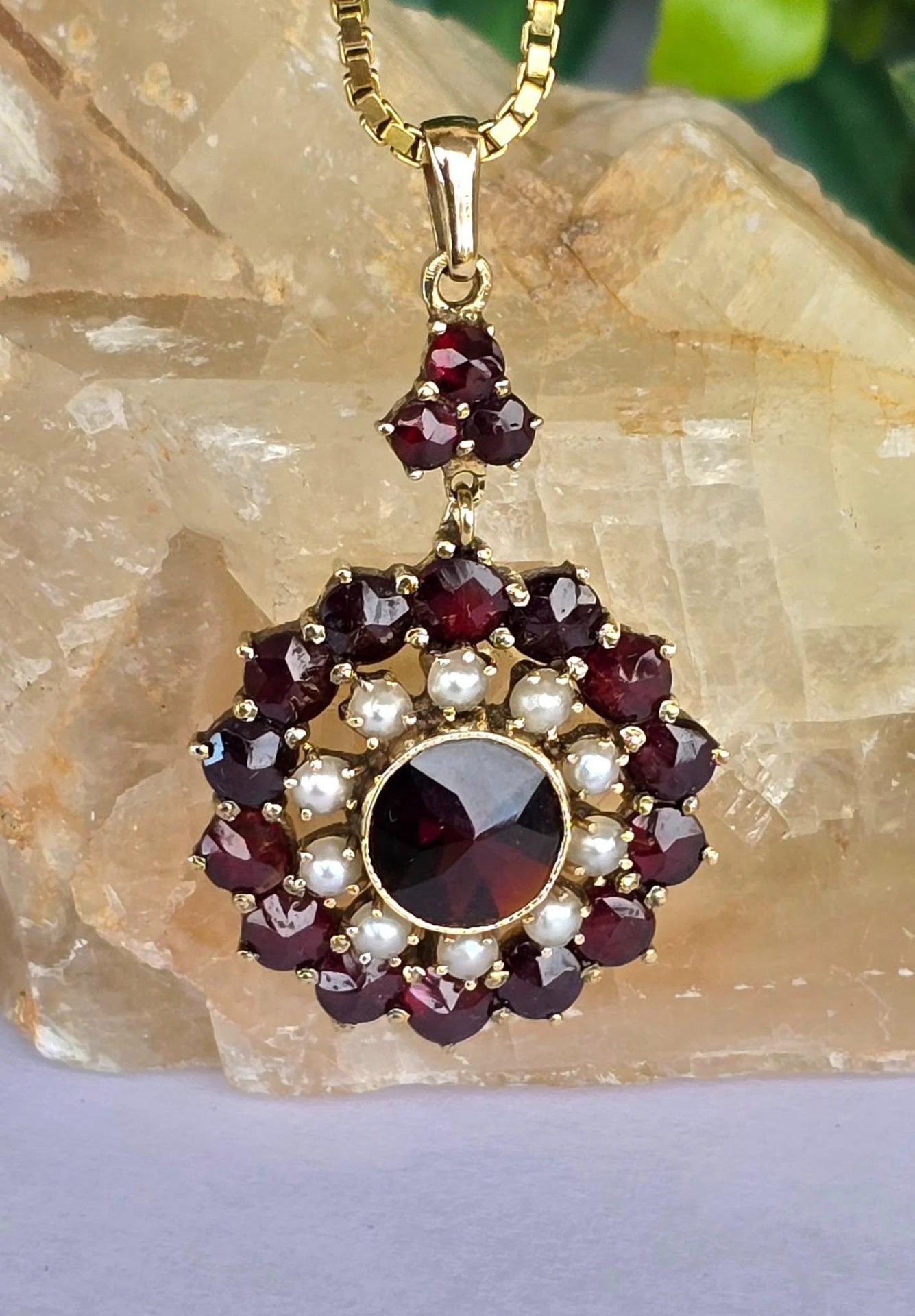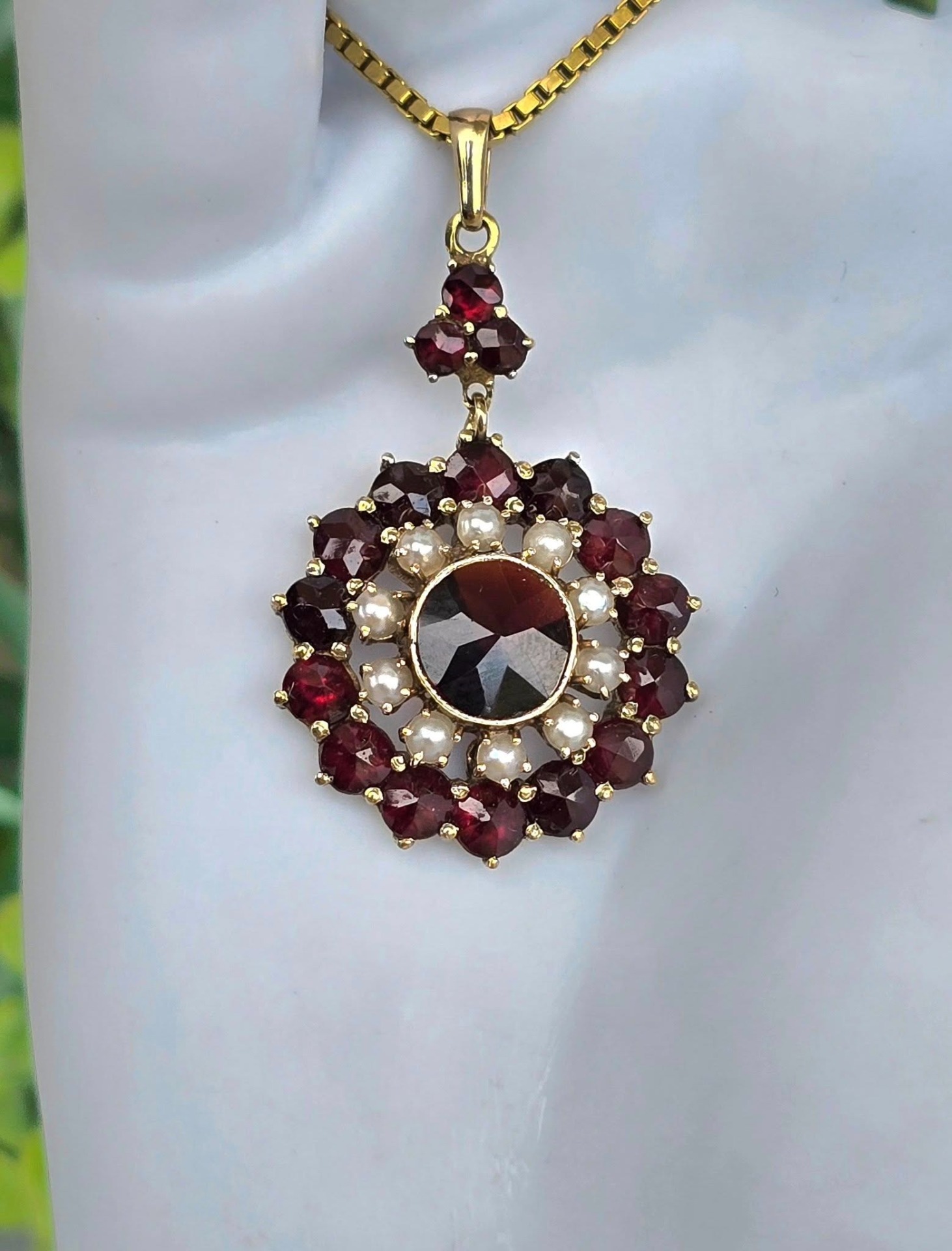 Lanț lung cu pandantiv vechi superb, din aur de 8K, cu 18 granate Bohemia naturale și 10 perle naturale de cultură.