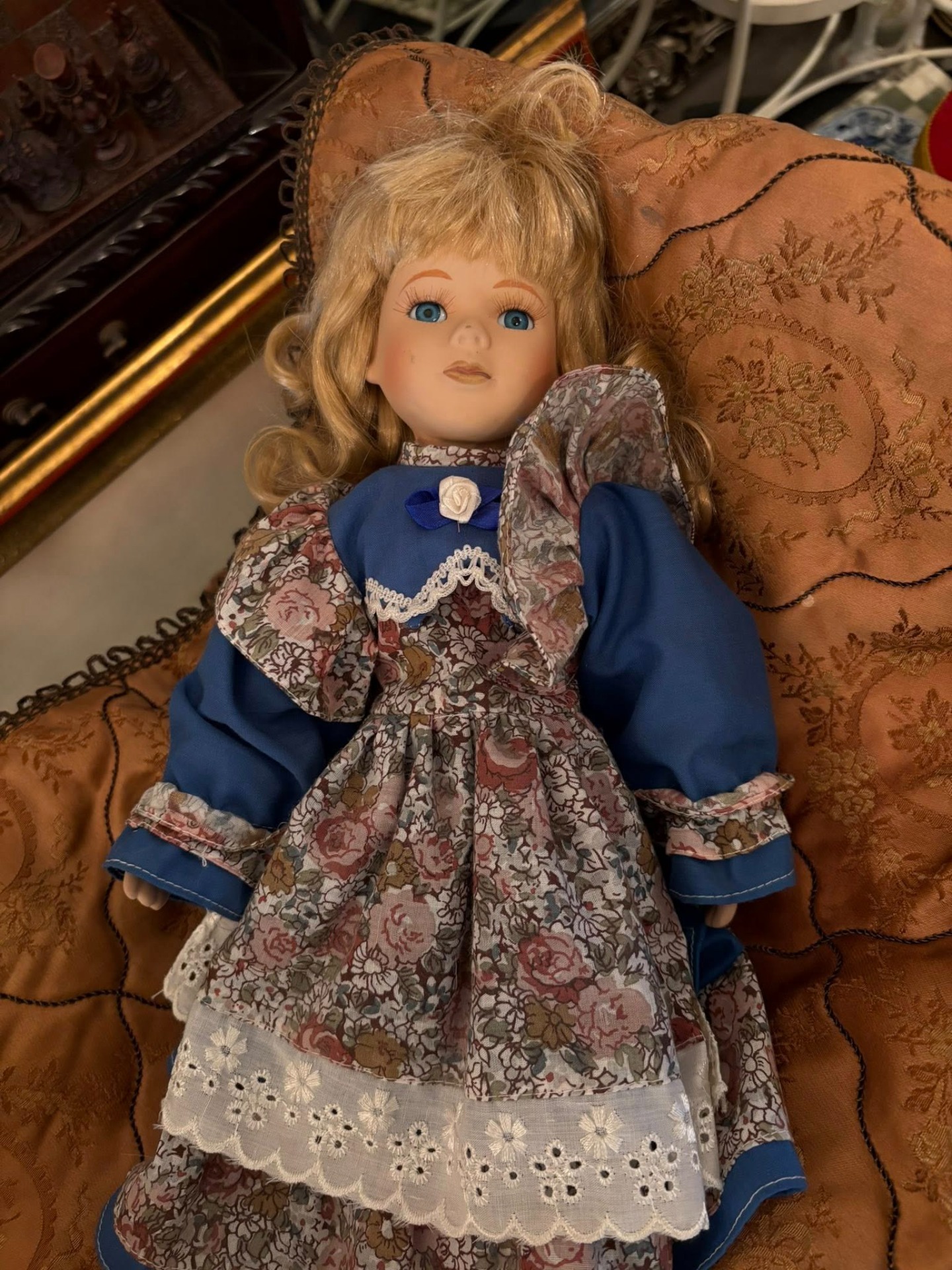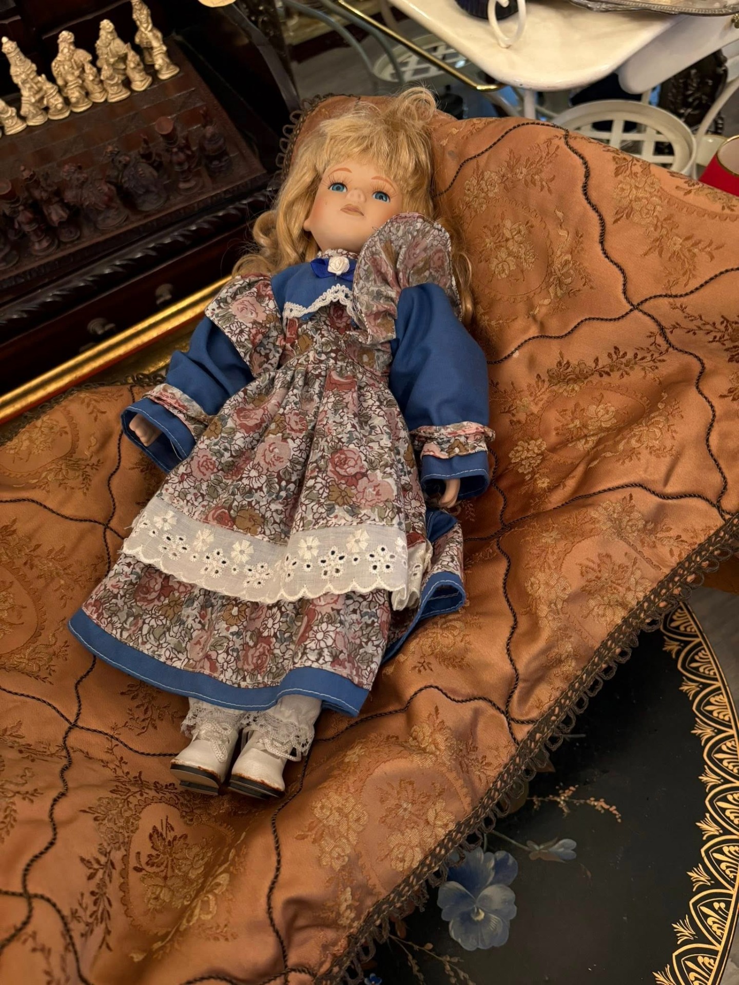 Include păpușă vintage cu față din porțelan/ceramică, ochi albaștri și rochiță cu dantelă.