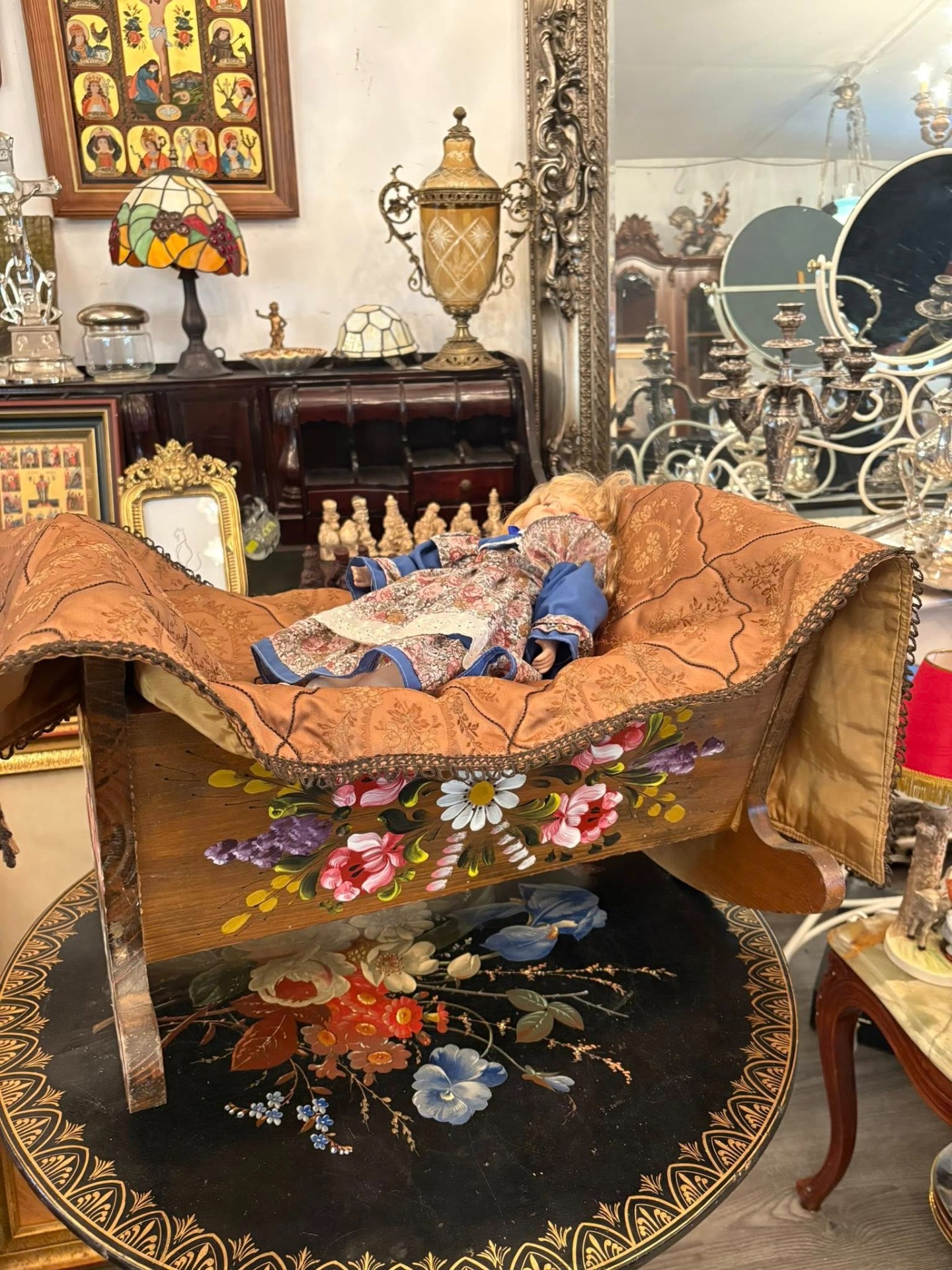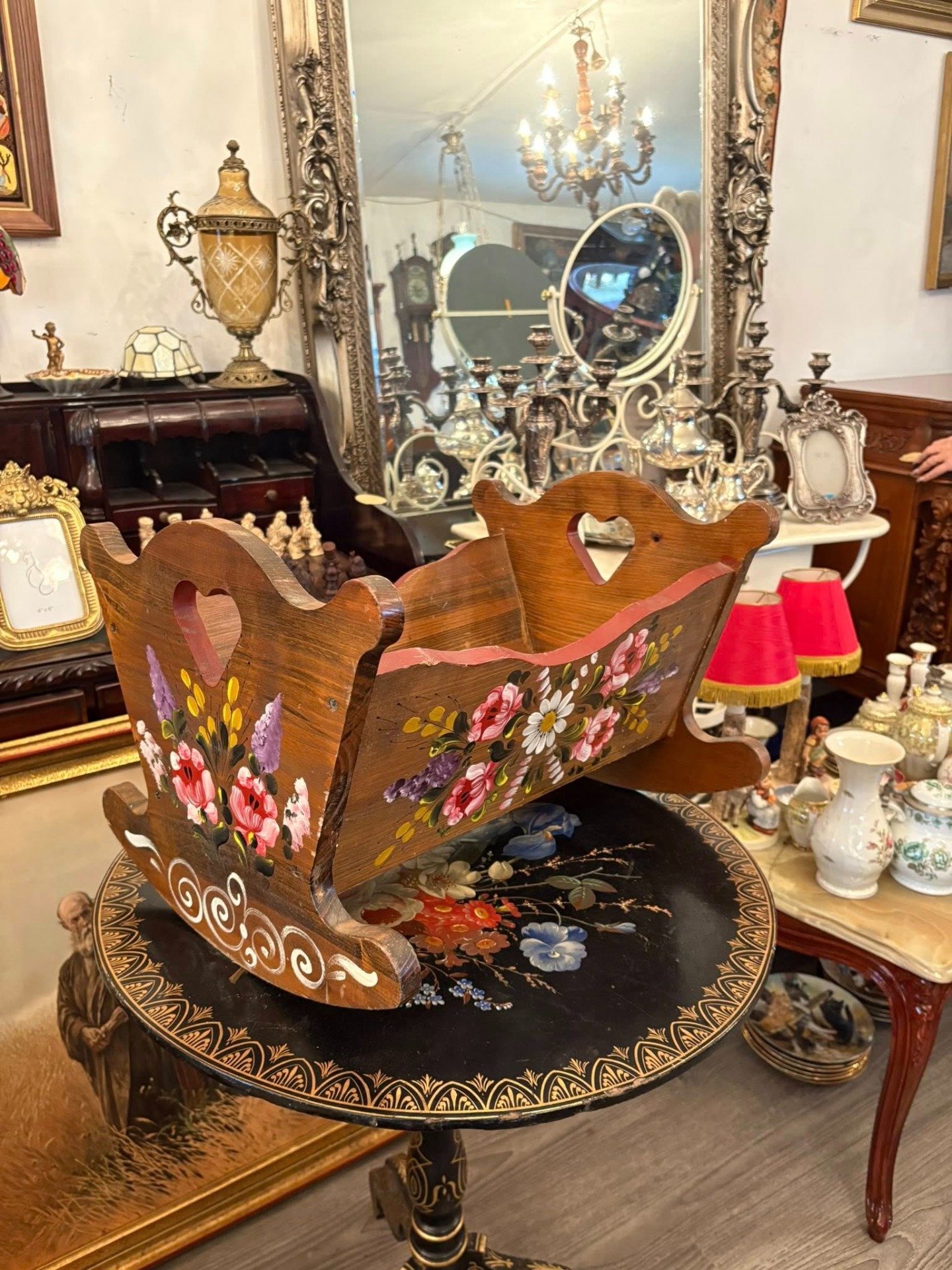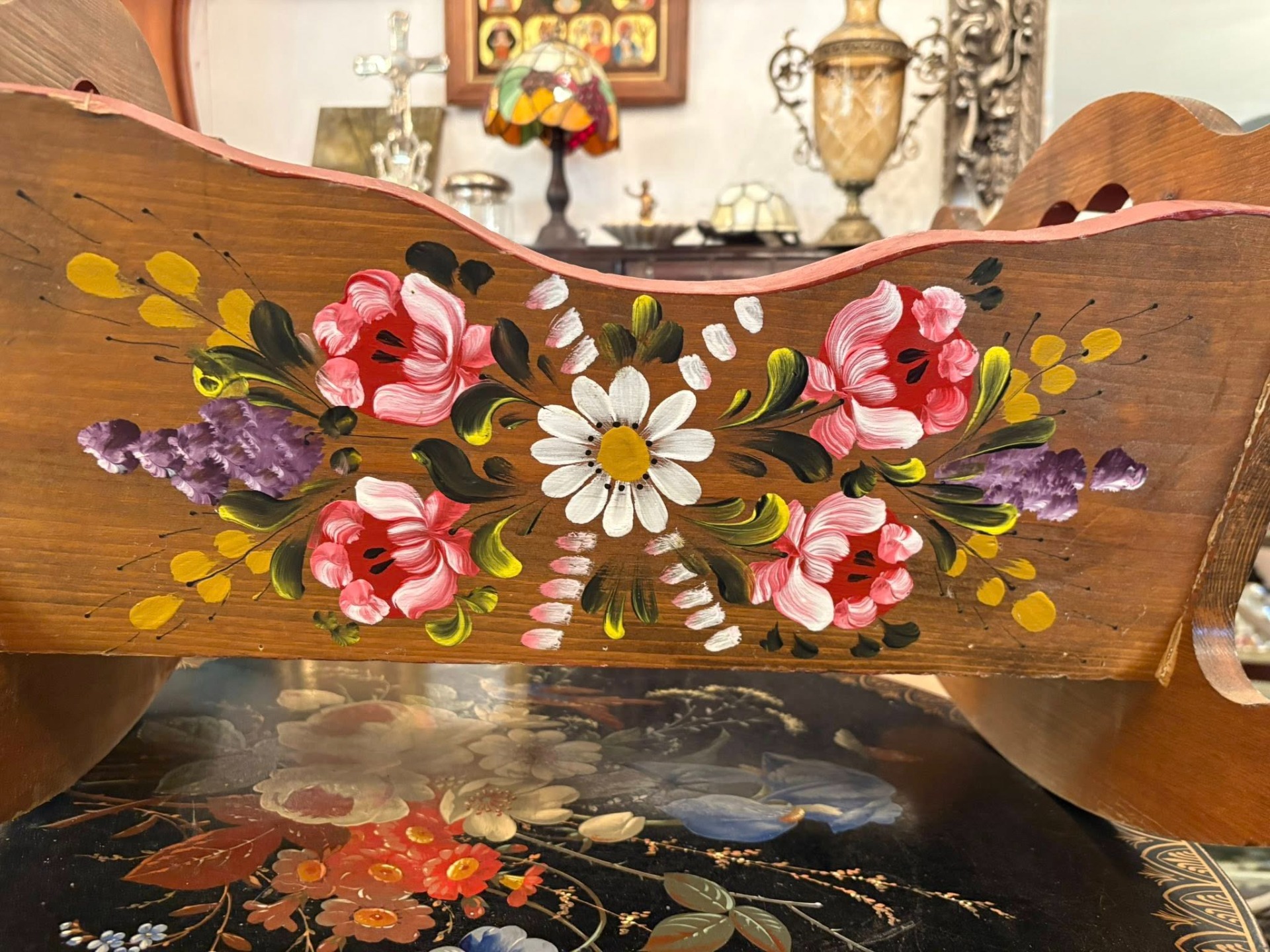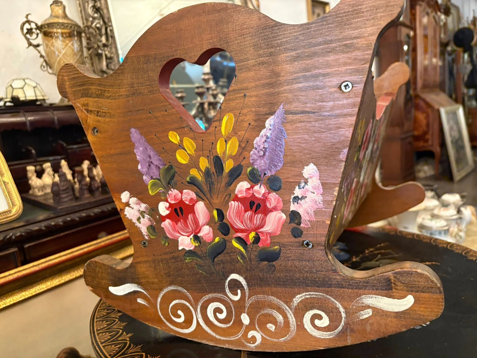 Leagăn decorativ din lemn masiv, pictat manual cu motive florale. Structură solidă, model rustic.