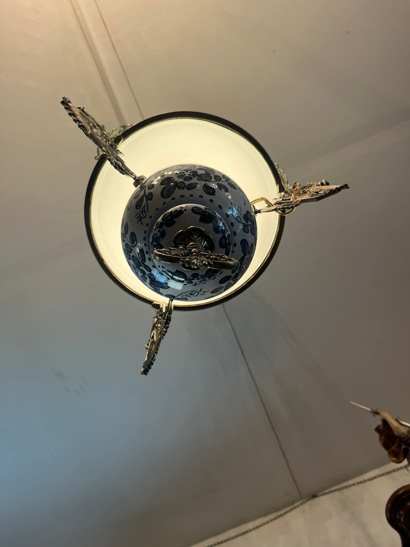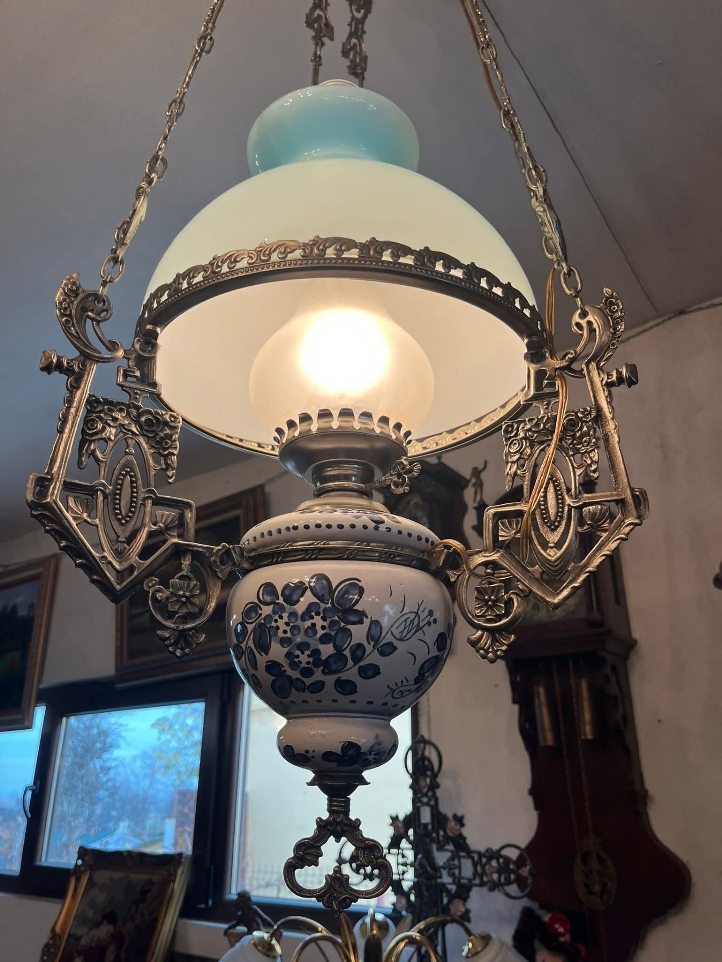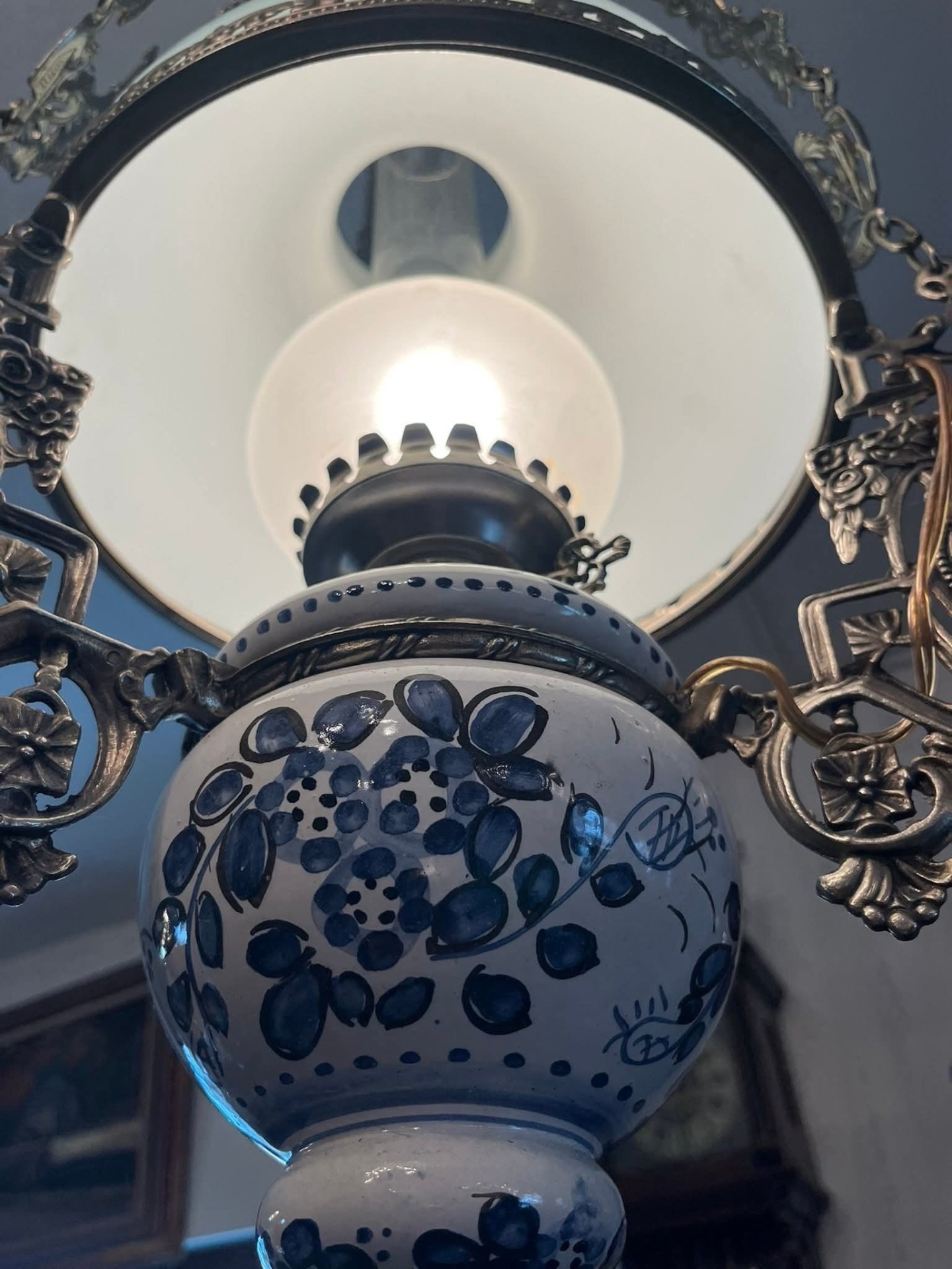 Abajurul: Este din sticlă opalină (probabil în două straturi, alb la interior și albastru pal la exterior), ceea ce dă o lumină foarte plăcută.