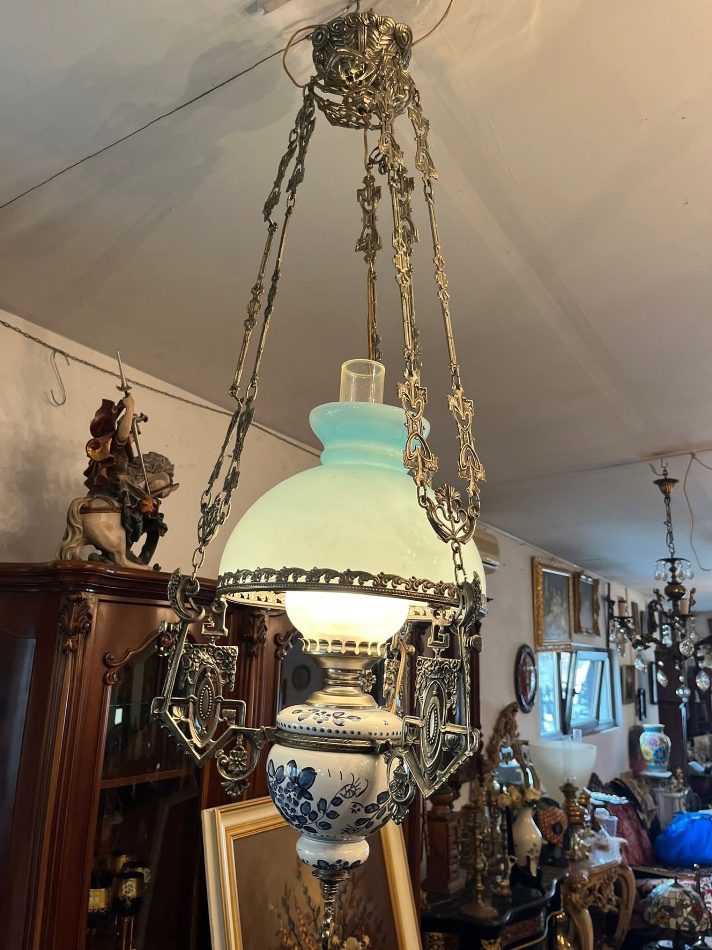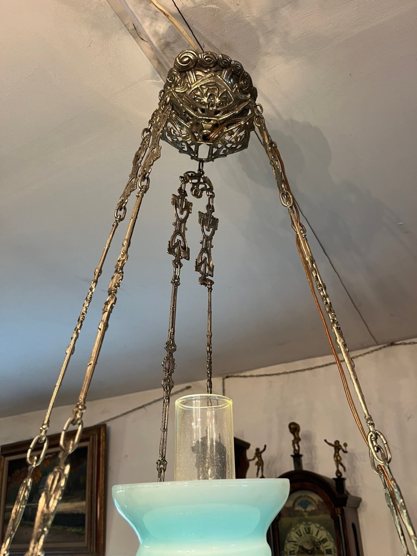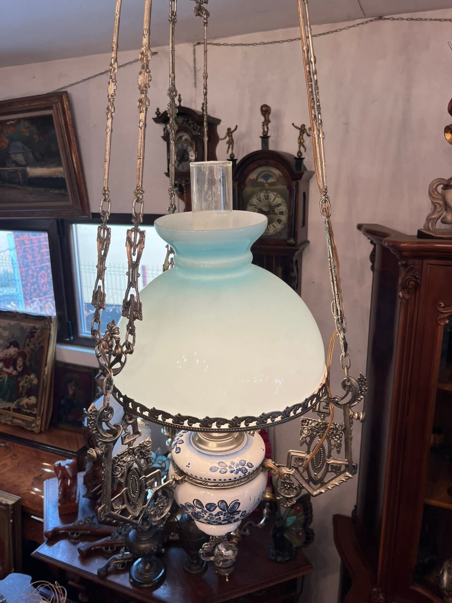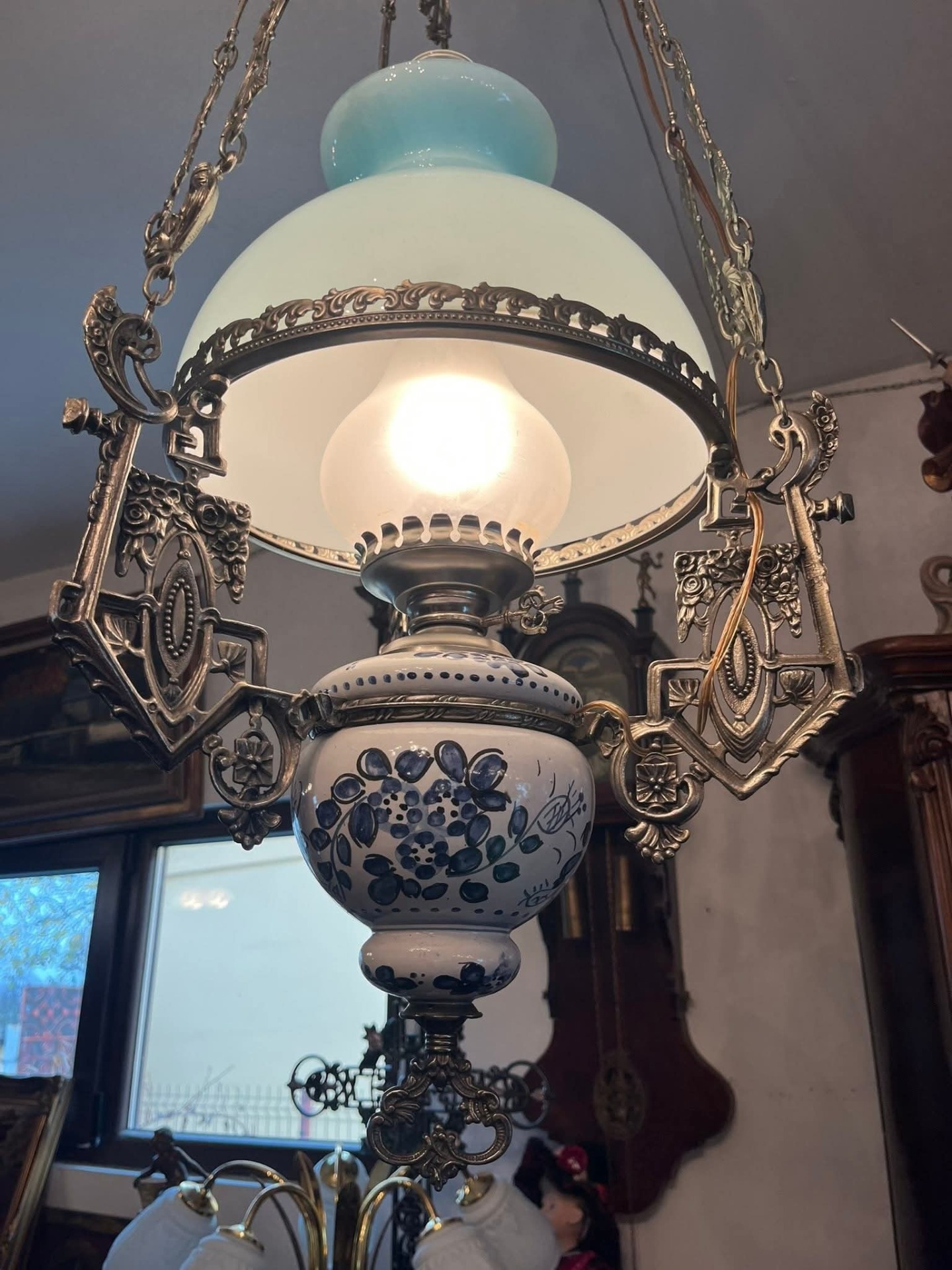 Abajurul: Este din sticlă opalină (probabil în două straturi, alb la interior și albastru pal la exterior), ceea ce dă o lumină foarte plăcută.