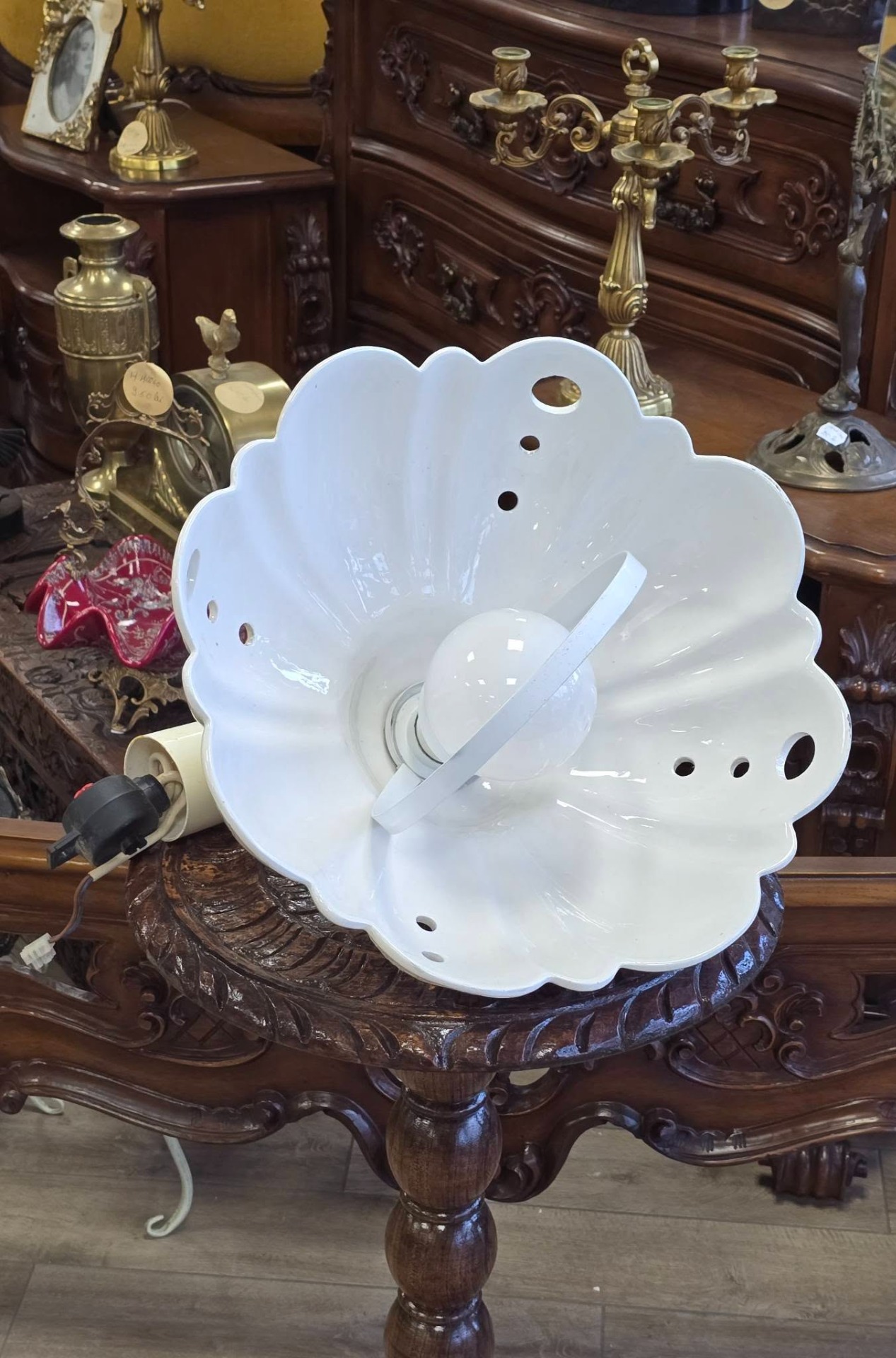 Lustră-pendul deosebită, în stil rustic, cu abajur din ceramică albă lucioasă, model tip "scoică" cu margini ondulate, cu perforații decorative (care creează