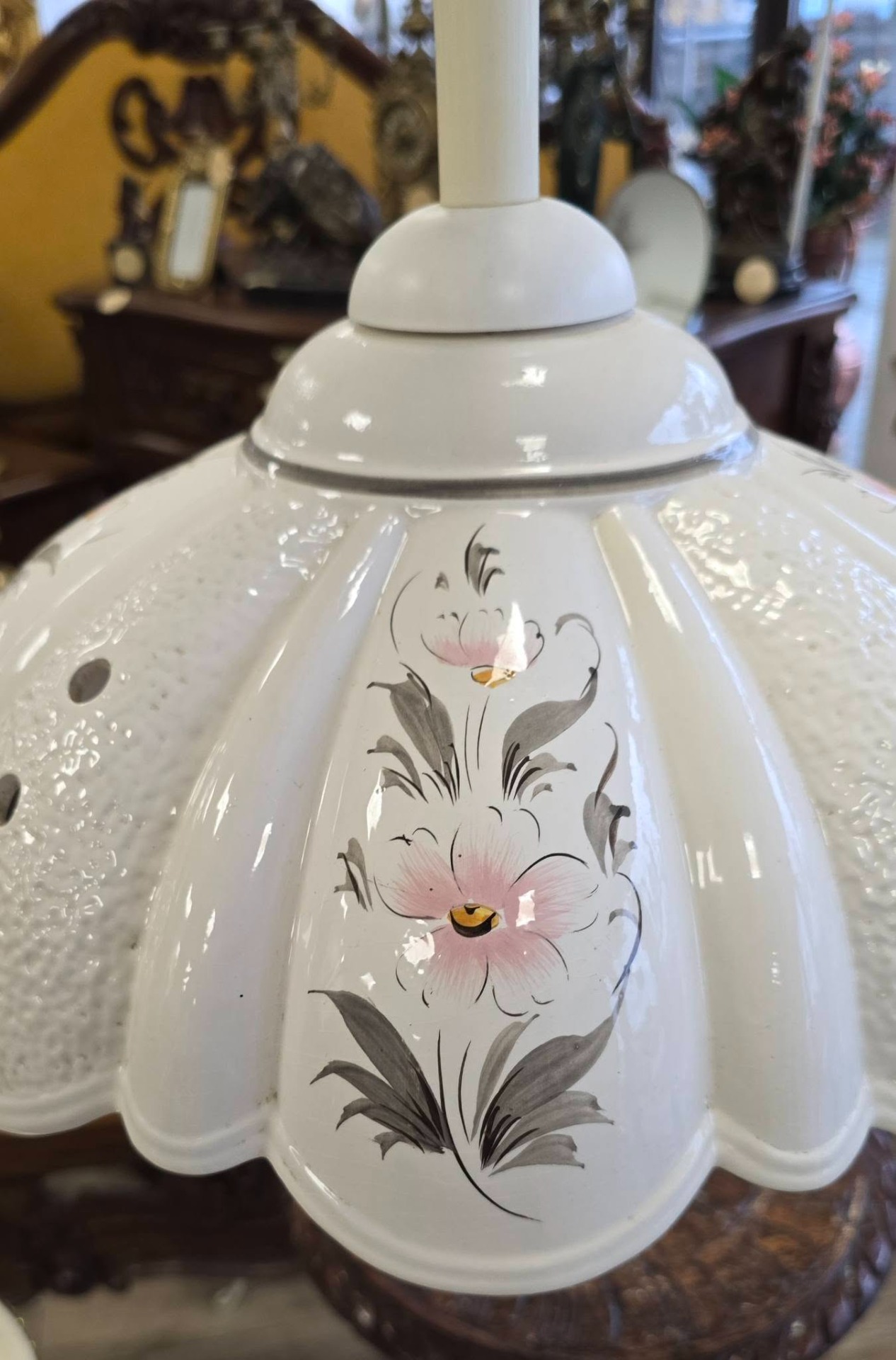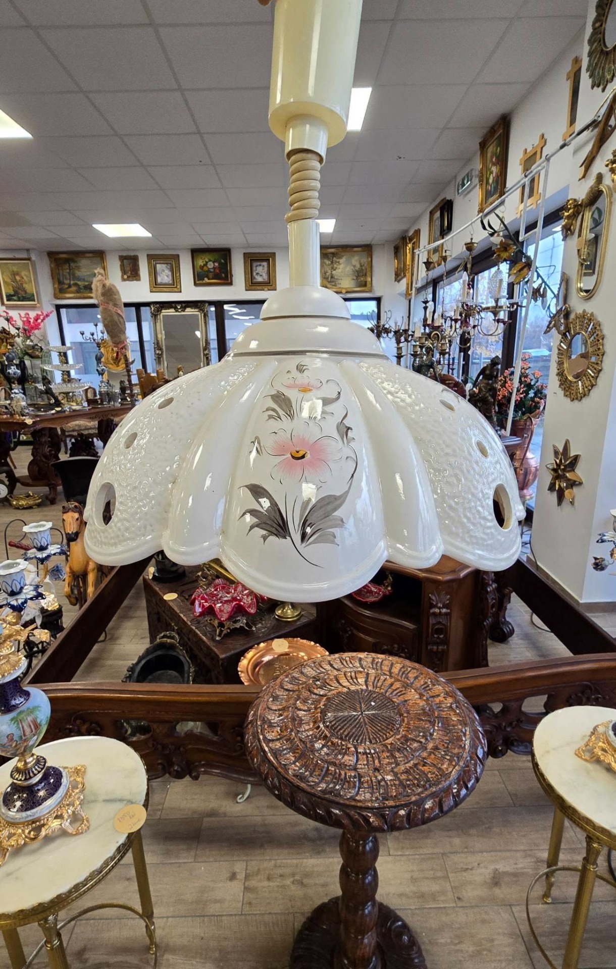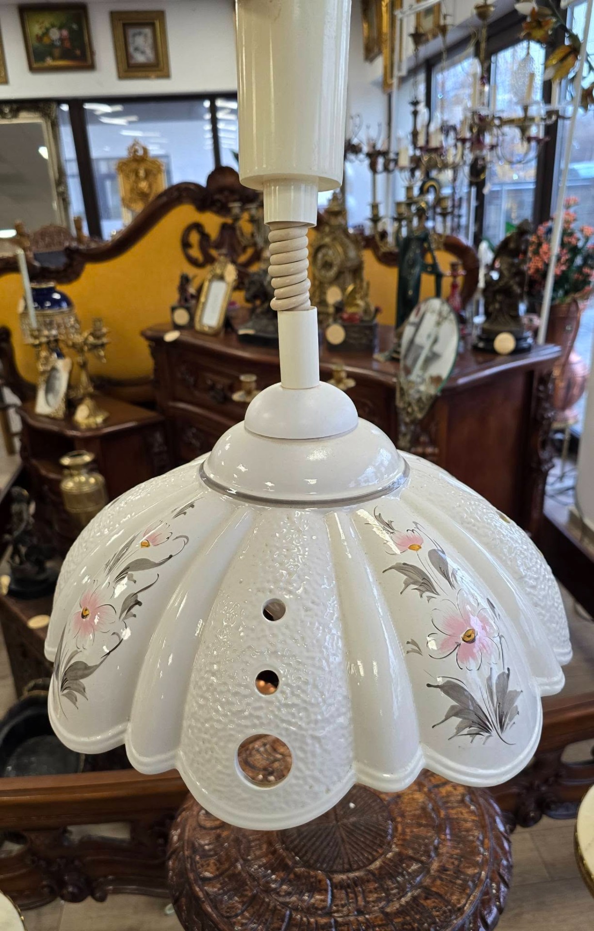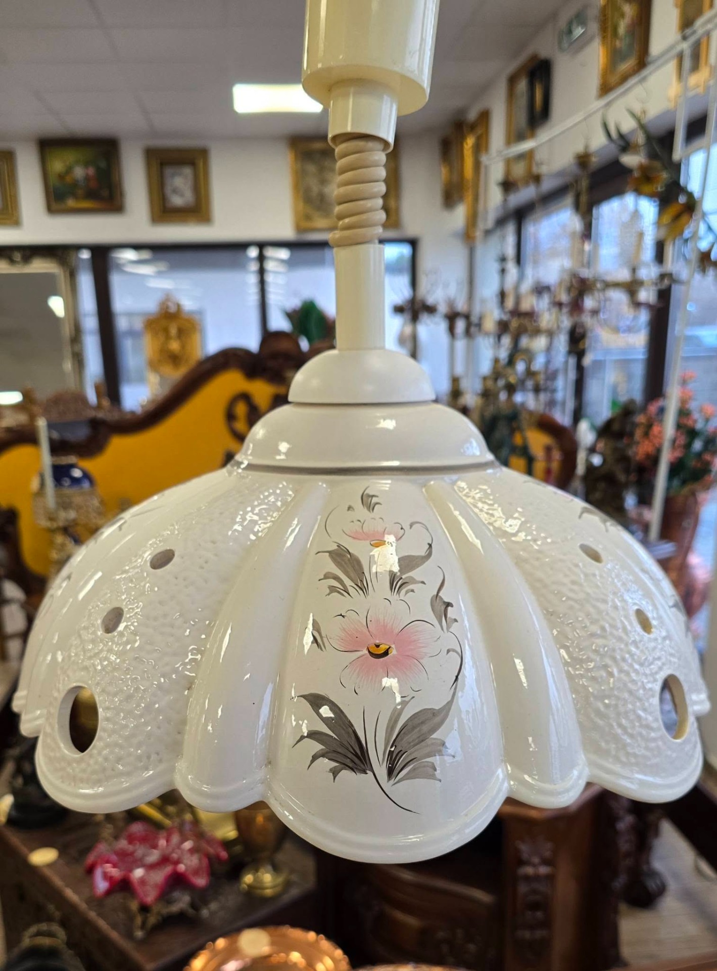jocuri de lumini plăcute) și motive florale pictate manual, cu un mecanism special de tip "Lift" care permite reglarea înălțimii prin simpla tragere a abajurului. Puteți coborî lustra deasupra mesei când mâncați și o puteți ridica ulterior, cablul fiind spiralat și retractabil, cu buton de reglaj al tensiunii (frână) pentru a susține greutatea abajurului la înălțimea dorită.