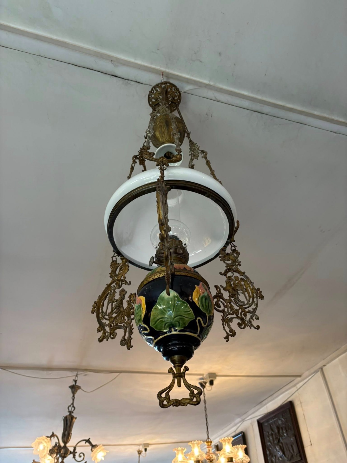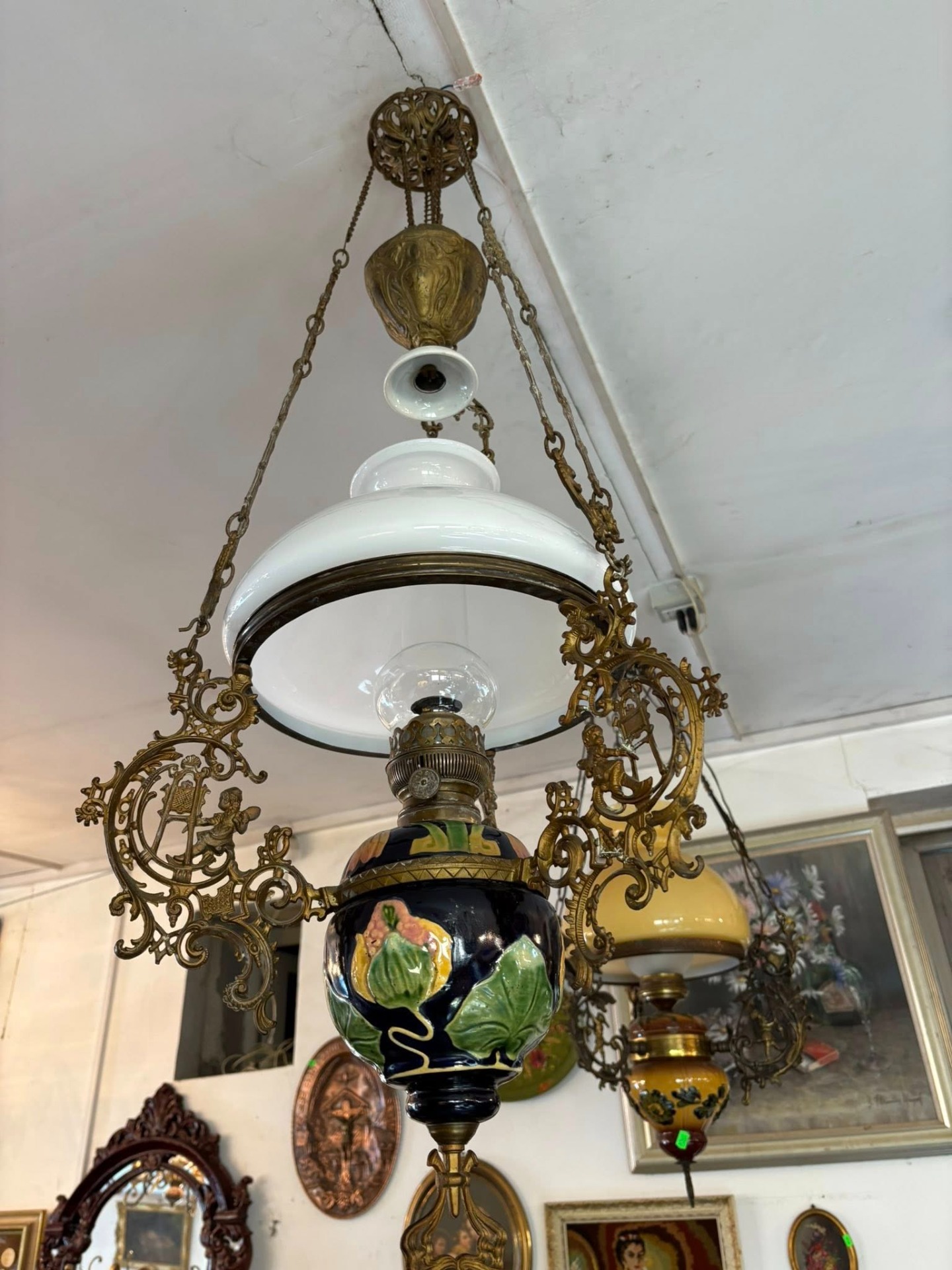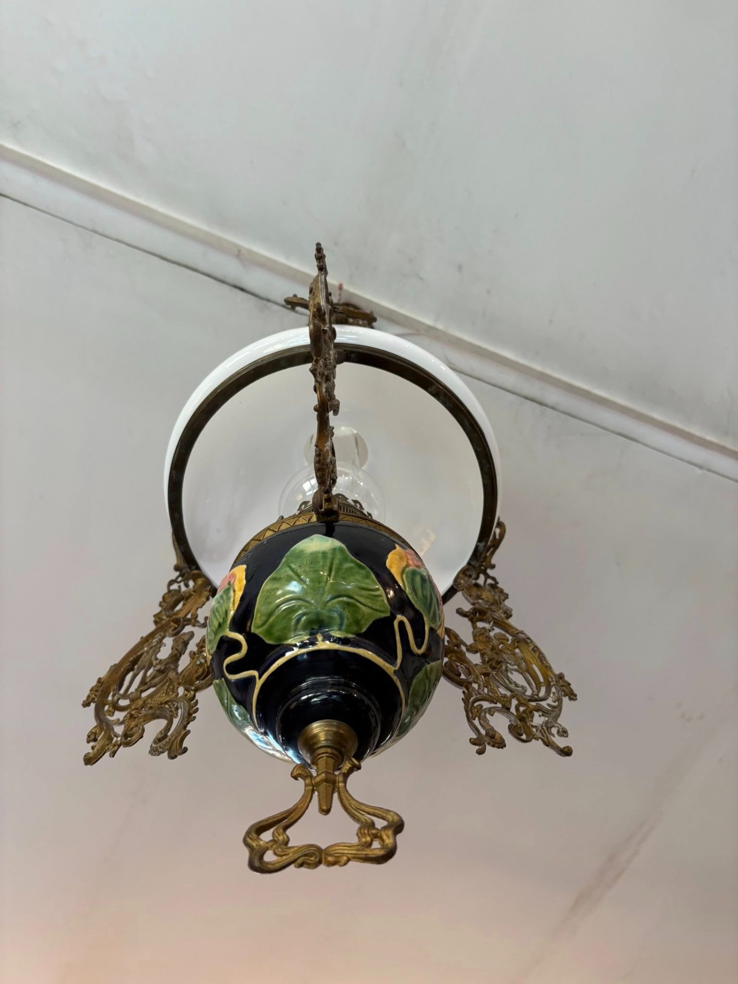 Lustră suspendată vintage / antică, din bronz ornamental, cu abajur opal alb și rezervor ceramic decorativ pictat manual. Piesă de efect, ideală pentru amenajări clasice, rustice sau eclectic-vintage. În stare bună, cu detalii decorative bogate.