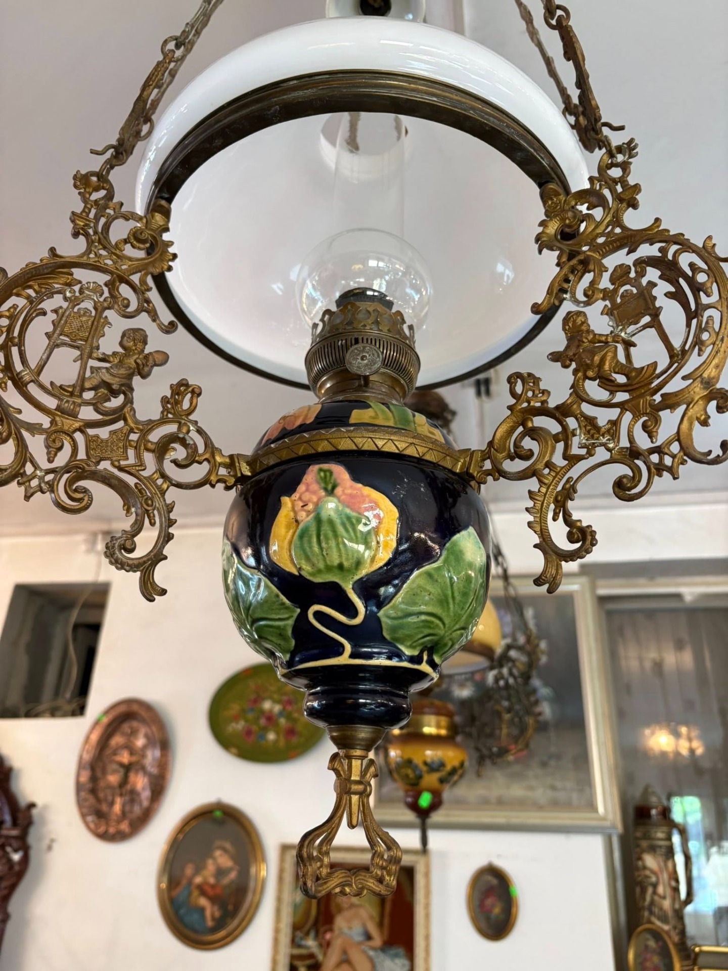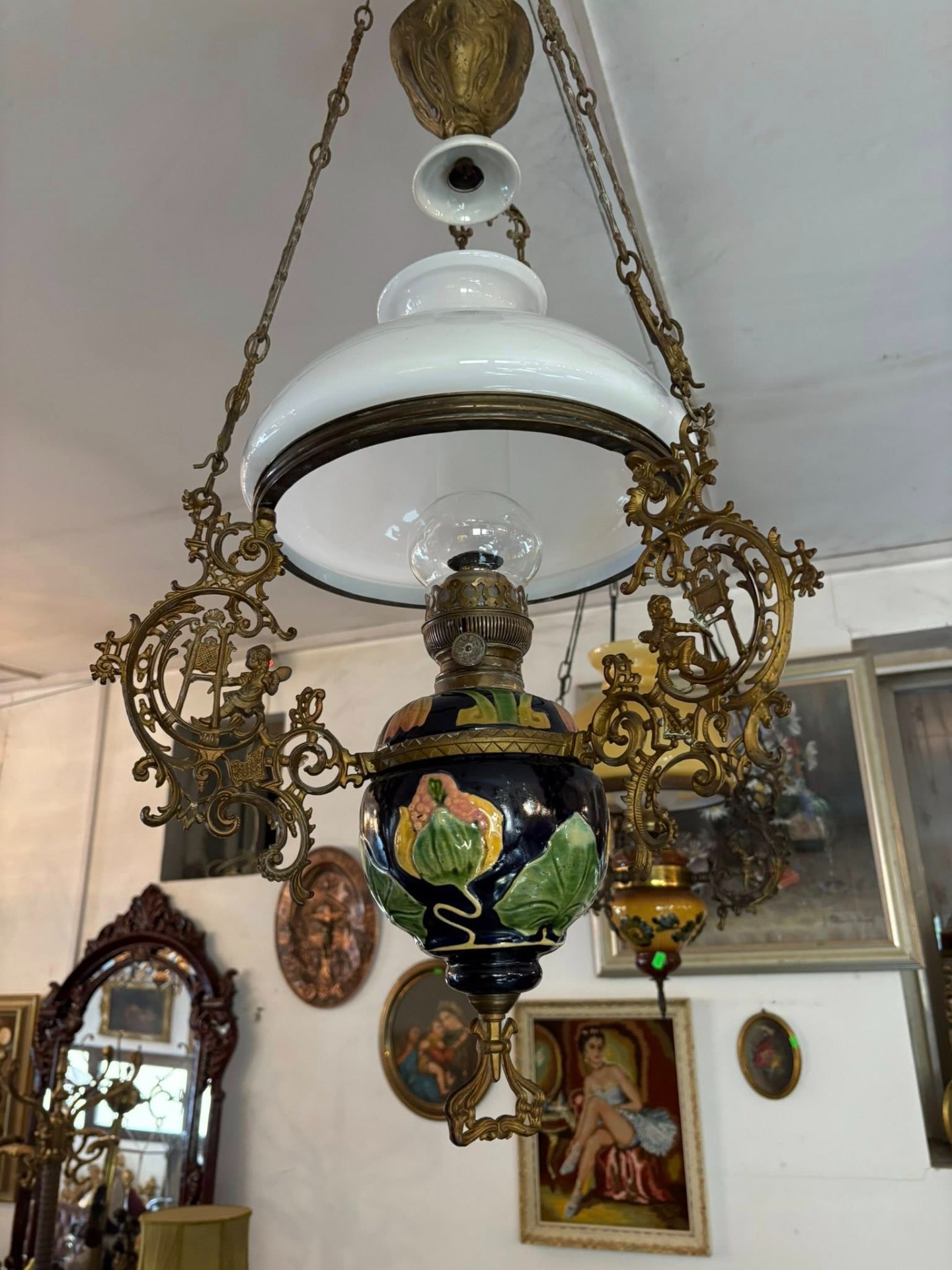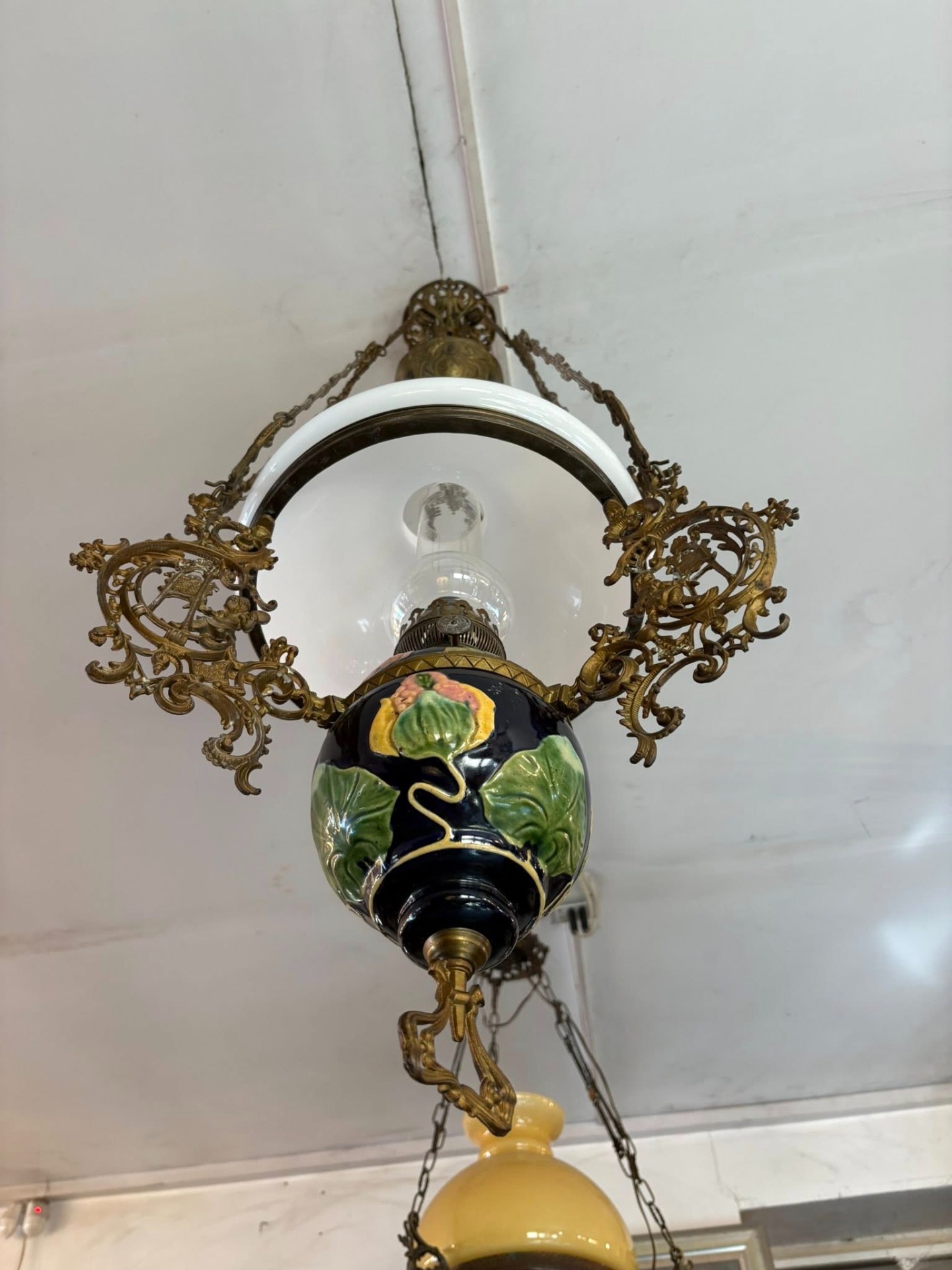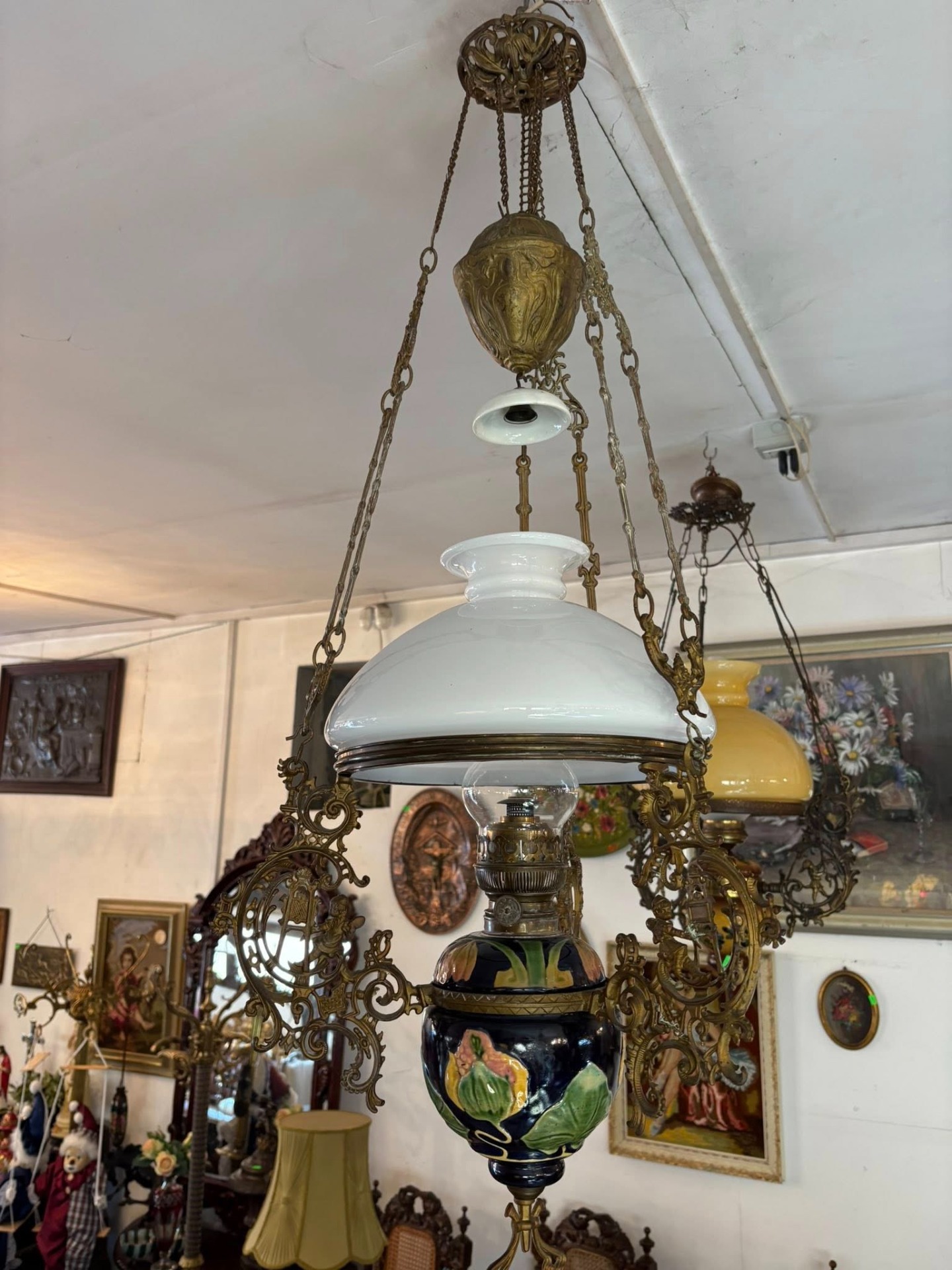Lustră suspendată vintage / antică, din bronz ornamental, cu abajur opal alb și rezervor ceramic decorativ pictat manual. Piesă de efect, ideală pentru amenajări clasice, rustice sau eclectic-vintage. În stare bună, cu detalii decorative bogate.