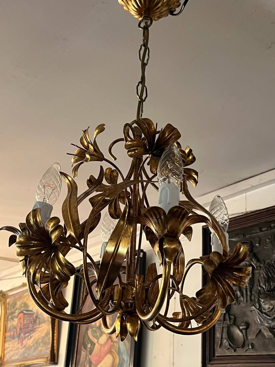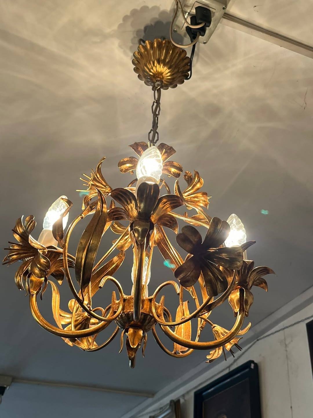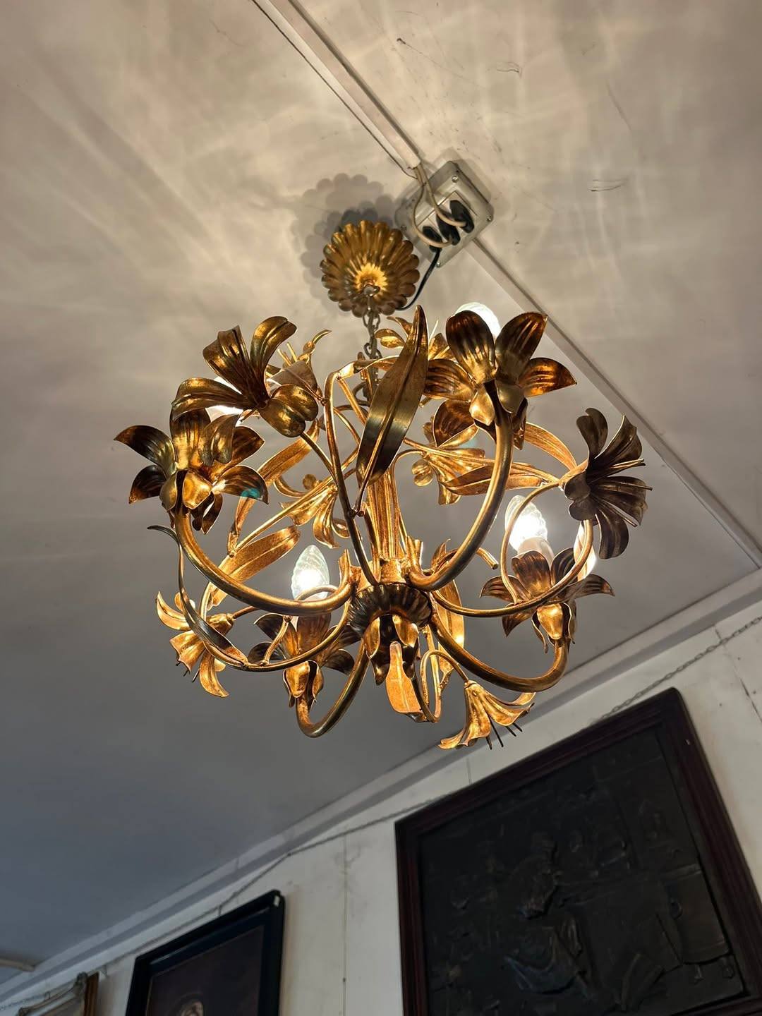 Lustră deosebită realizată din metal cu finisaj auriu patinat, decorată cu frunze și flori stilizate. Designul elegant și detaliile decorative oferă un aspect rafinat, potrivit pentru interioare clasice sau vintage.
