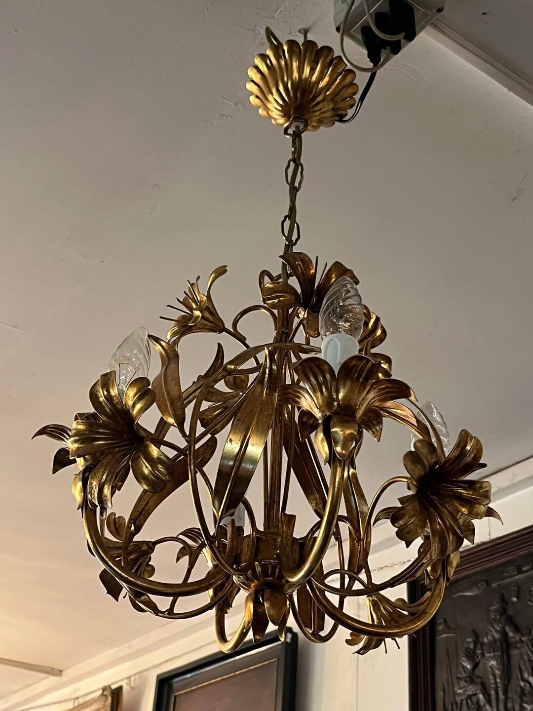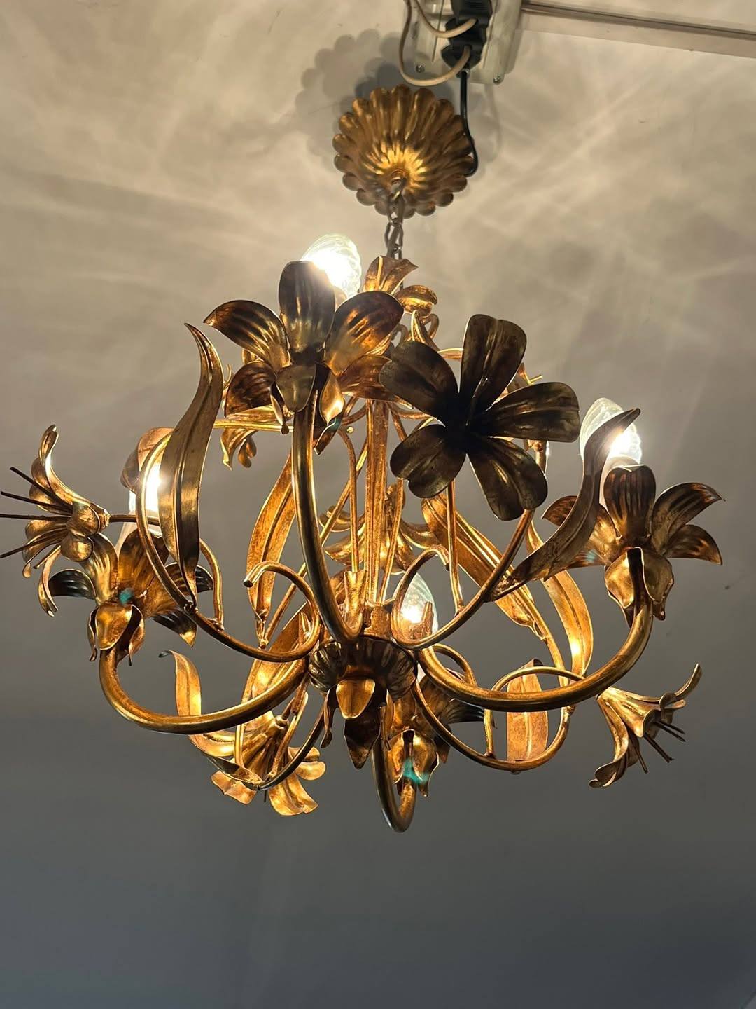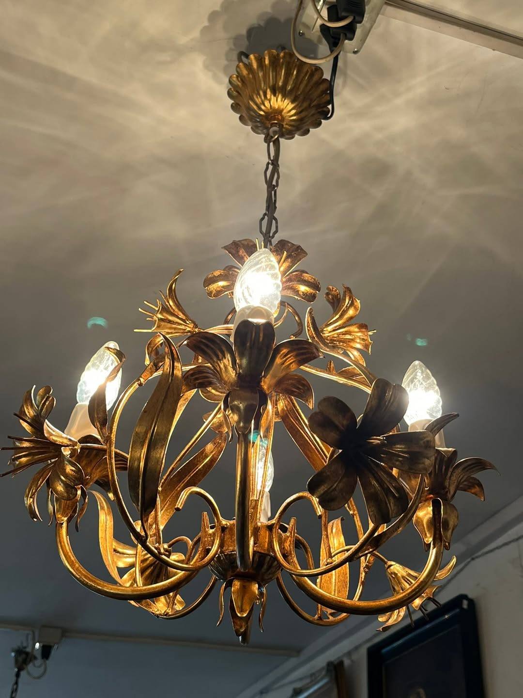 Lustră deosebită realizată din metal cu finisaj auriu patinat, decorată cu frunze și flori stilizate. Designul elegant și detaliile decorative oferă un aspect rafinat, potrivit pentru interioare clasice sau vintage.