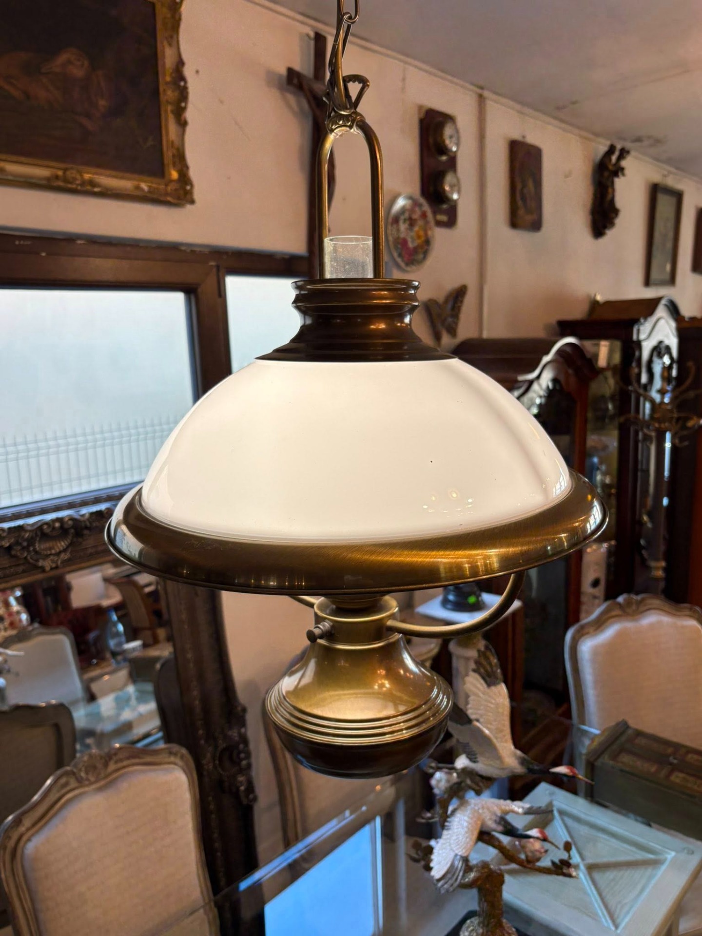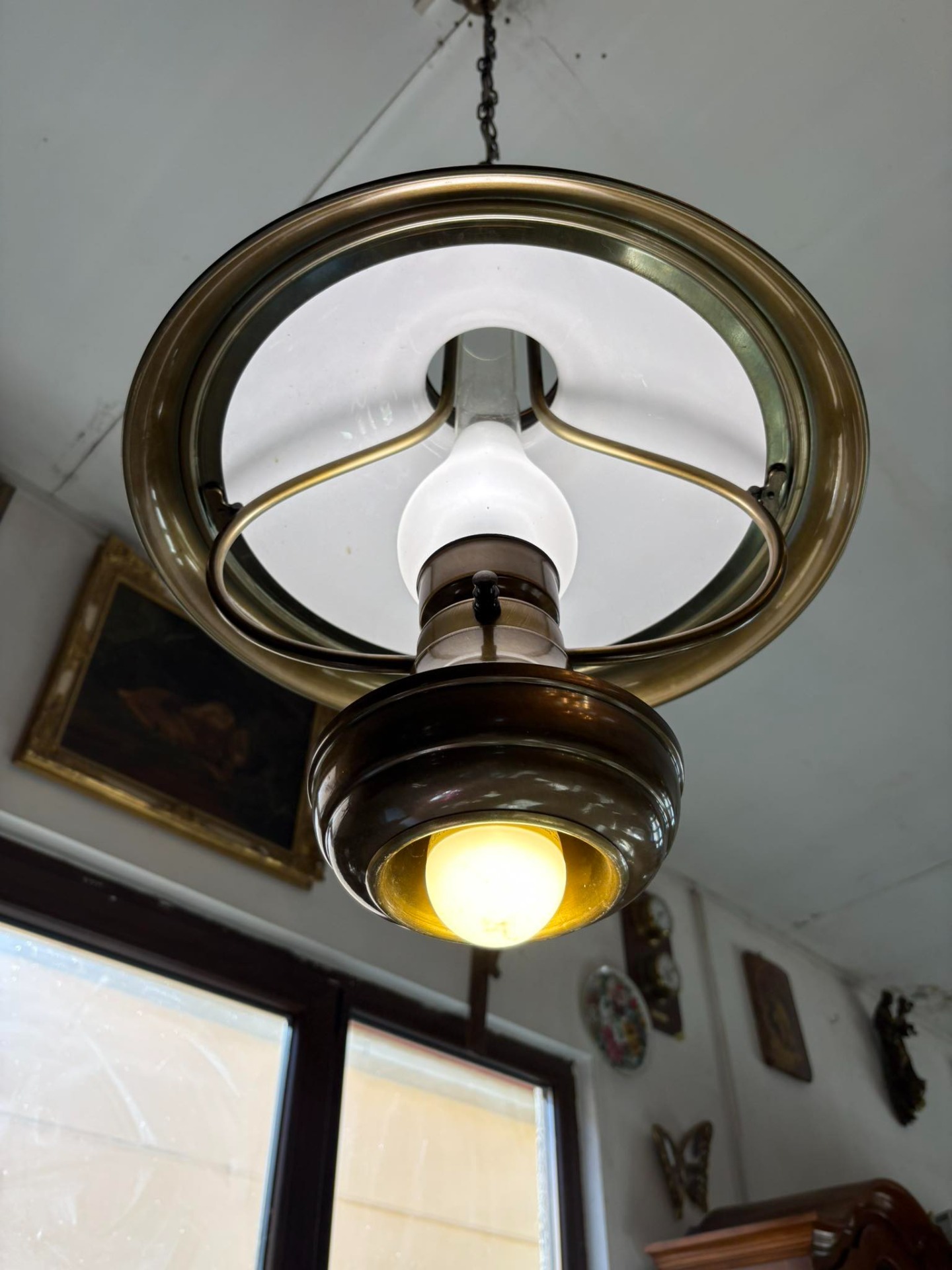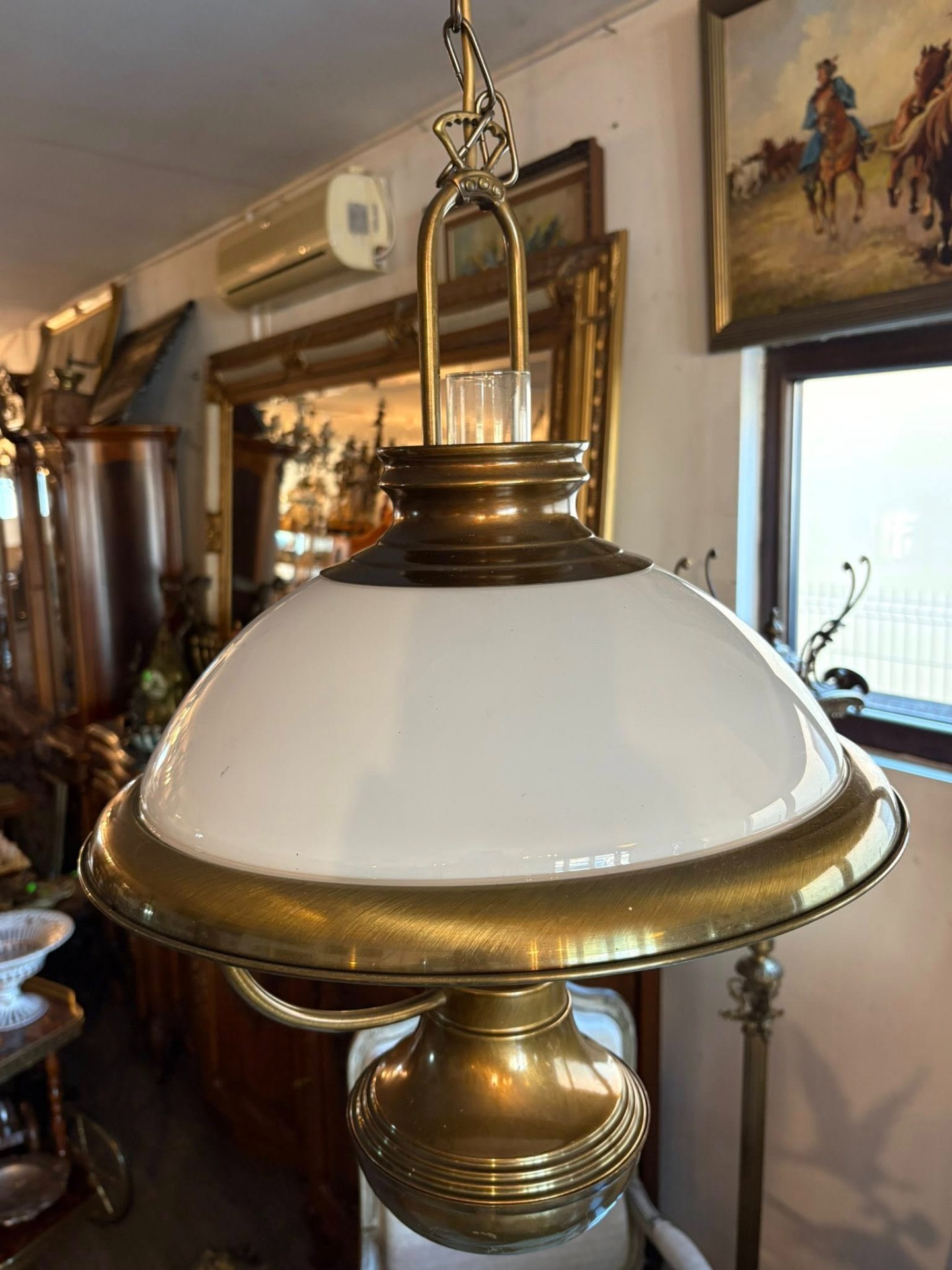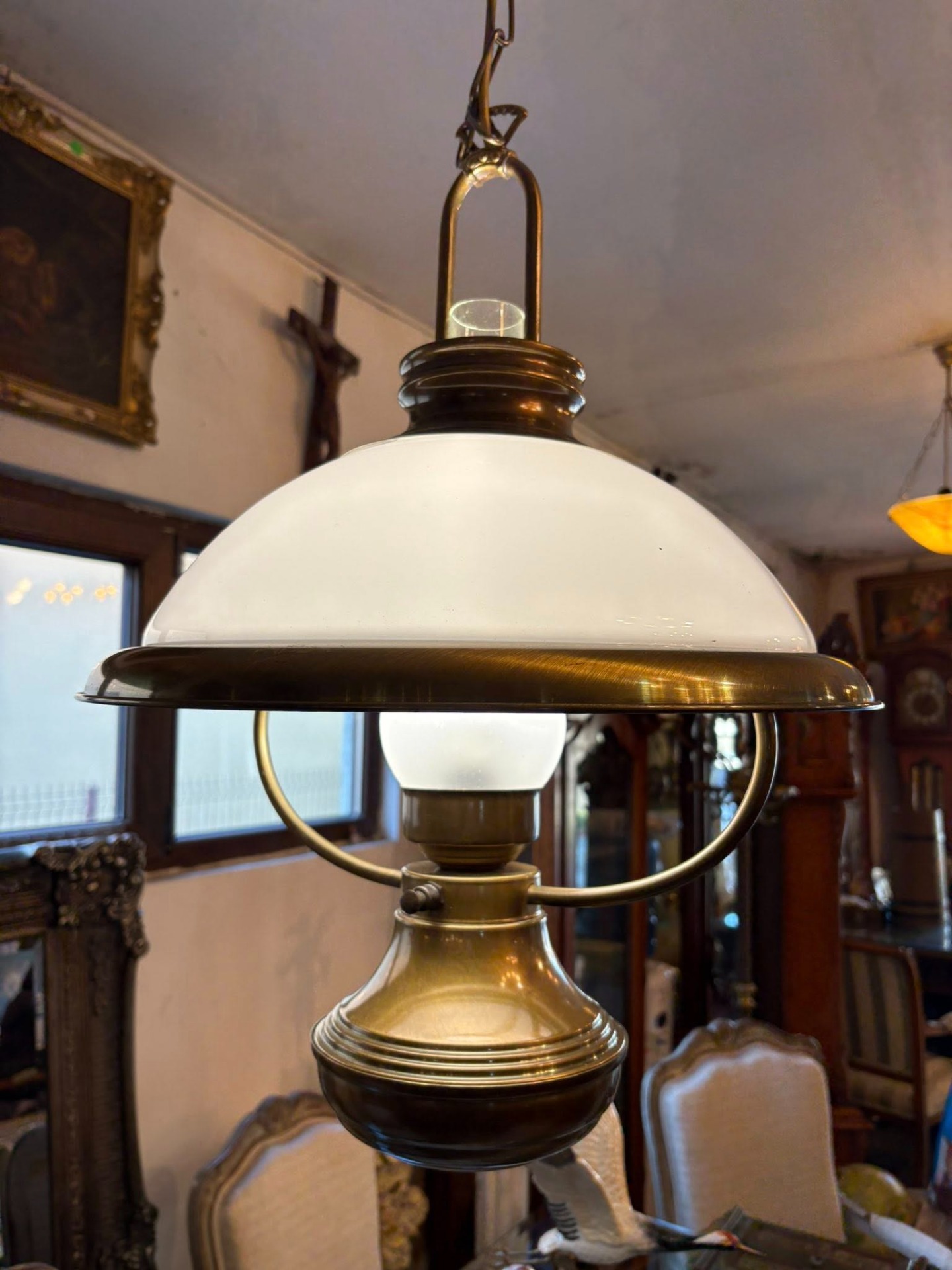 Lustră vintage din alamă cu abajur din sticlă – elegantă și deosebită…suspendată cu design clasic, realizată din alamă masivă și abajur din sticlă opal, perfectă pentru interioare elegante sau decoruri vintage.