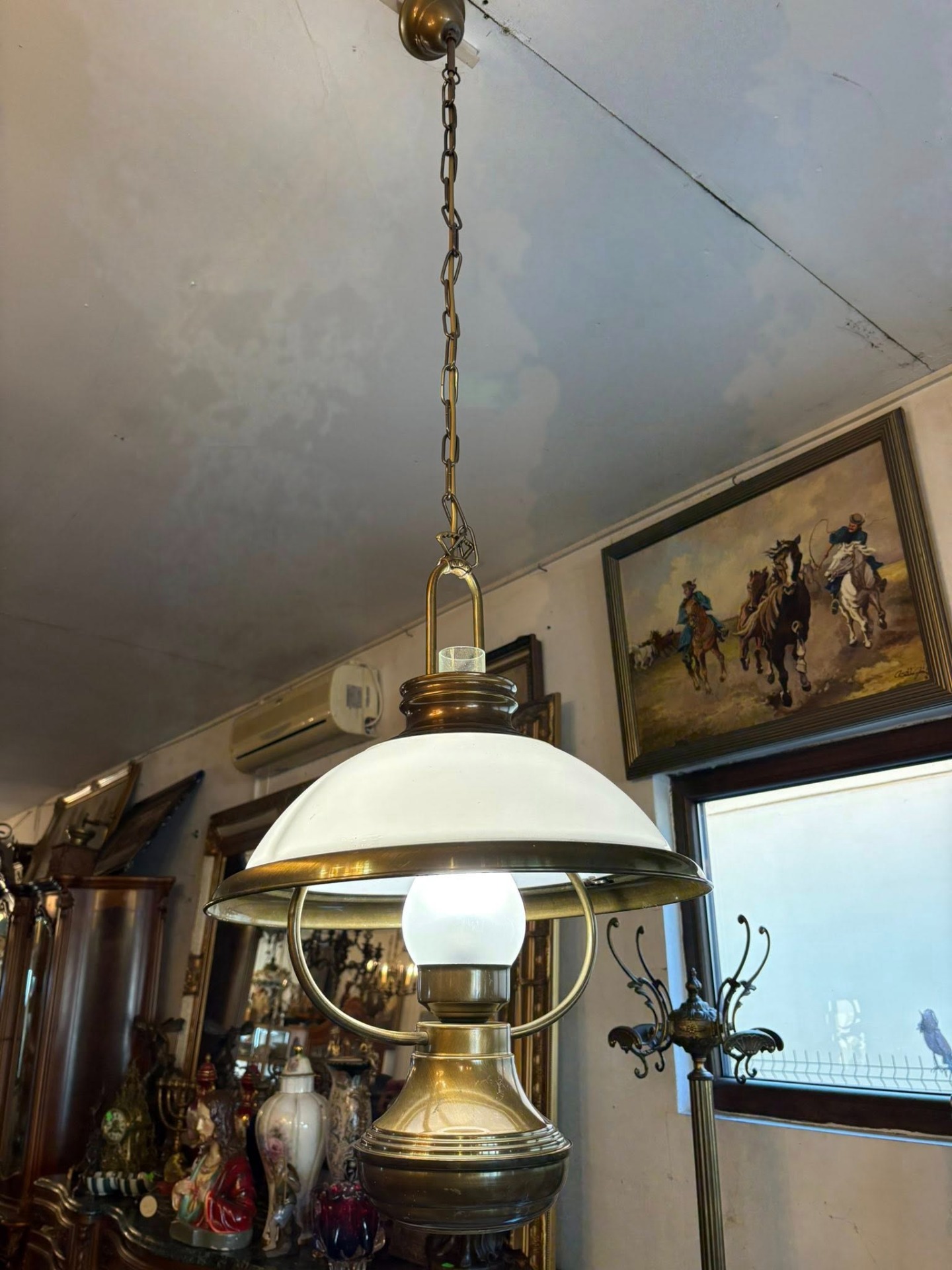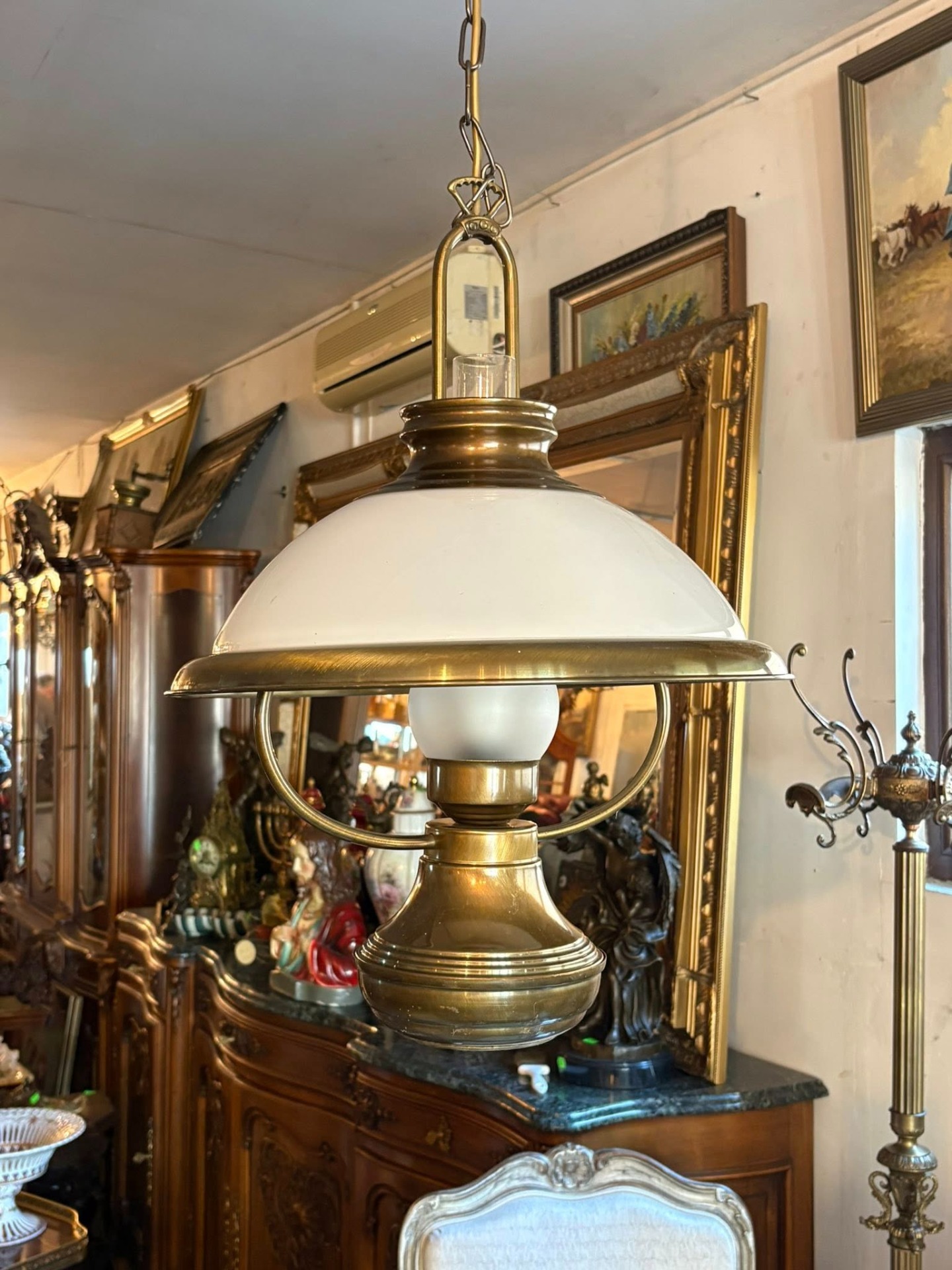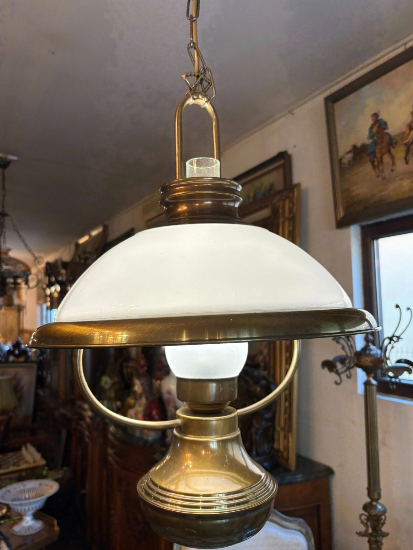 Lustră vintage din alamă cu abajur din sticlă – elegantă și deosebită…suspendată cu design clasic, realizată din alamă masivă și abajur din sticlă opal, perfectă pentru interioare elegante sau decoruri vintage.