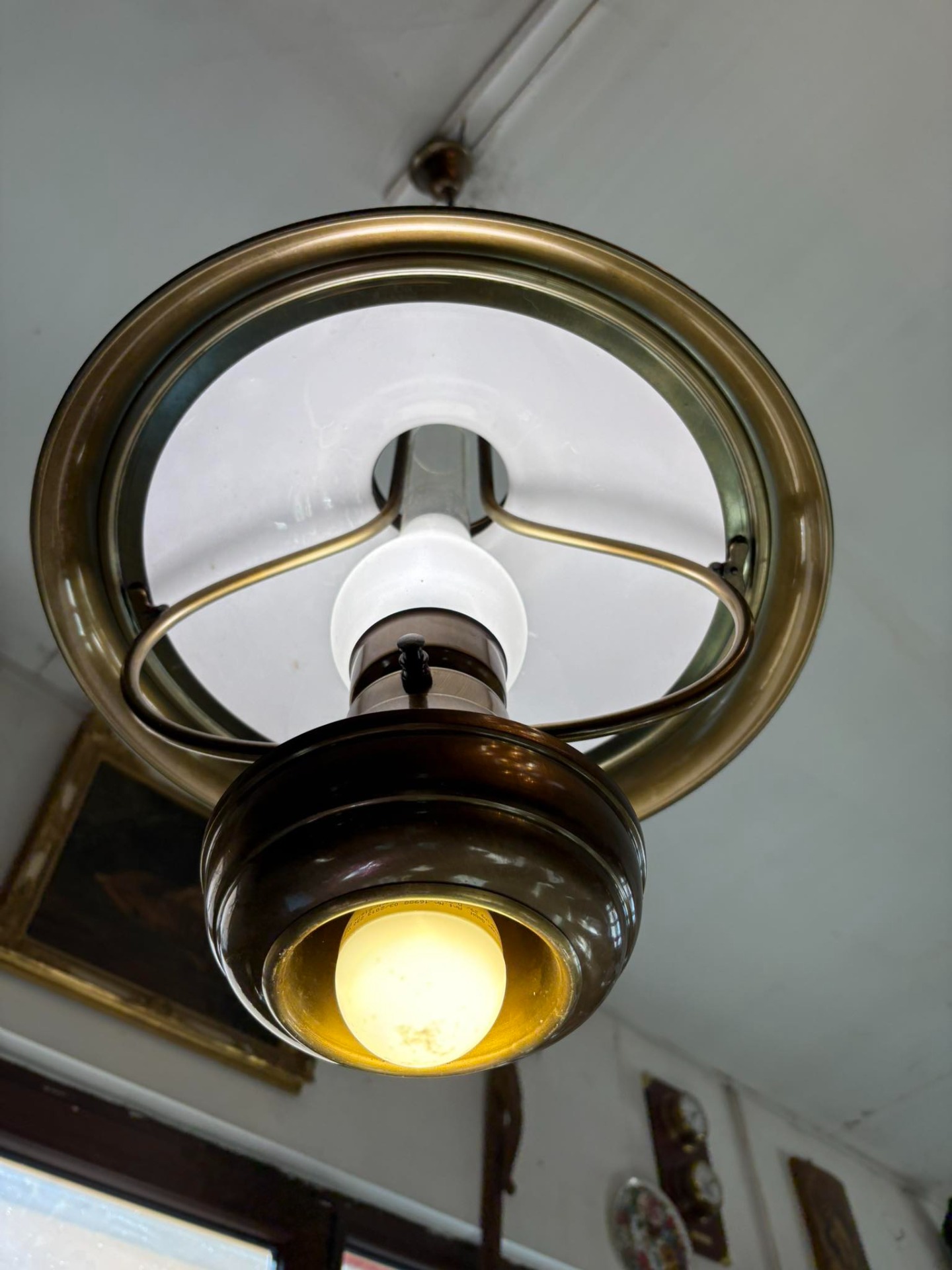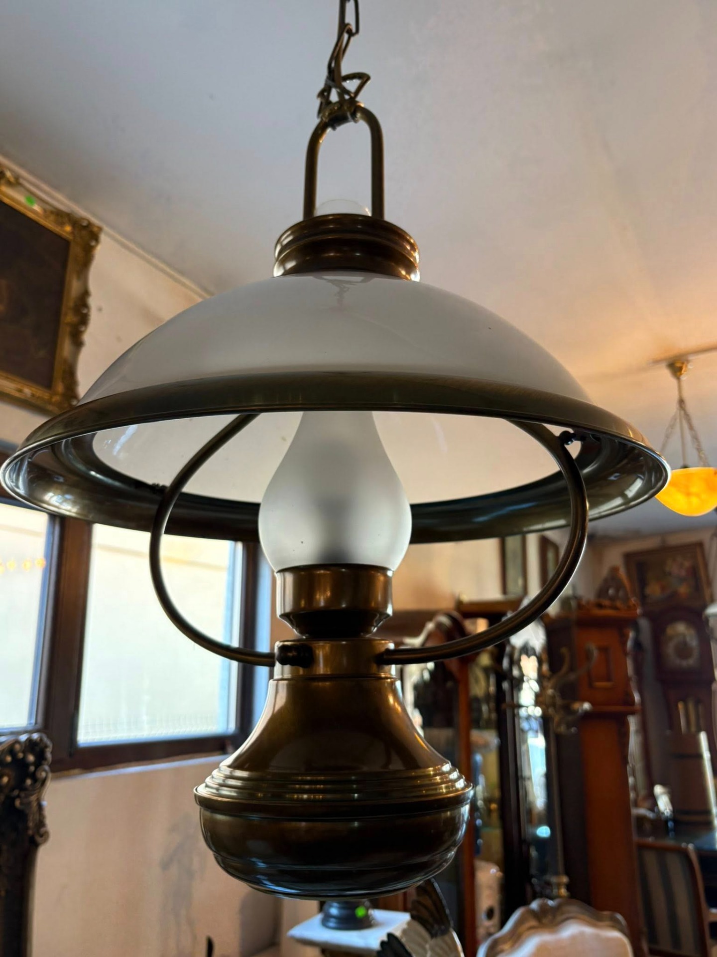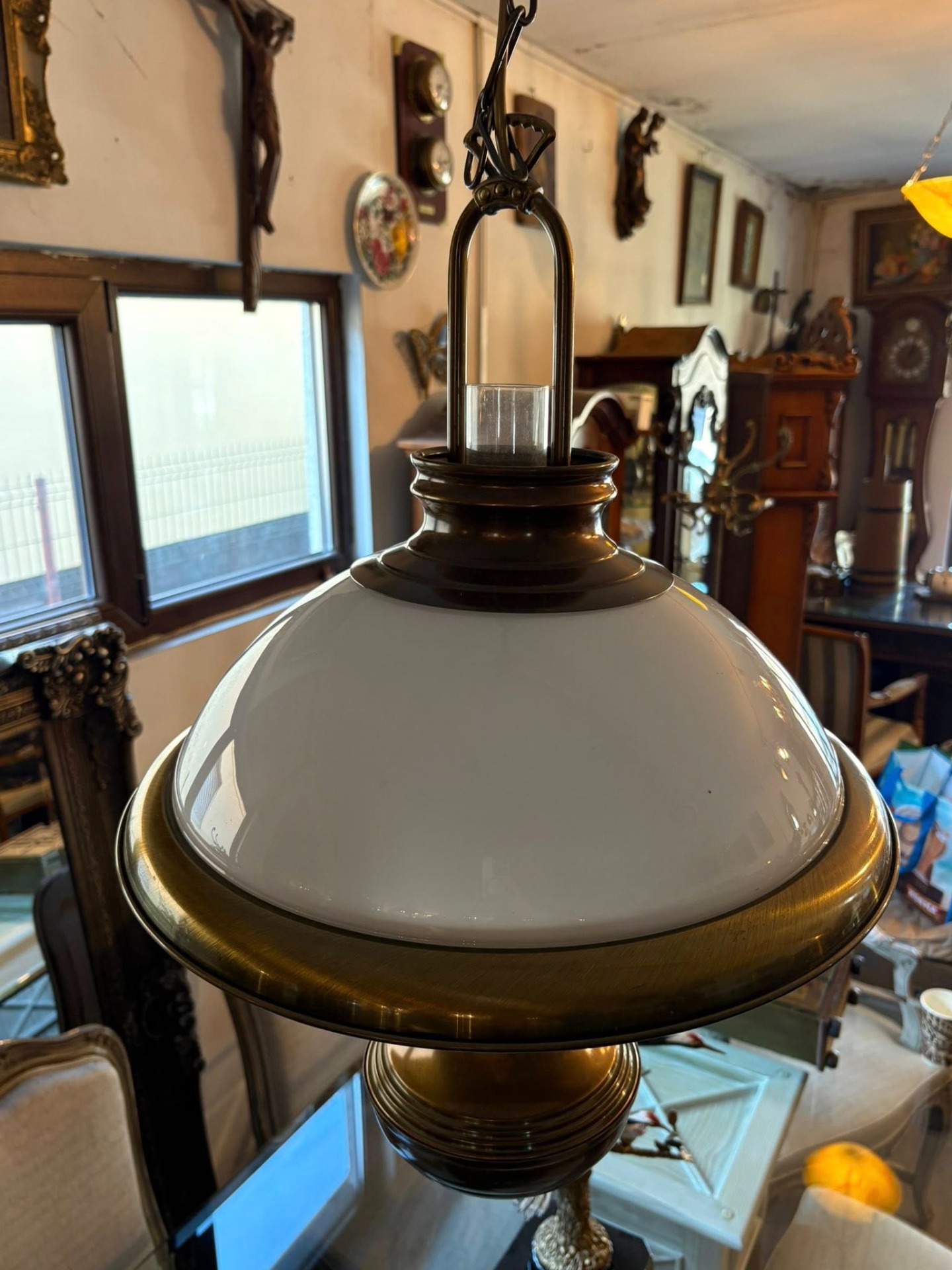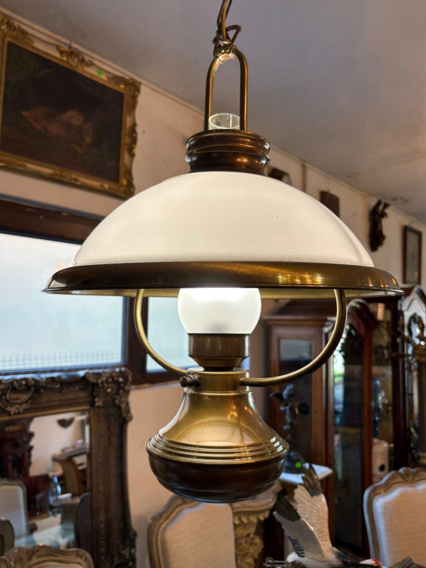 Lustră vintage din alamă cu abajur din sticlă – elegantă și deosebită…suspendată cu design clasic, realizată din alamă masivă și abajur din sticlă opal, perfectă pentru interioare elegante sau decoruri vintage.